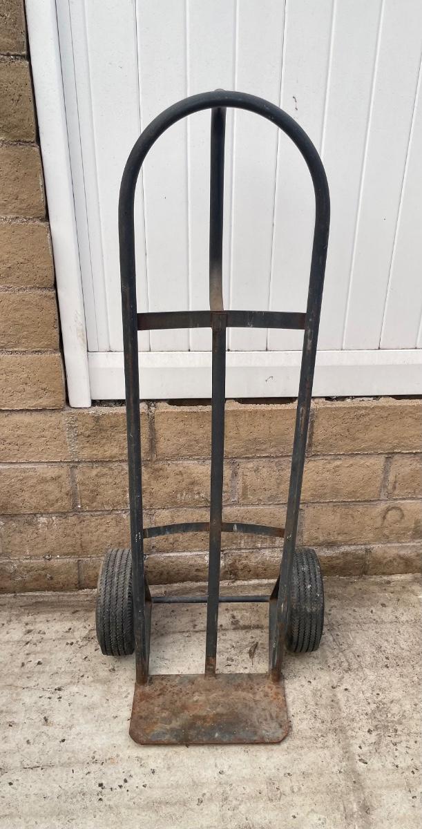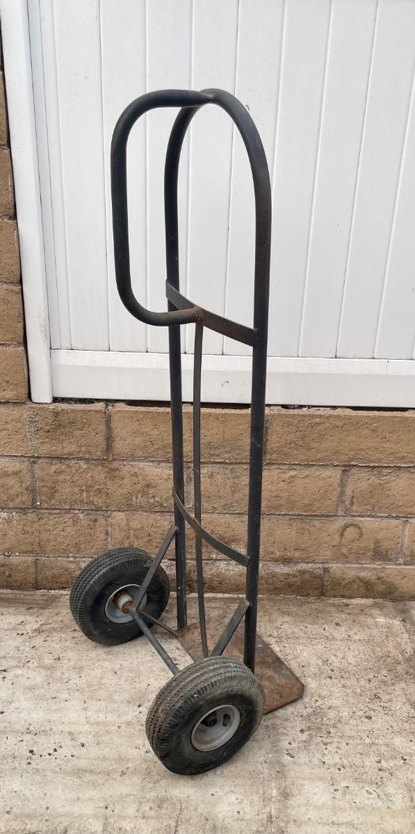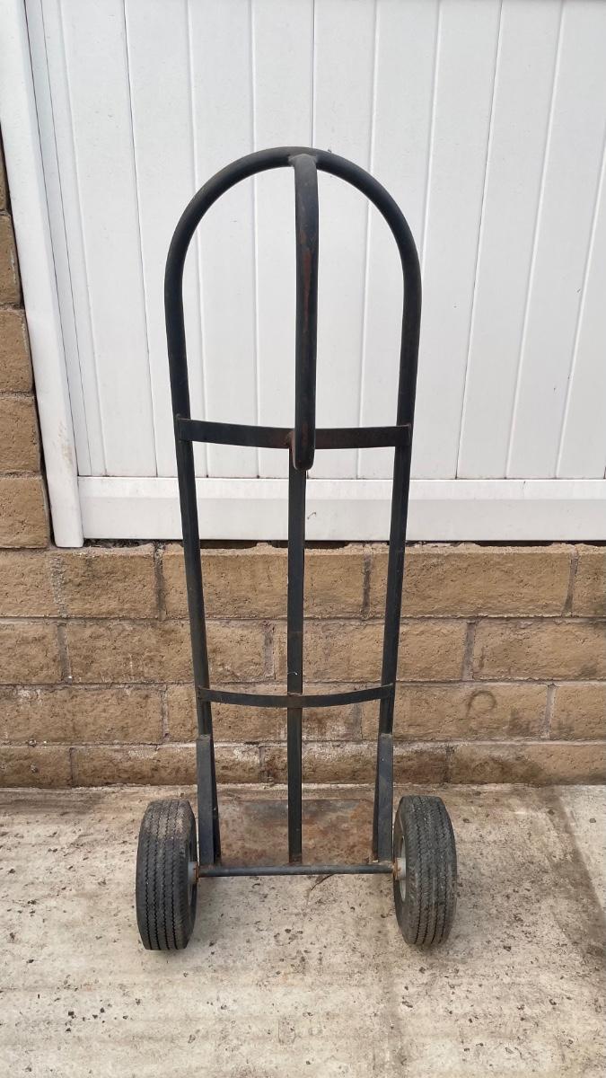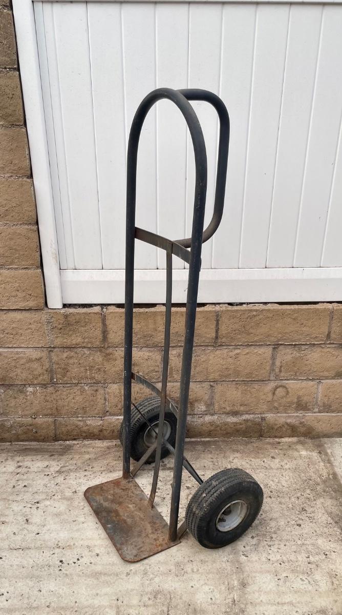 Hand truck with welded steel frame and solid, thick blade for carrying heavy loads. NOTE: pneumatic tubeless tires no longer hold air and need to be replaced.