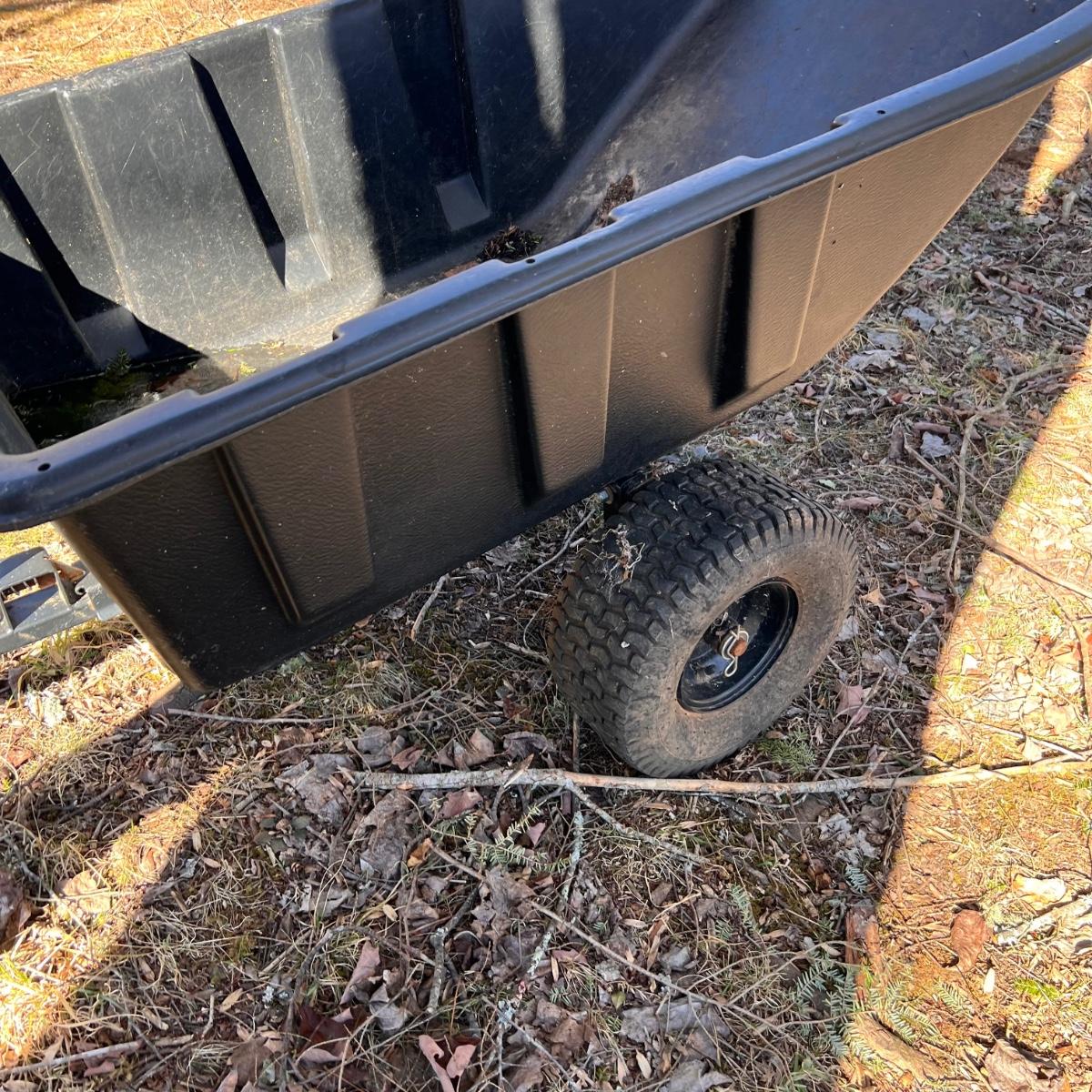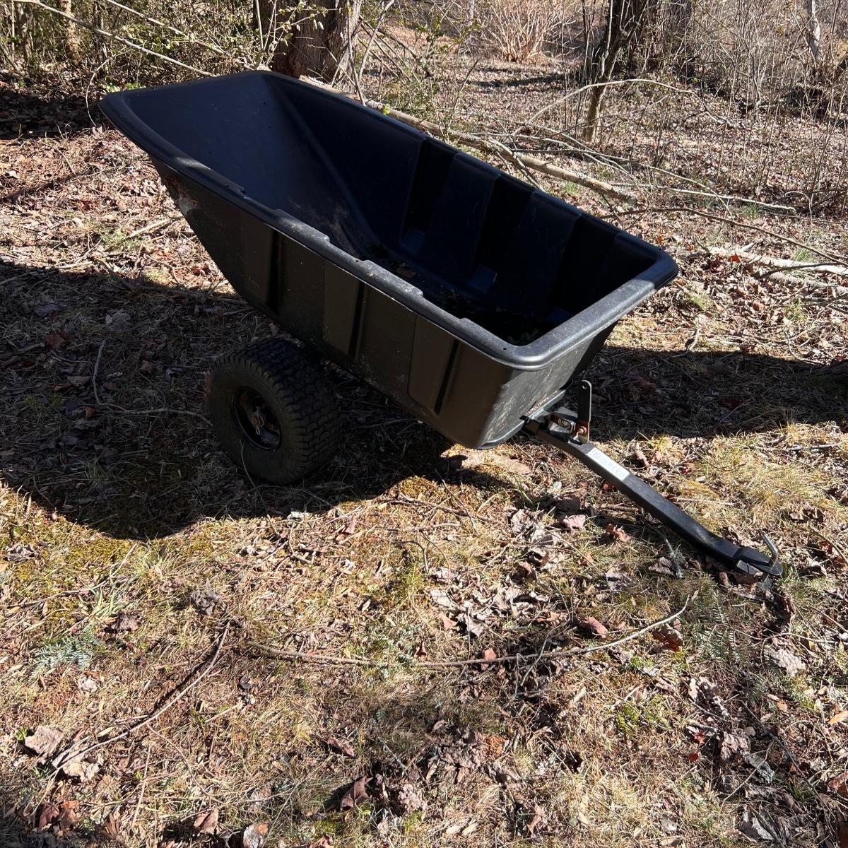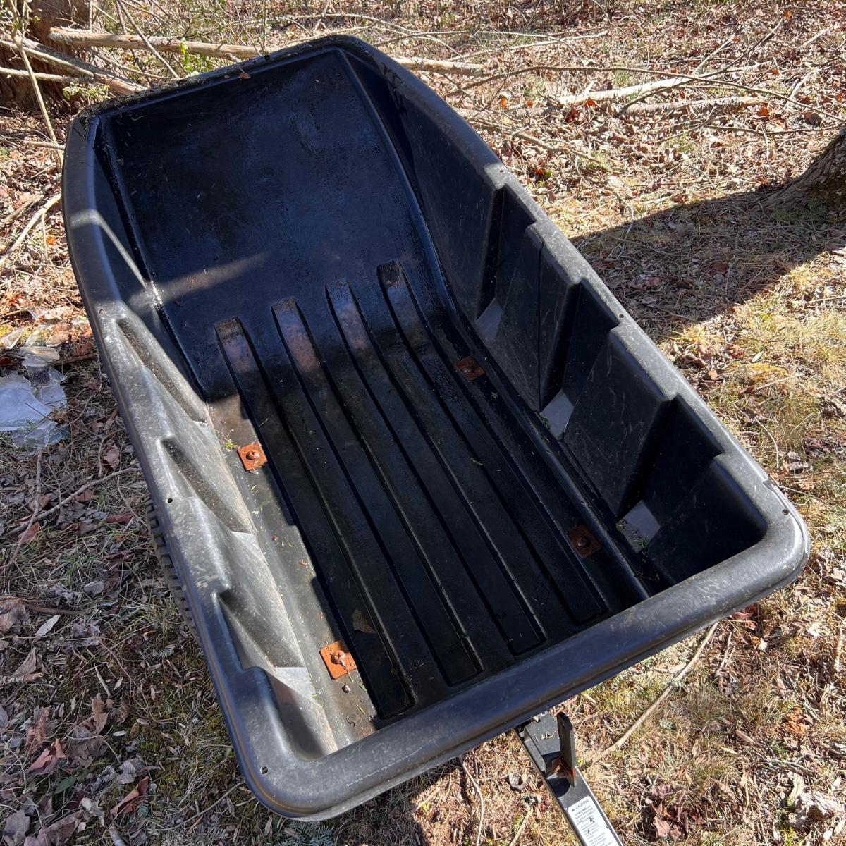 This utility trailer is a pull along with a hitch to attach to your mower. It has a sturdy plastic tub set on a metal frame.