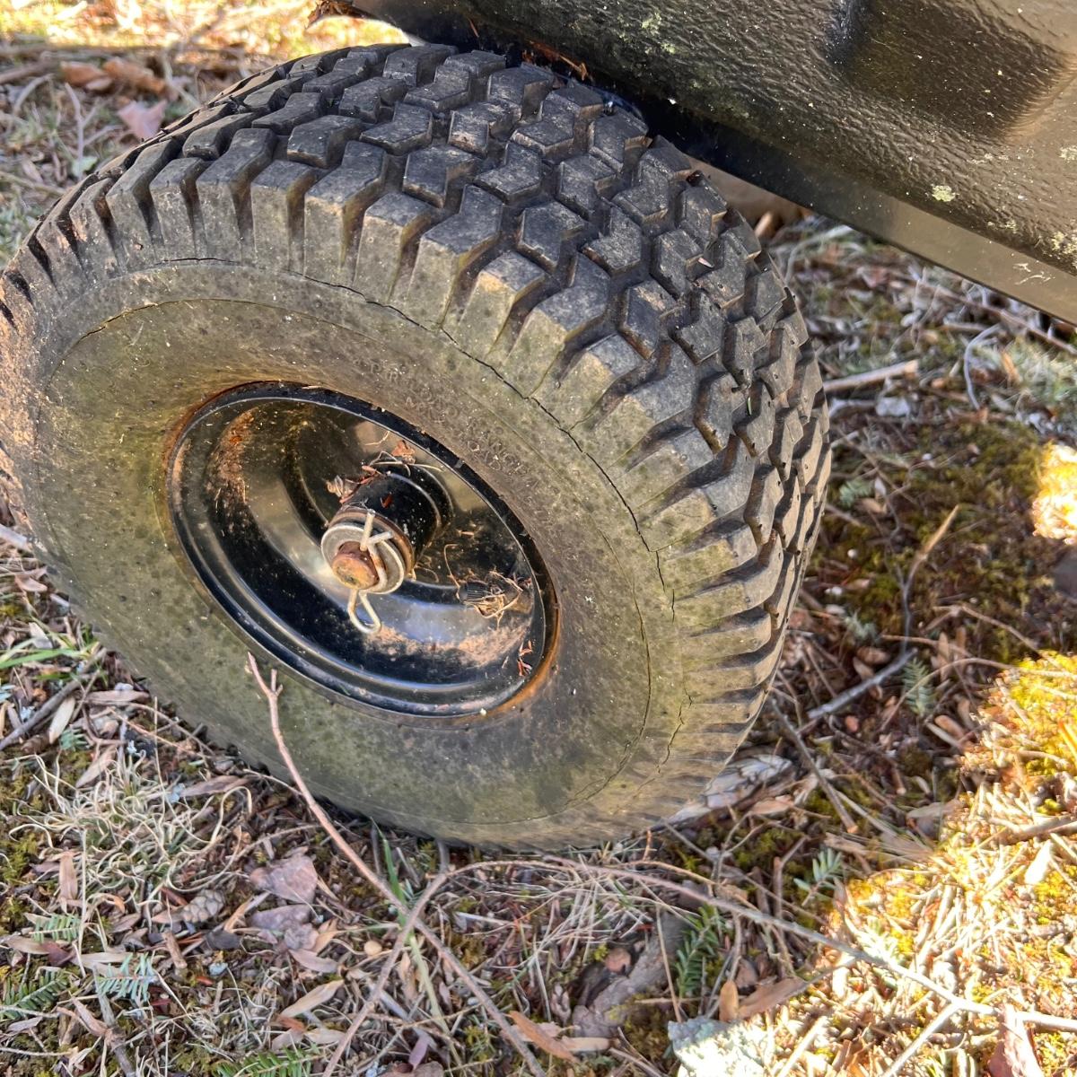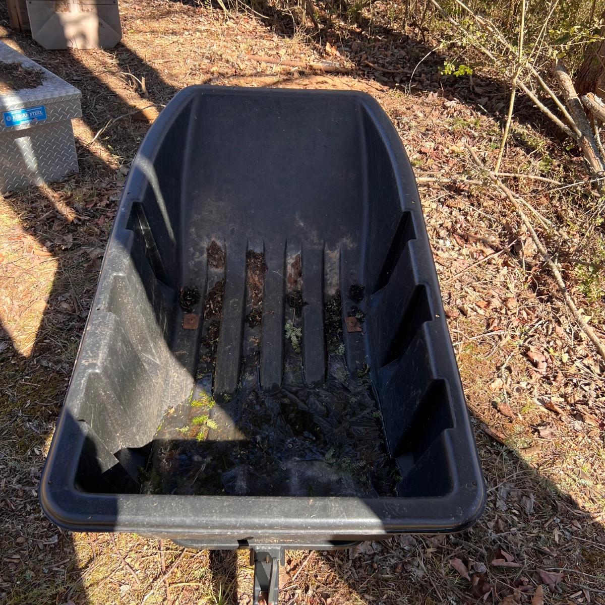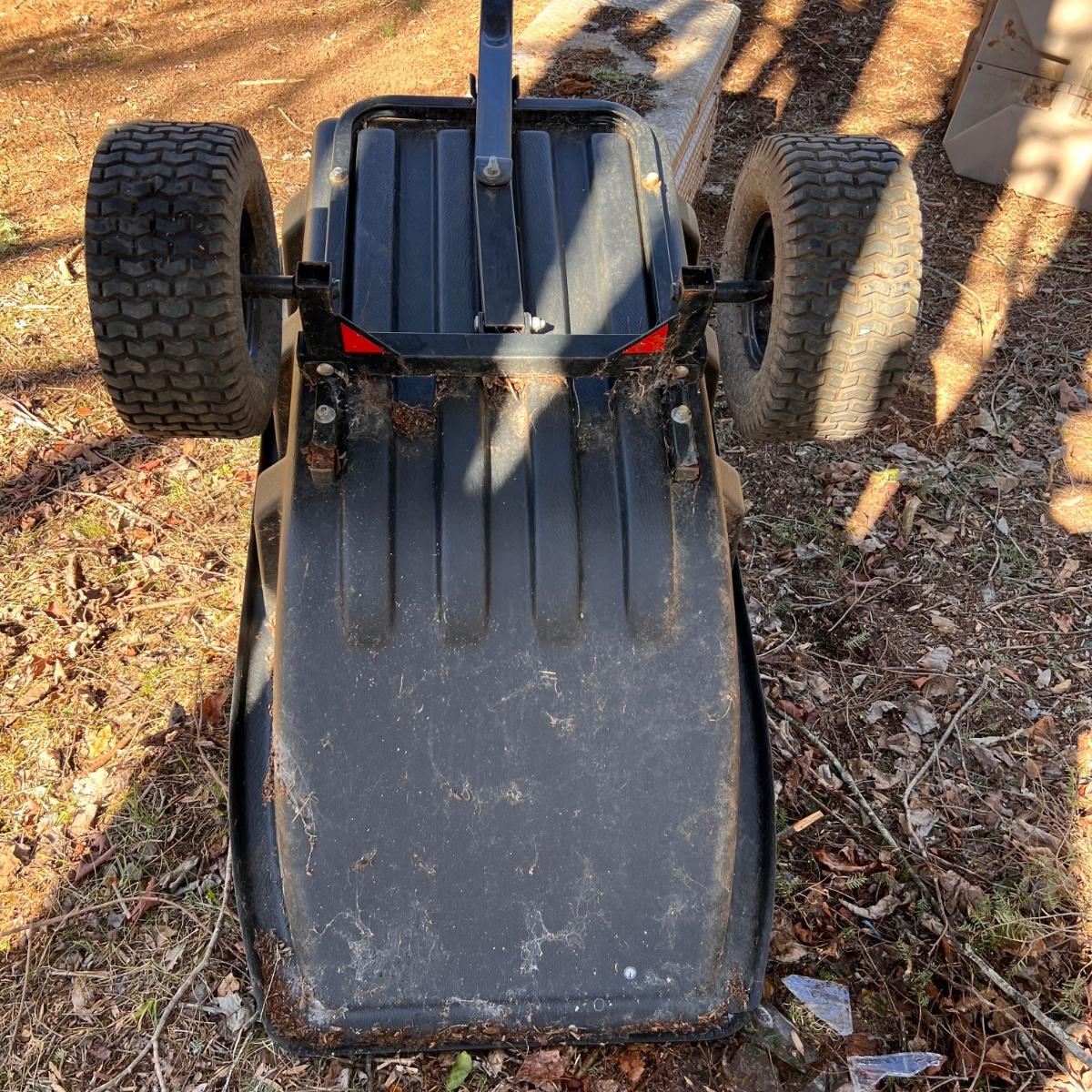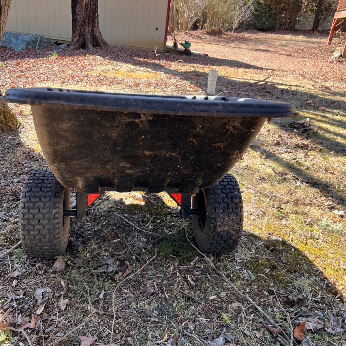 This utility trailer is a pull along with a hitch to attach to your mower. It has a sturdy plastic tub set on a metal frame.