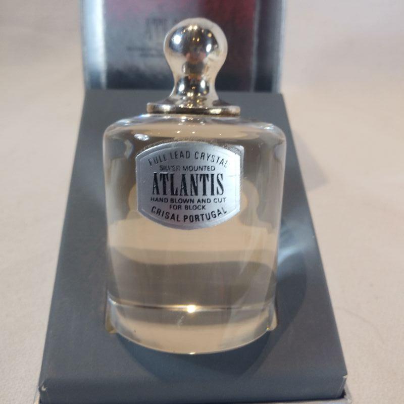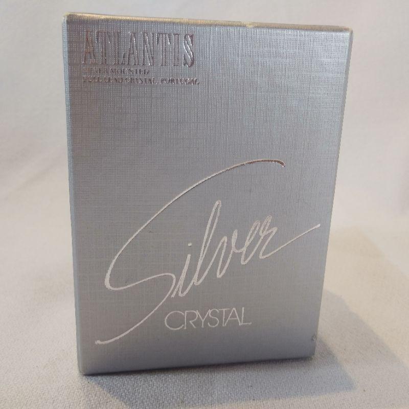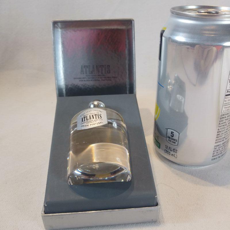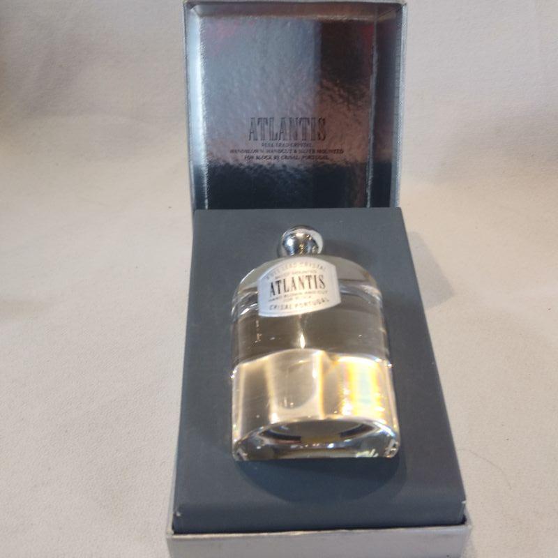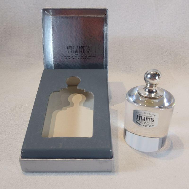 This is a very cool bottle shaped paperweight. It appears unused and it is in it's original box. Made in Portugal of lead crystal and silverplate. Paperweight is 3-inches tall X 1 1/2-inches in diameter. All are in very good condition.