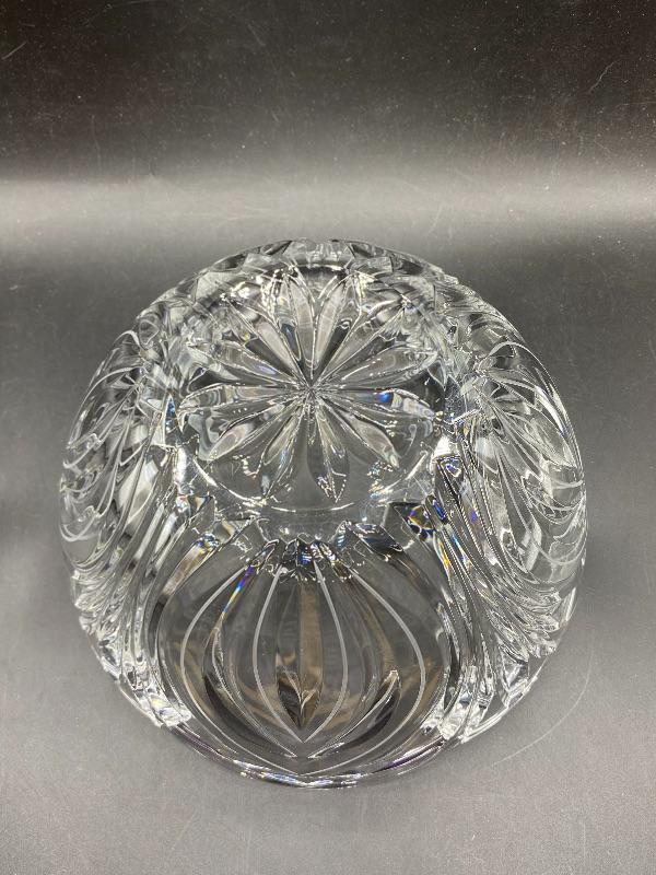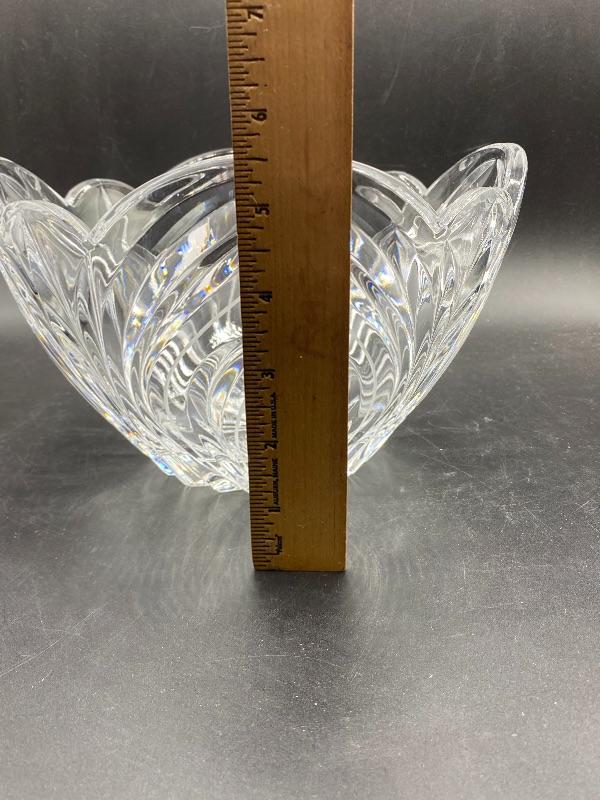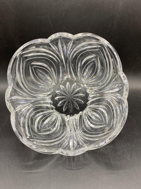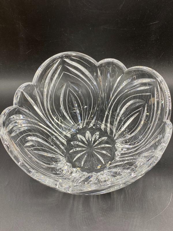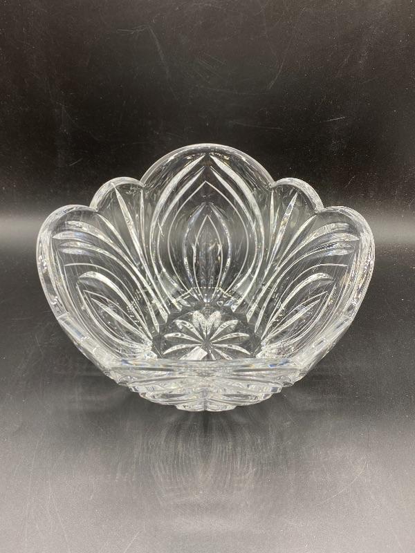 Beautiful heavy lead crystal bowl. Scalloped edge and cut design give it a simple yet elegant design, great in any decor space. Use as a serving bowl, fruit bowl, or just as a statement piece. Measures about 9" across and 6" tall. No chips.