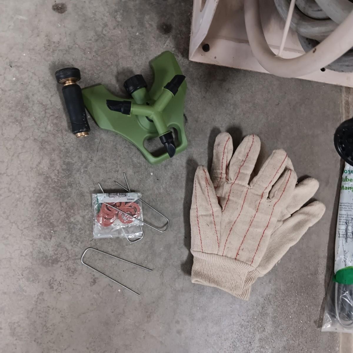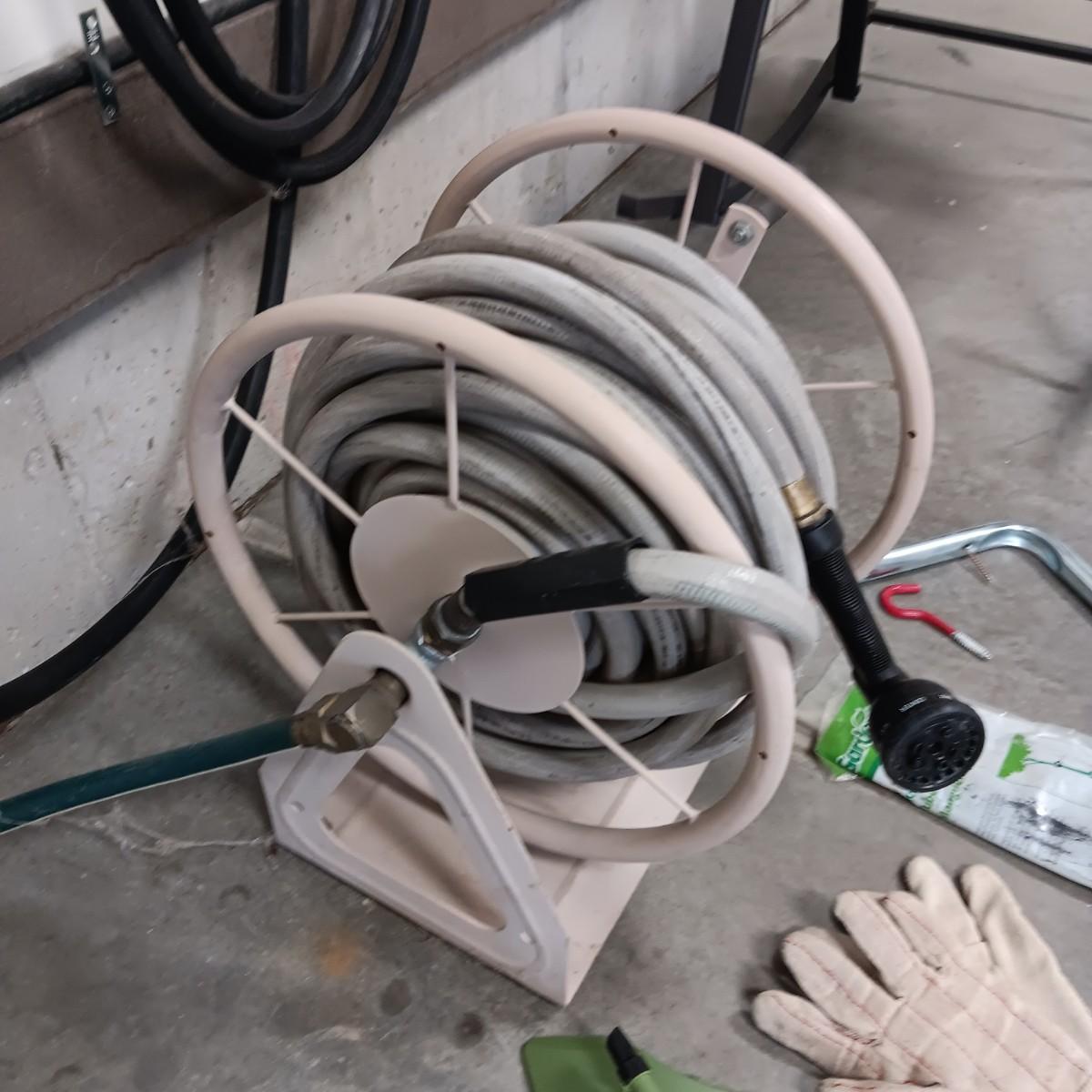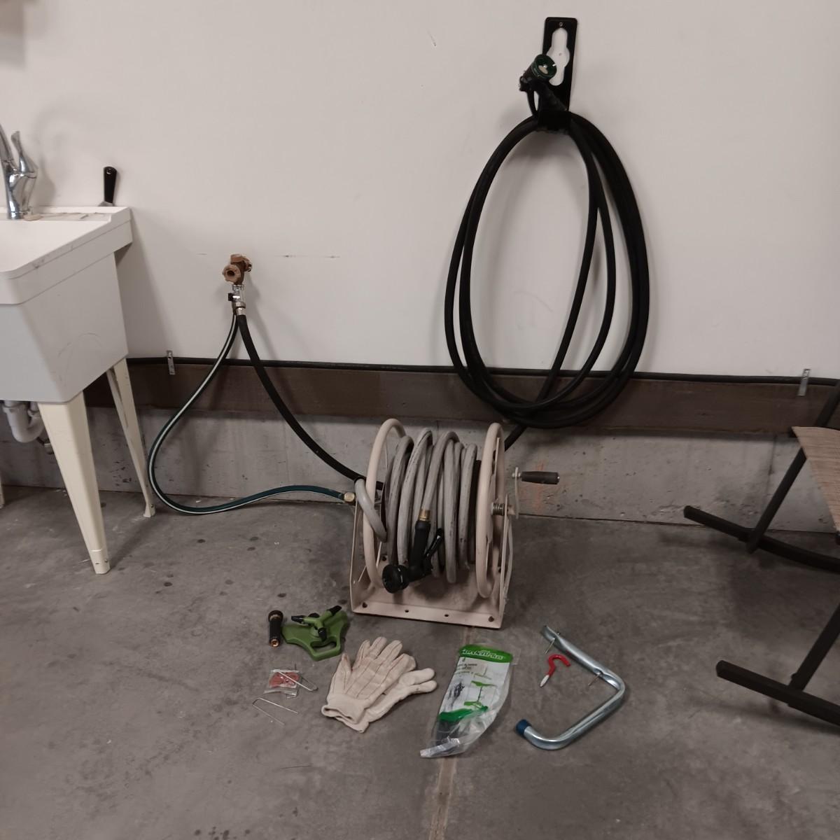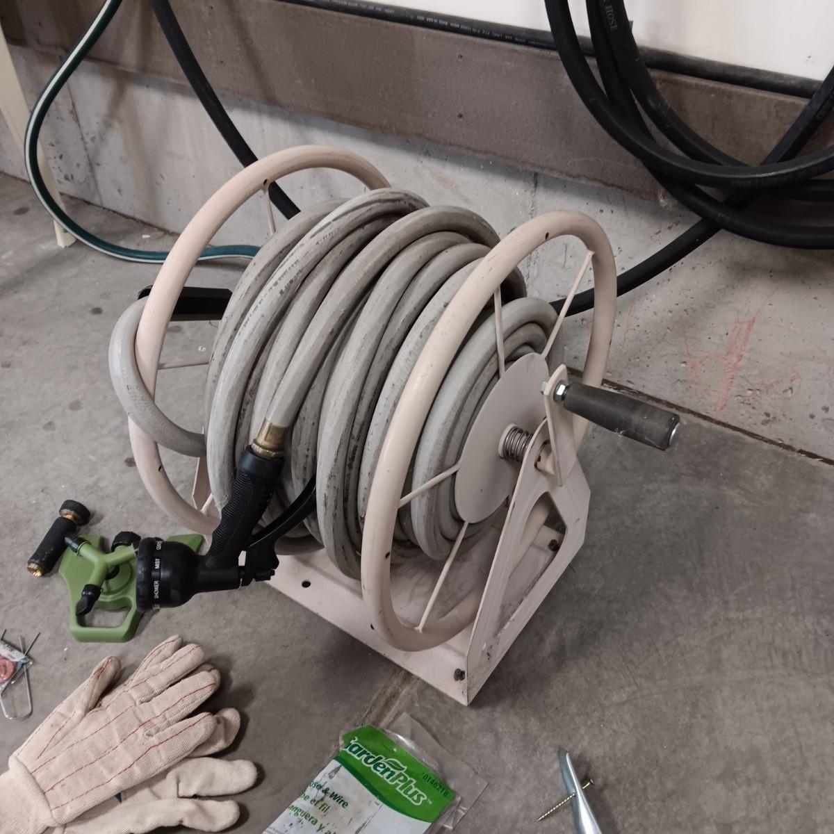 HEAVY METAL HOSE REEL, GARDEN HOSES, SPRAYERS AND MORE