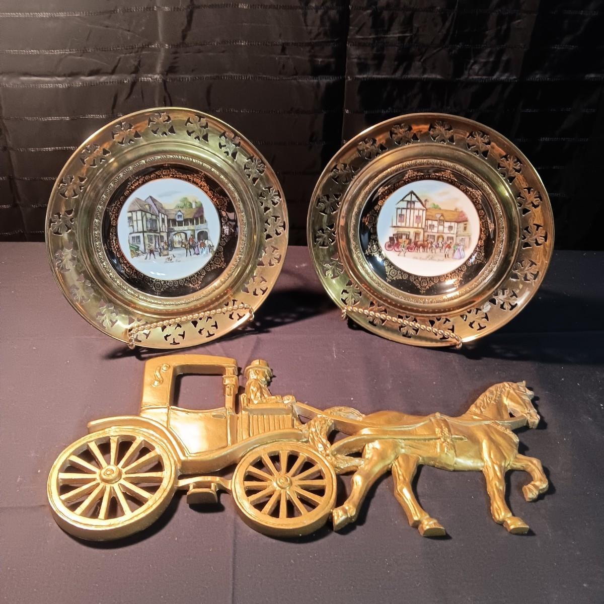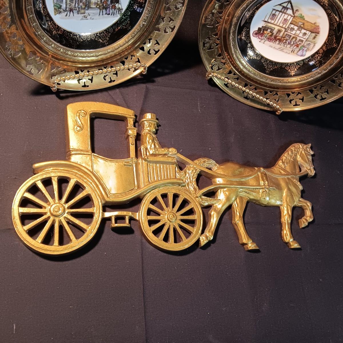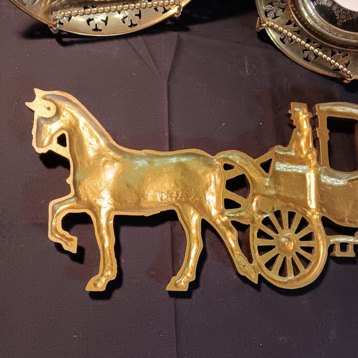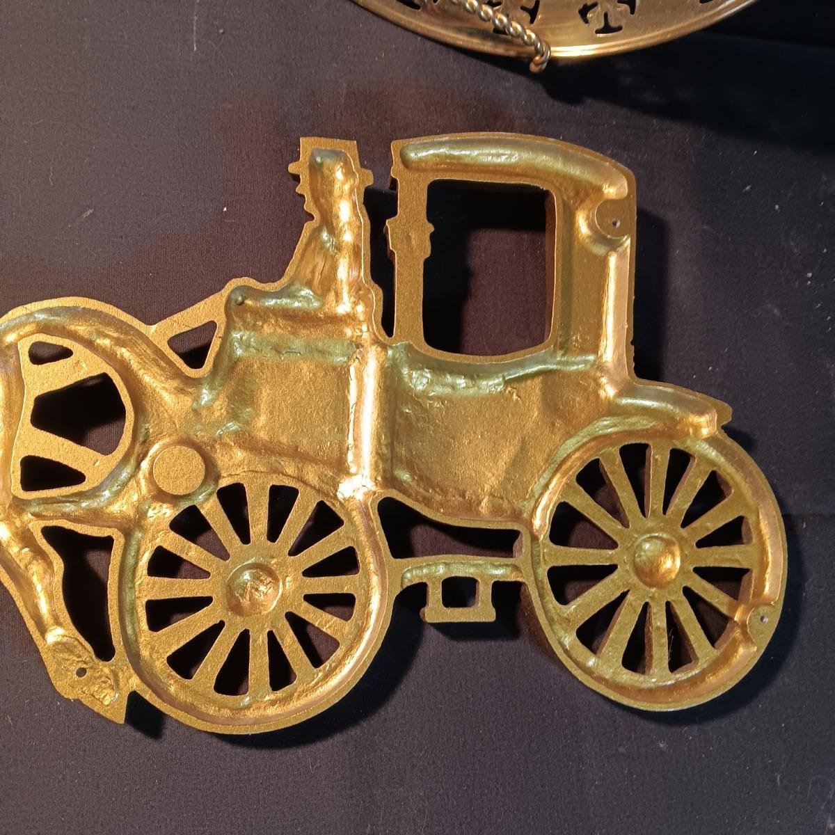 HEAVY METAL WALL HUNG CARRIAGE AND 2 REGENCY PLATES IN BRASS FRAME