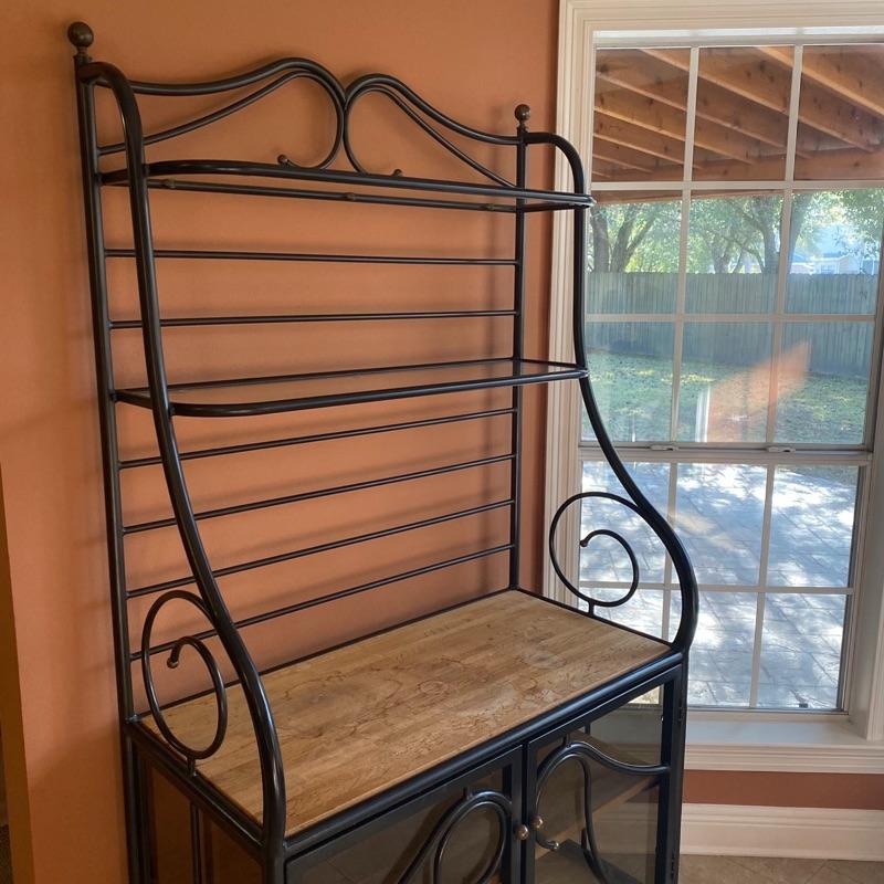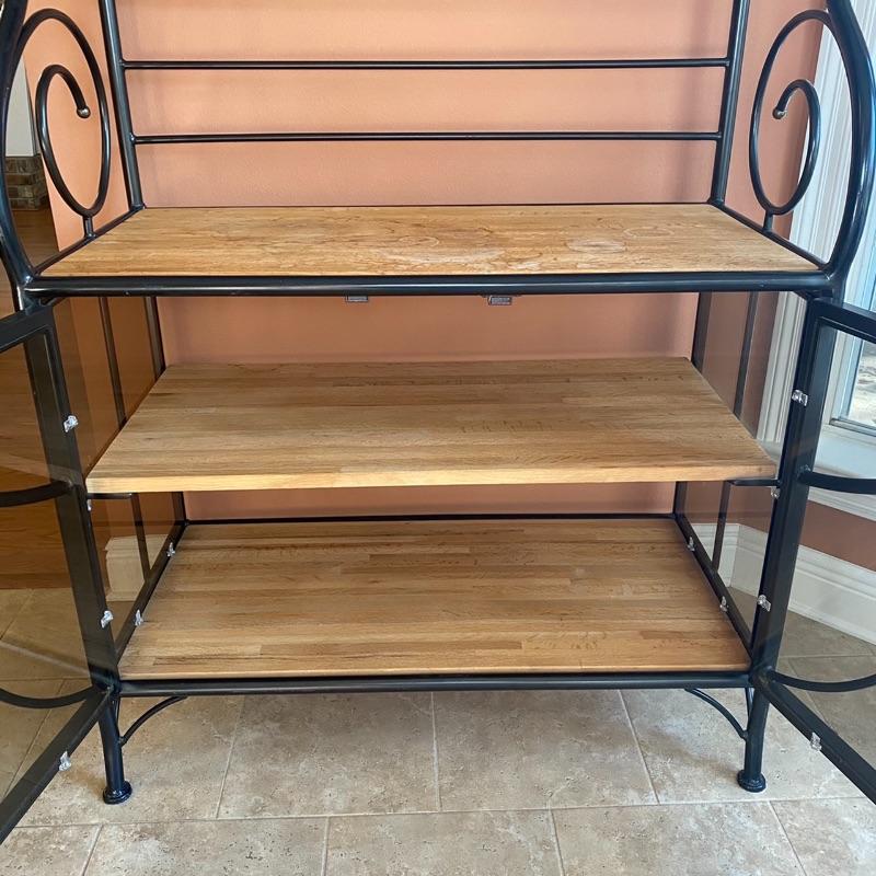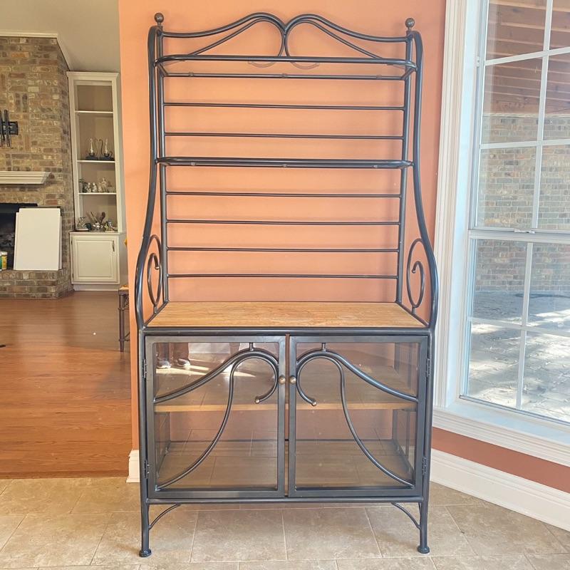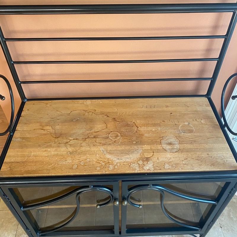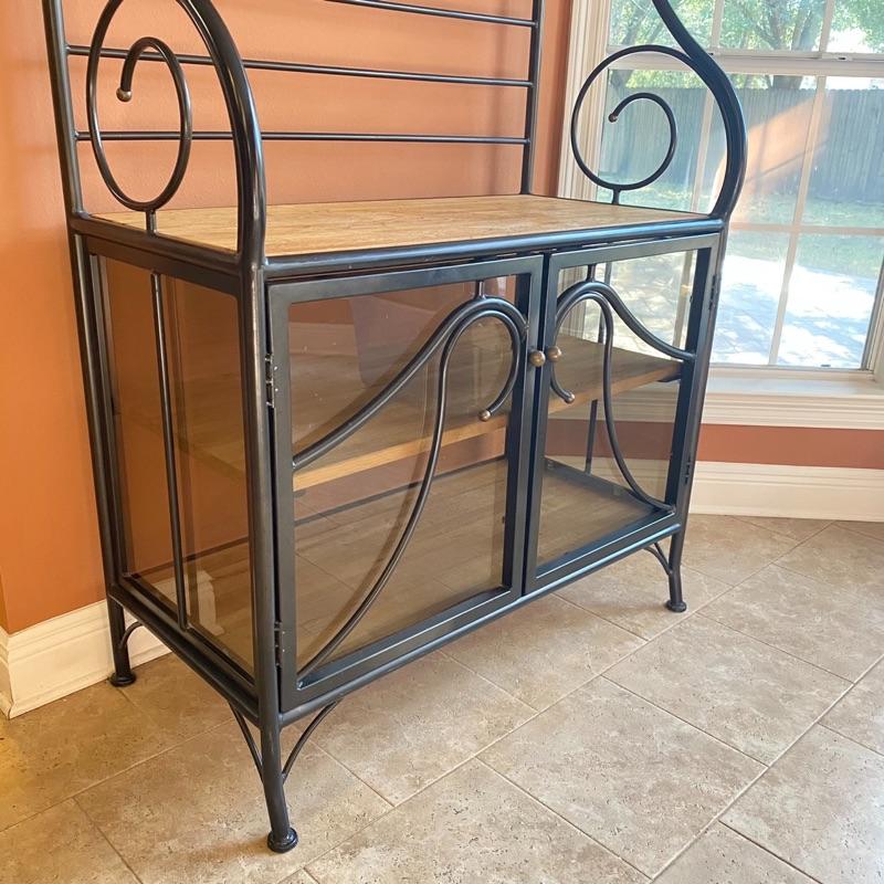 77” H x 40” W x 20”D / Glass Doors / 2 Glass Shelves / Water Rings on Top Wood, Needs refinishing or painting - see photo