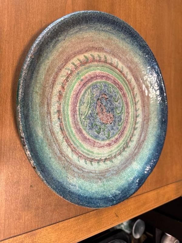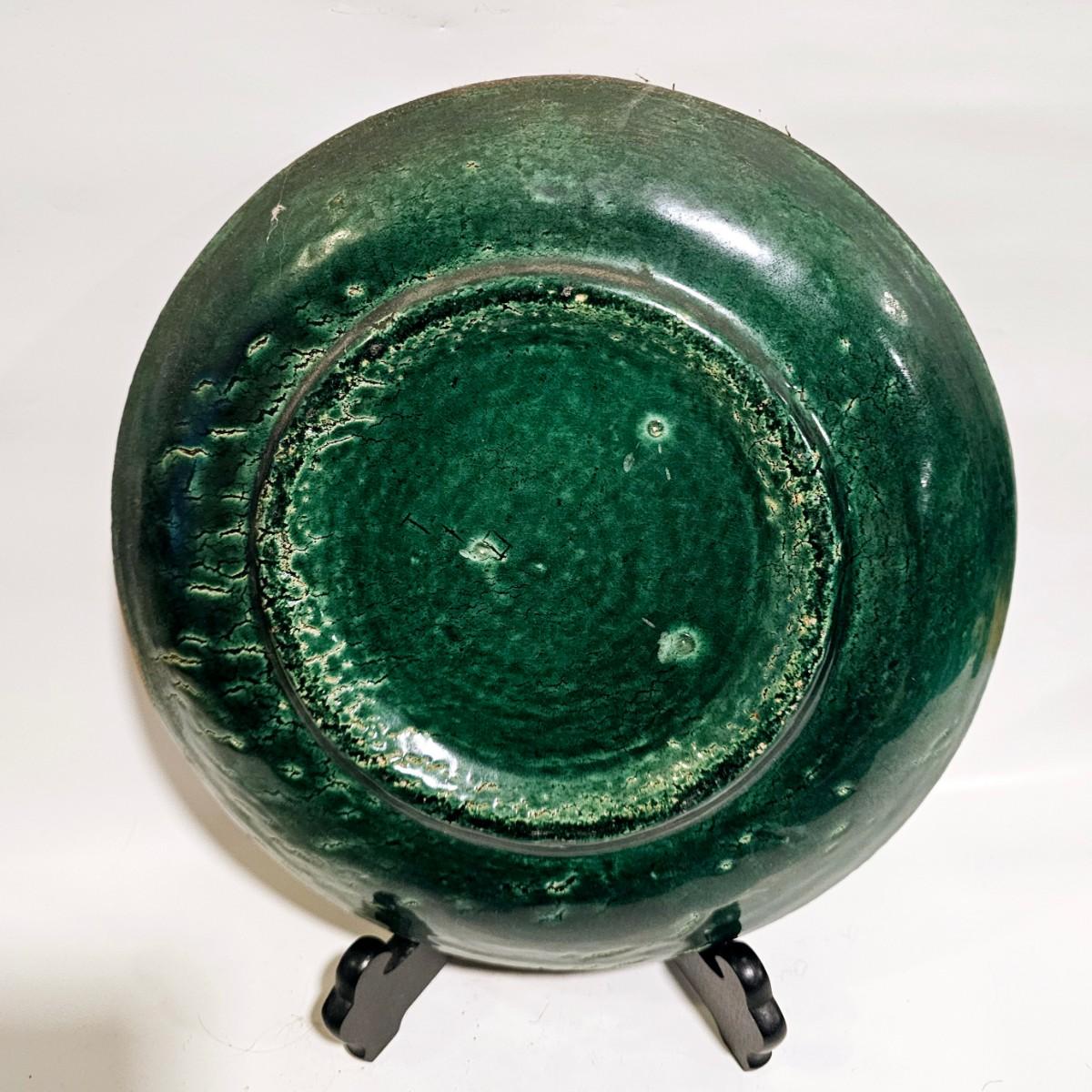 Extremely heavy platter with dark green glaze looks to be very old but needs a proper appraisal and verification of date and time created. Handcrafted and painted with clear indications of somewhat primitive methods potentially significant to age of this bowl like platter.