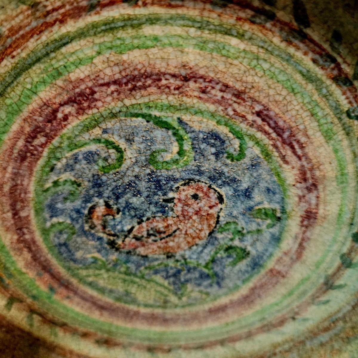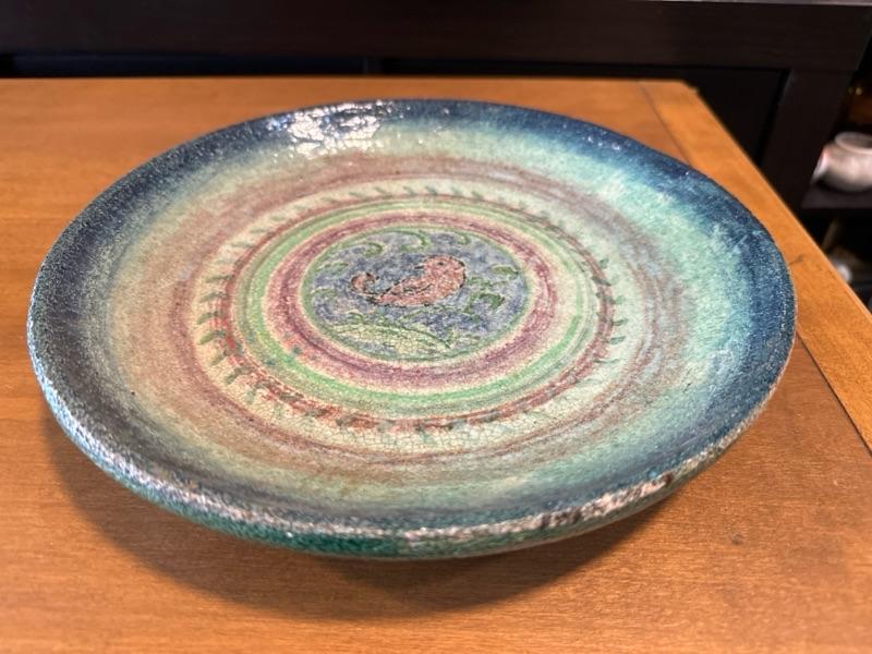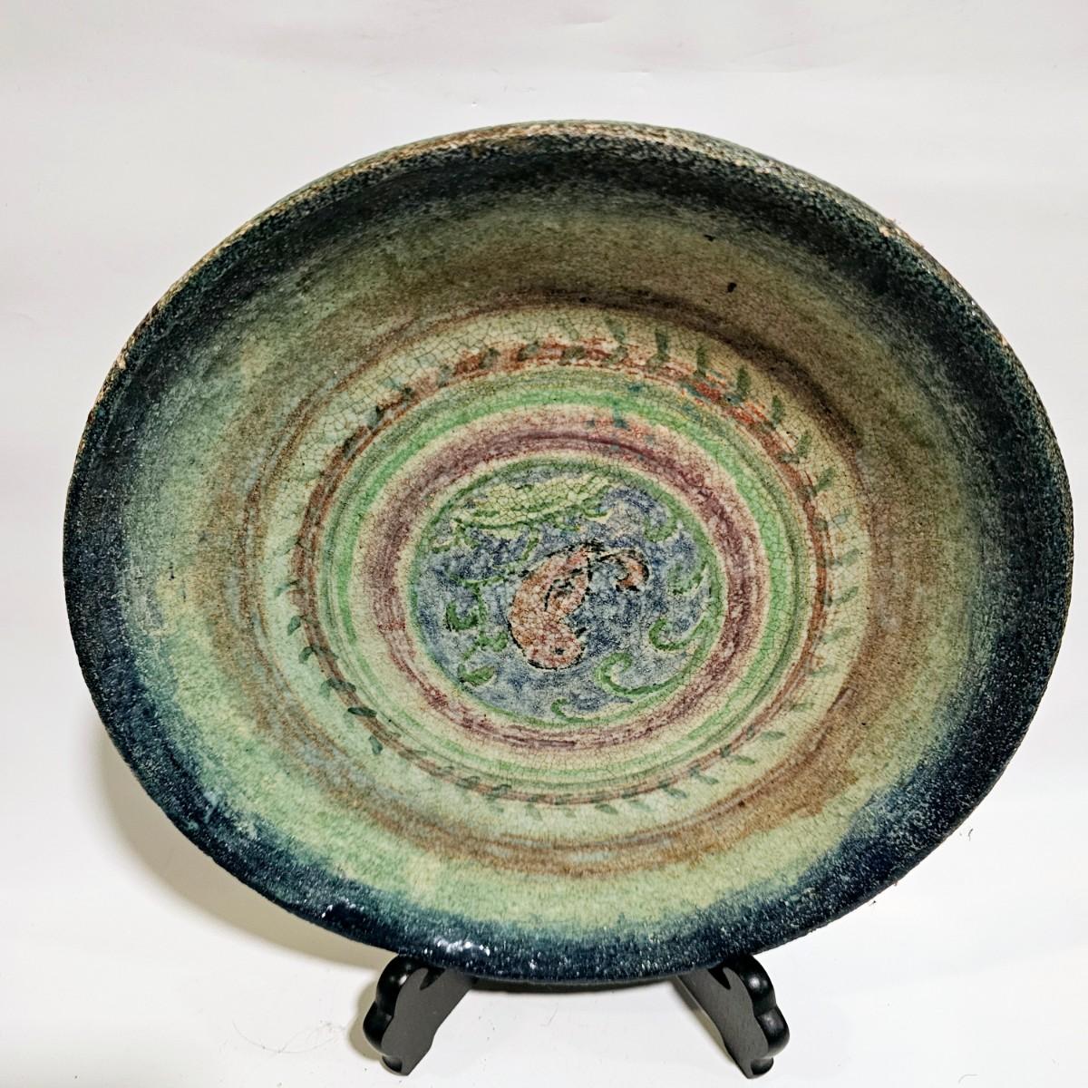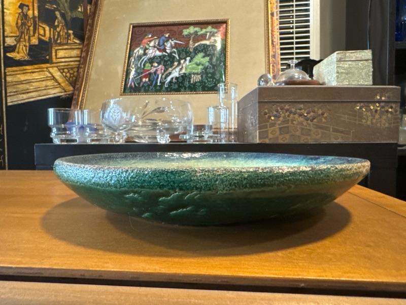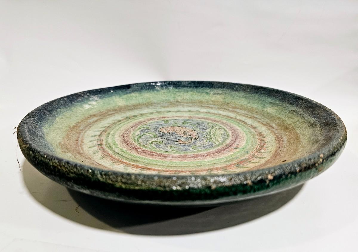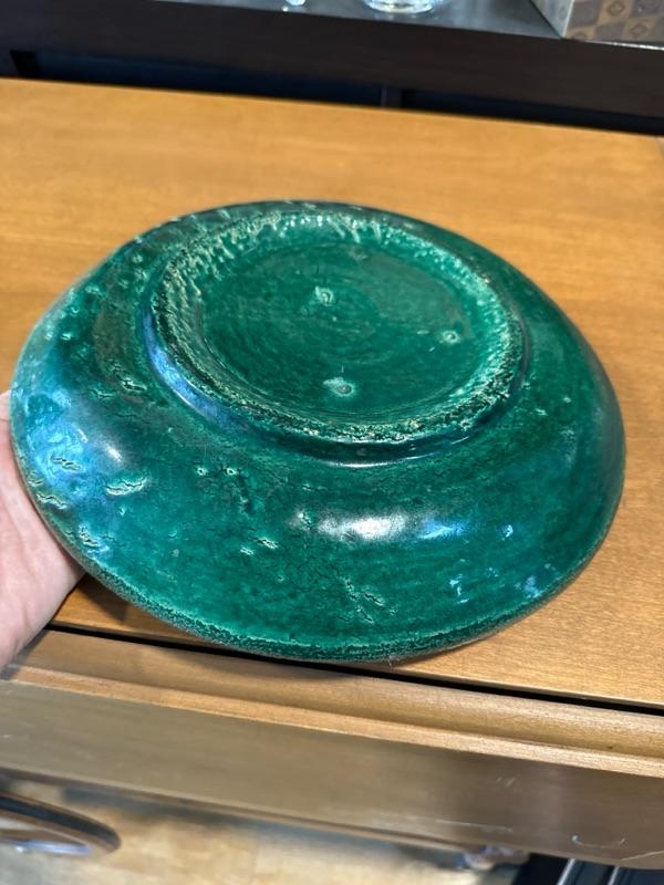 Extremely heavy platter with dark green glaze looks to be very old but needs a proper appraisal and verification of date and time created. Handcrafted and painted with clear indications of somewhat primitive methods potentially significant to age of this bowl like platter.