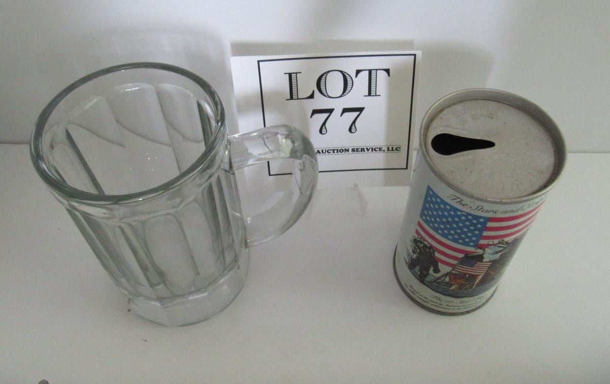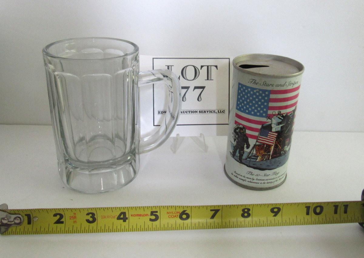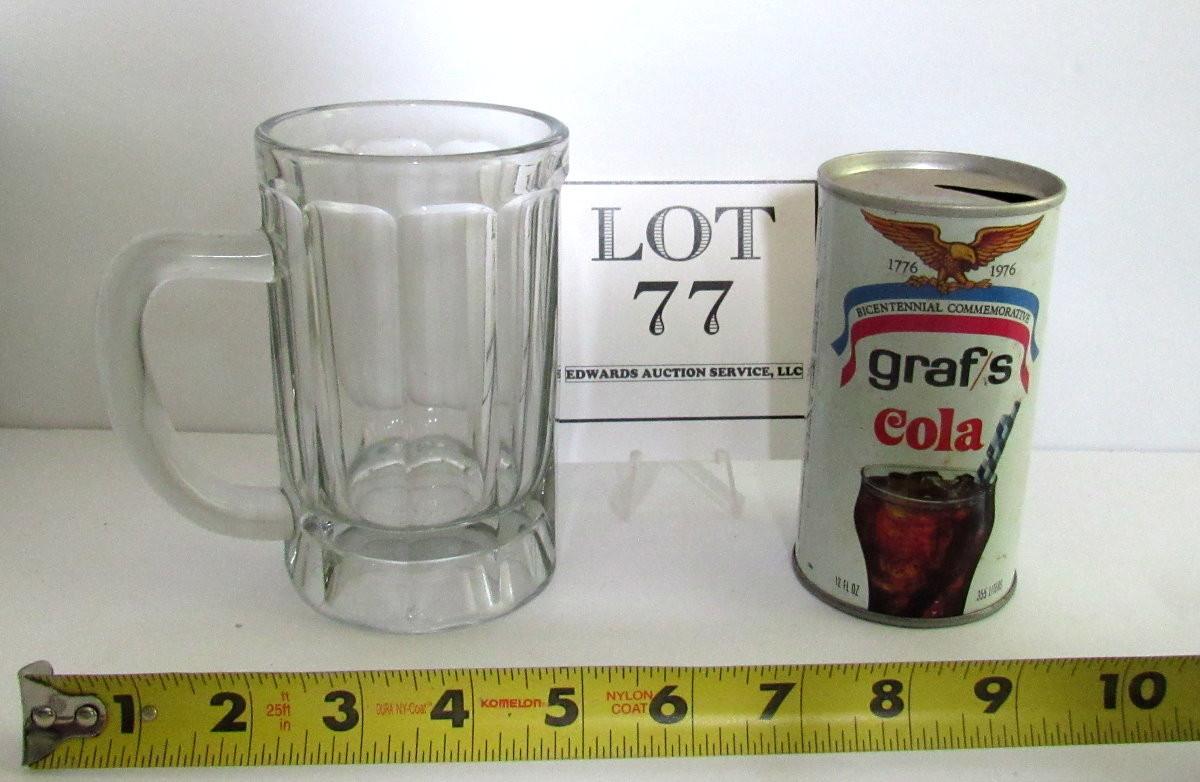 Heavy Old Glass Beer Mug and Graf Cola Bicentennial Can With Moon Landing Back