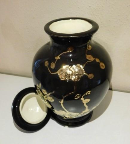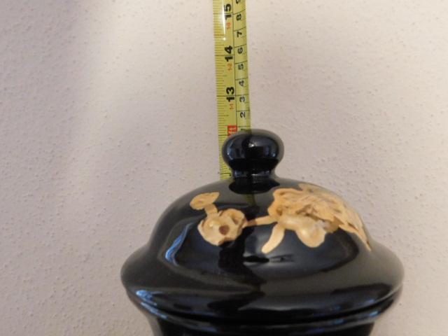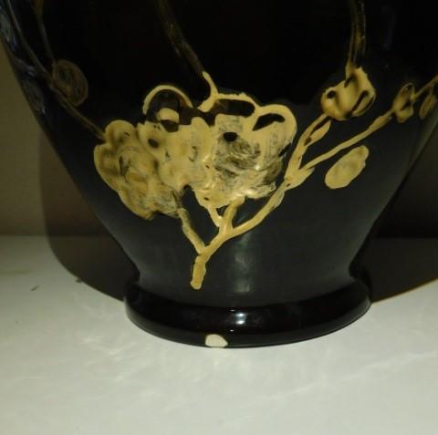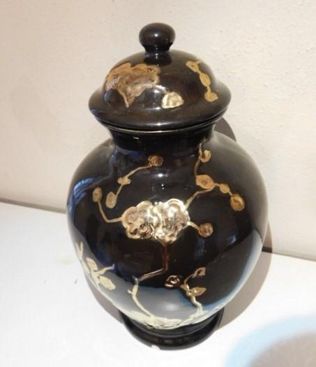 Heavy Pottery Painted Ginger Jar has nick from base on front and back as shown. Easy to hide with black glaze. This piece is impressively heavy and rich with color.