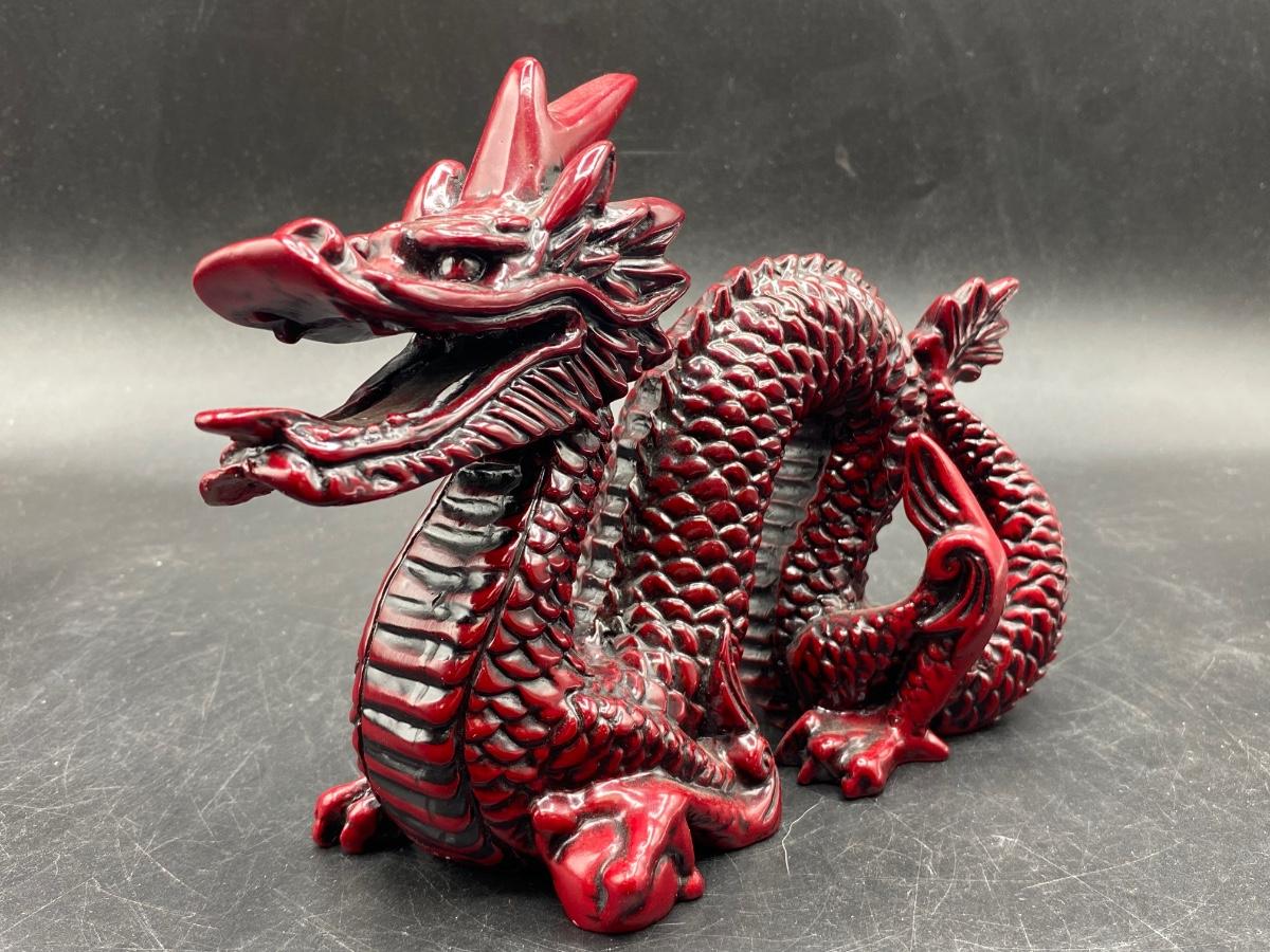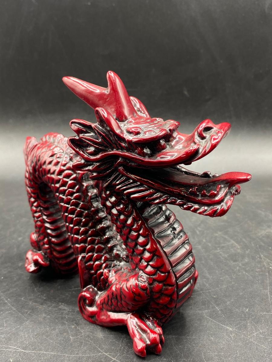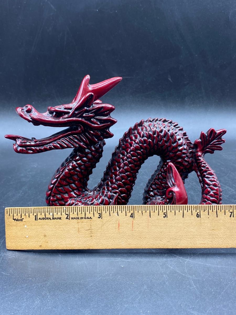 Dark rad Chinese style dragon figurine. Heavy, made from resin. In good condition. About 7" length.