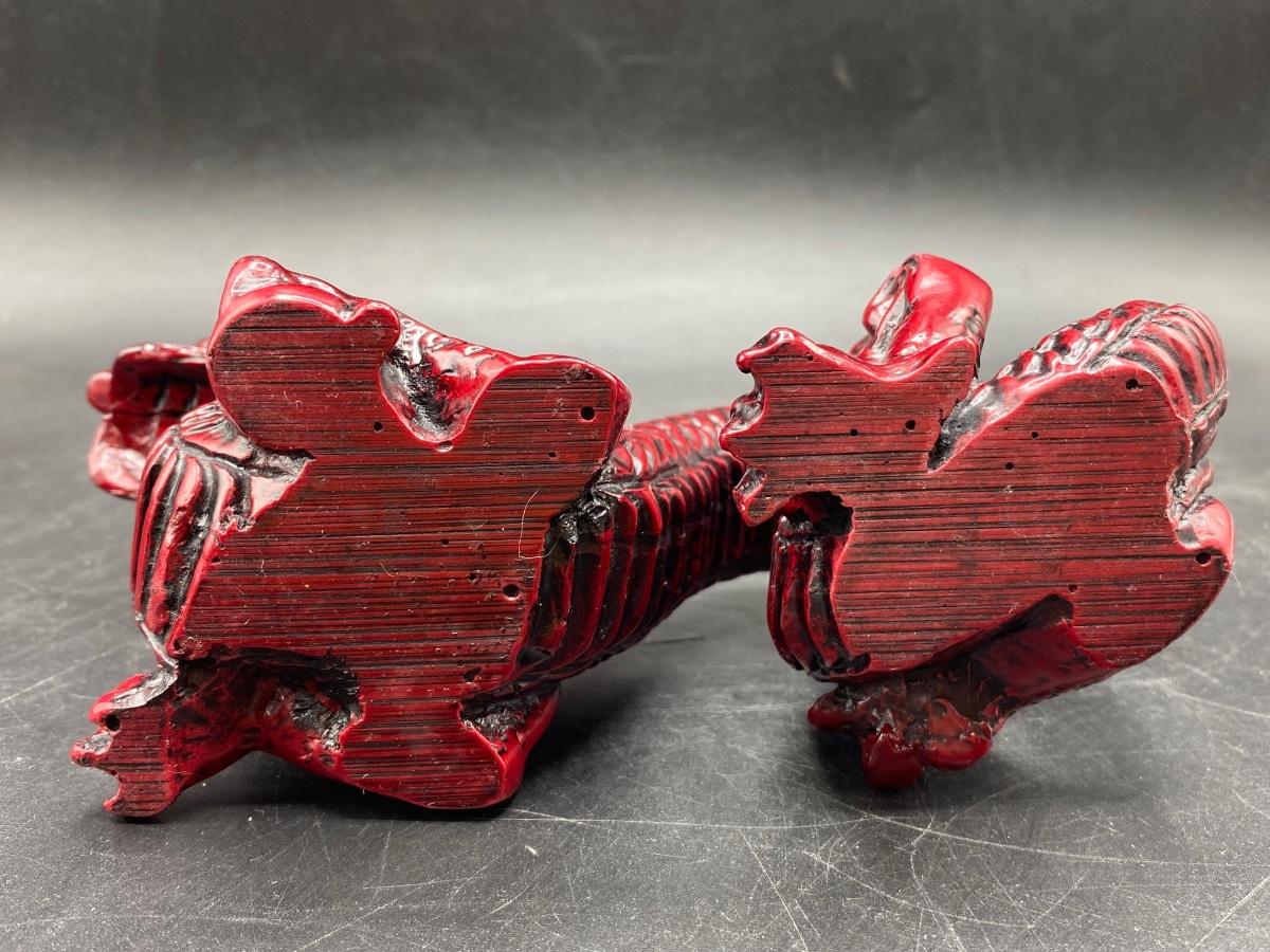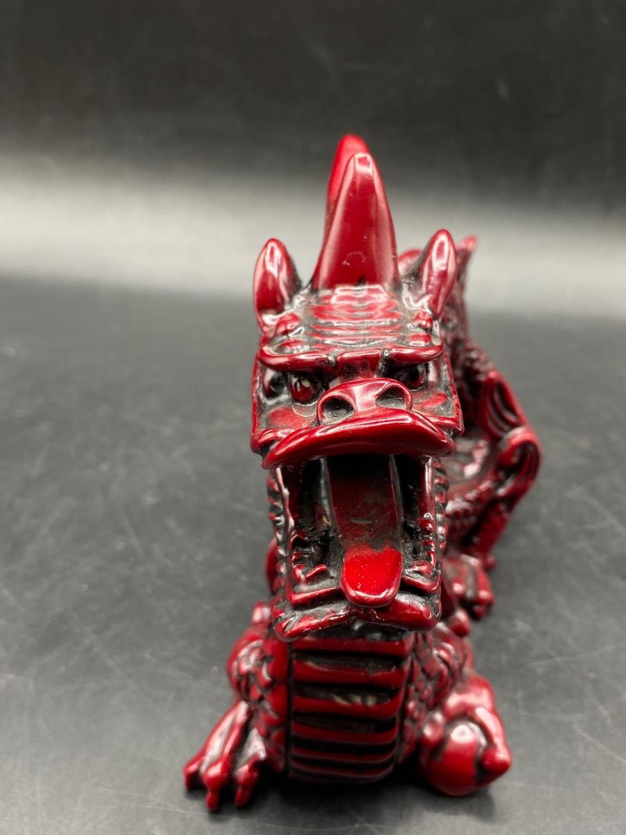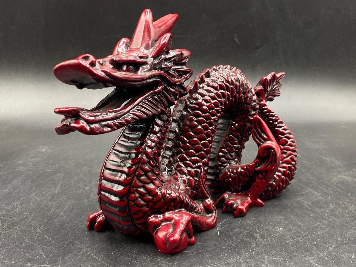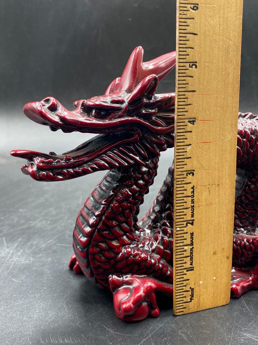 Dark rad Chinese style dragon figurine. Heavy, made from resin. In good condition. About 7" length.