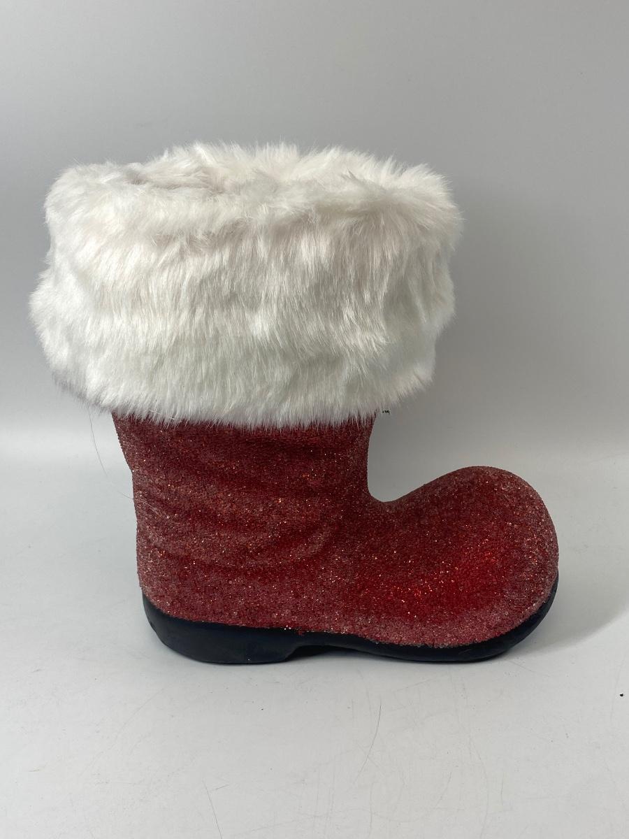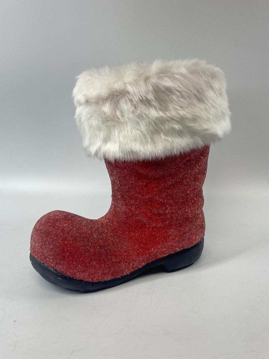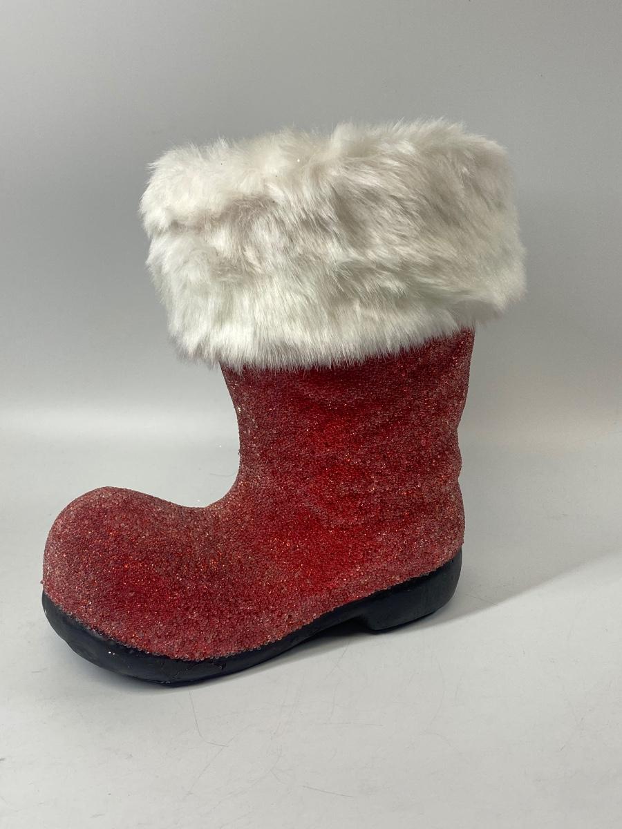 Heavy faux fur trimmed Santa boot. Could be used as a planter or a door stop, very heavy.