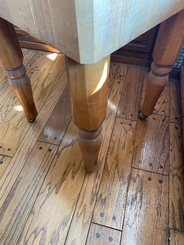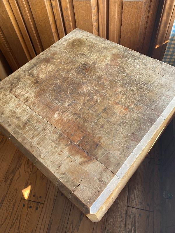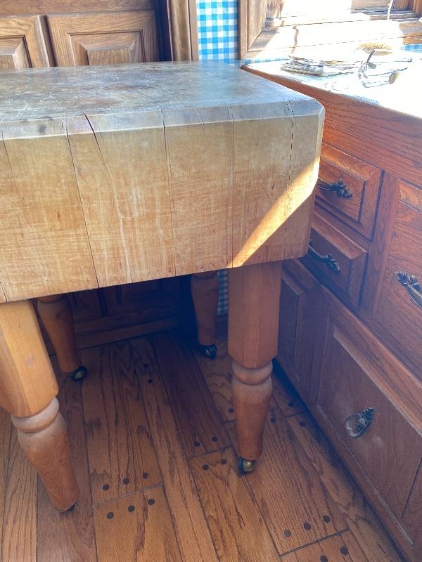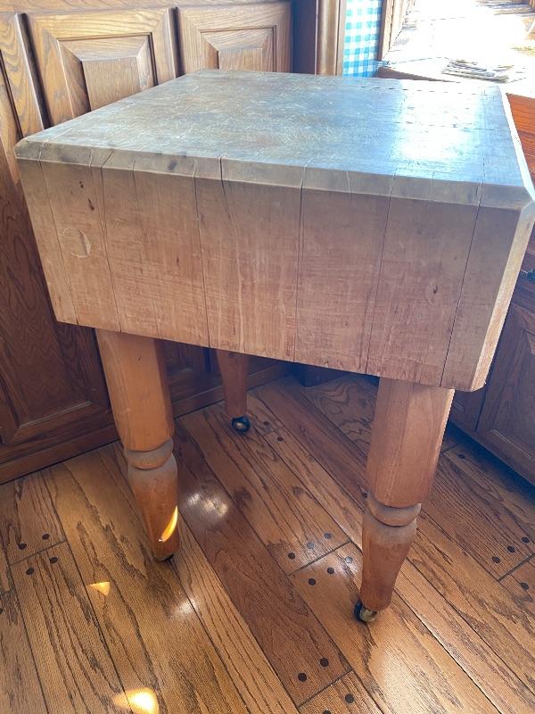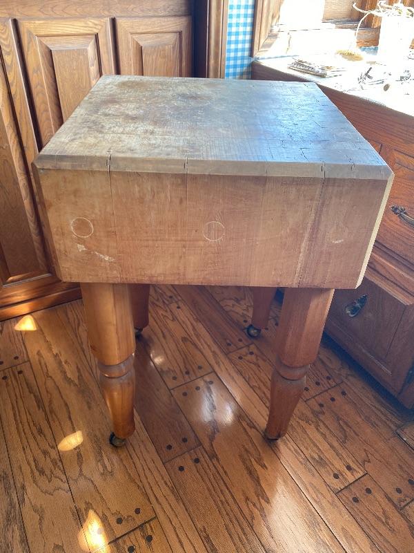Butcher block table. Over 3’ tall. On wheels. Heavy thick block. Used, Wood has some fine splits around edge.