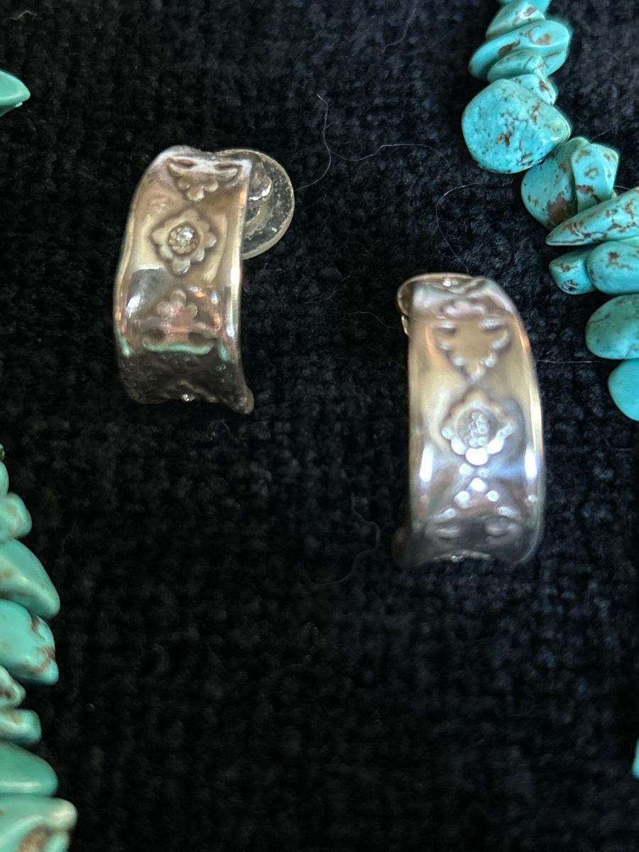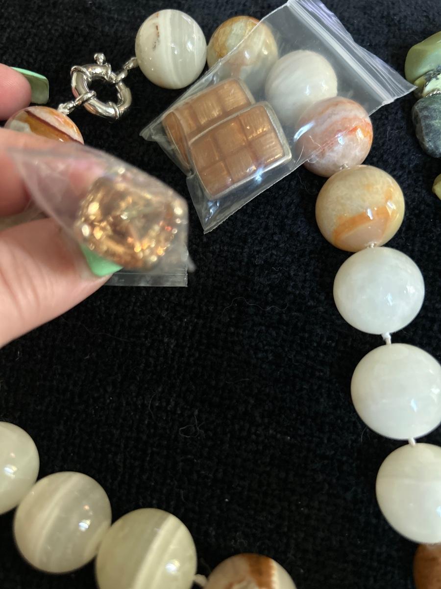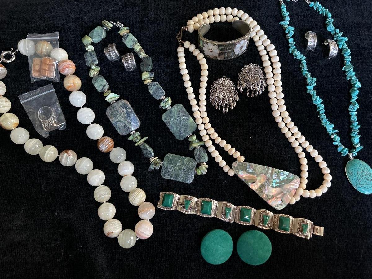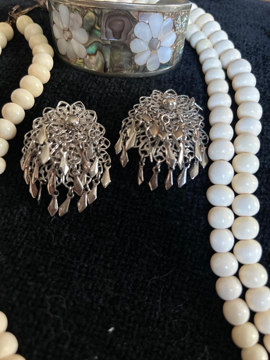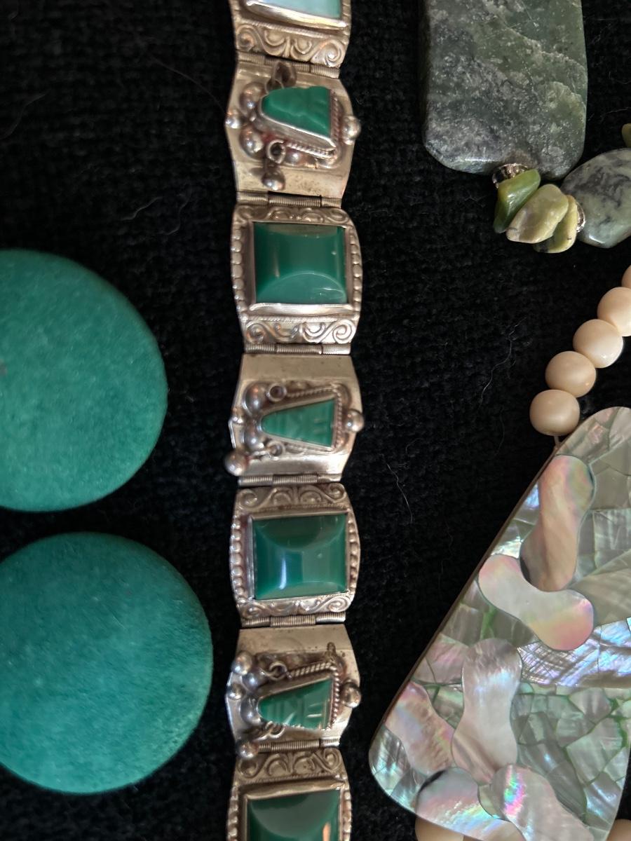 These are all gorgeous!! The earrings with the green necklace are clip on and the earrings with the mother of Pearl necklace are clip on. The silver and green bracelet needs clasp tightened.
