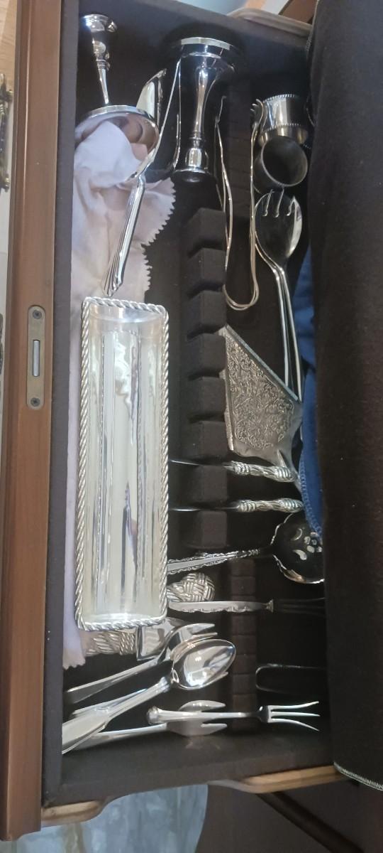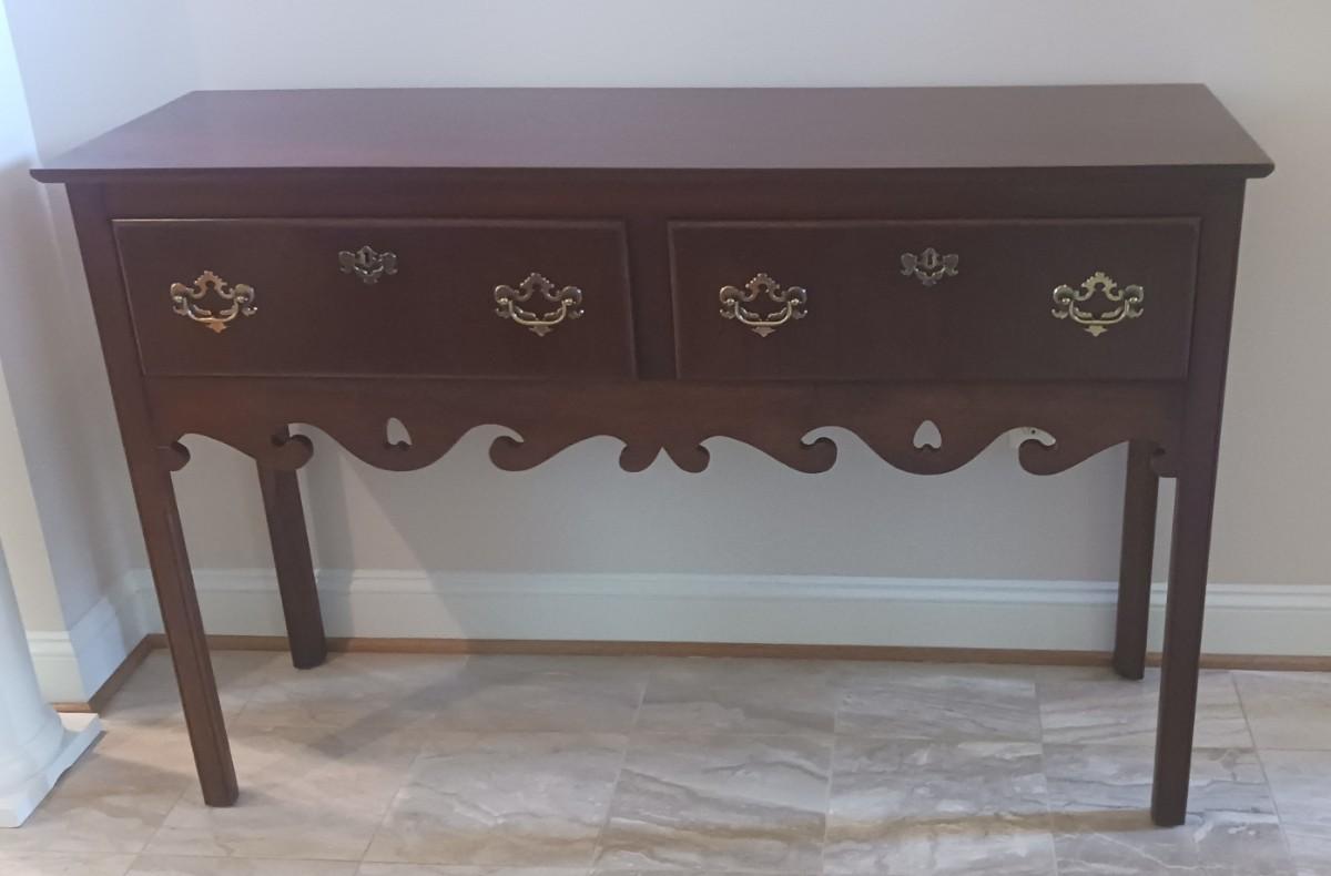 55 1/2" wide, 17 3/4 deep, 3' hgth. Wood sideboard with 2 drawers. 1 lined drawer to hold silver utensils the other is unlined. Contents not included.