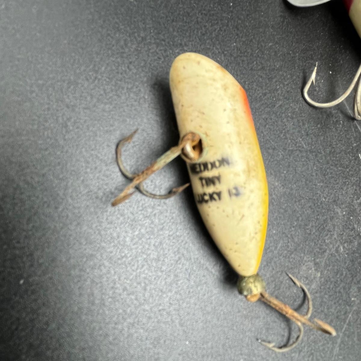 Lot includes Heddon Go Deeper Crab, two Tiny Lucky 13 and Midget Digi. Also includes a selection of unmarked lures that all appear to be wooden. Longest lure measures 6”.
