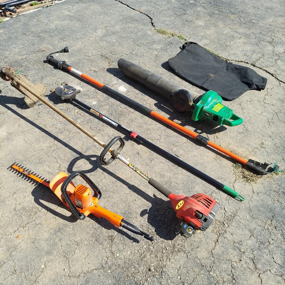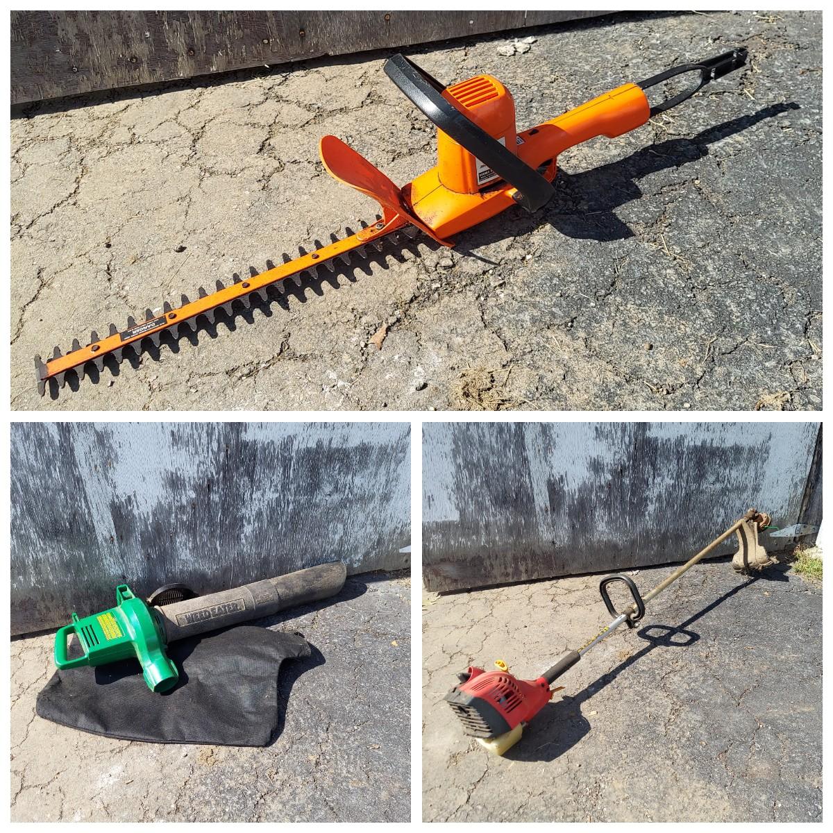 Pole saw, hedge trimmer, weed trimmer and more. Brands include Craftsman, Black & Decker and more. The weed wacker is the only gas powered piece and does turn over. The hedge trimmer and blower powered on when tested, Please see photos for details. Local Pickup Only.