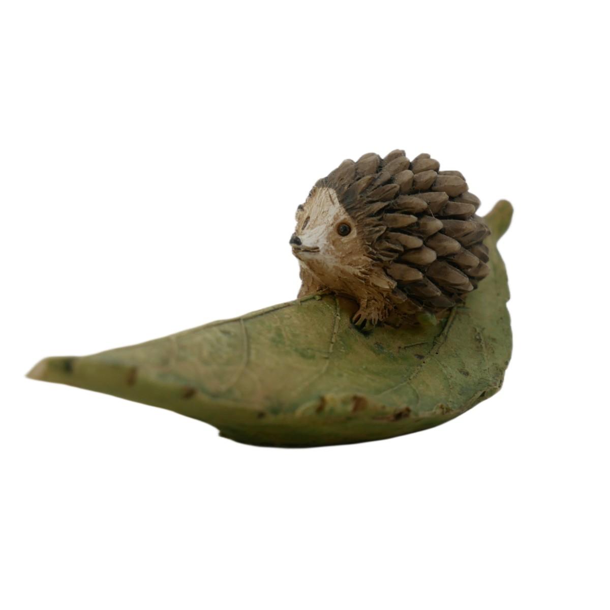 Two hedgehogs sitting on a book figurine, measures L 2" x H 1.5". Sweet little hedgehog on leaf (tip of leaf is chipped), measures L 3" x H 1".
