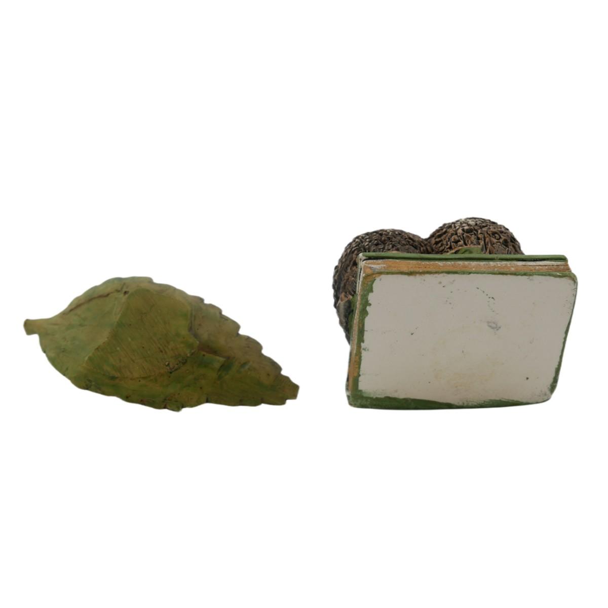 Two hedgehogs sitting on a book figurine, measures L 2" x H 1.5". Sweet little hedgehog on leaf (tip of leaf is chipped), measures L 3" x H 1".