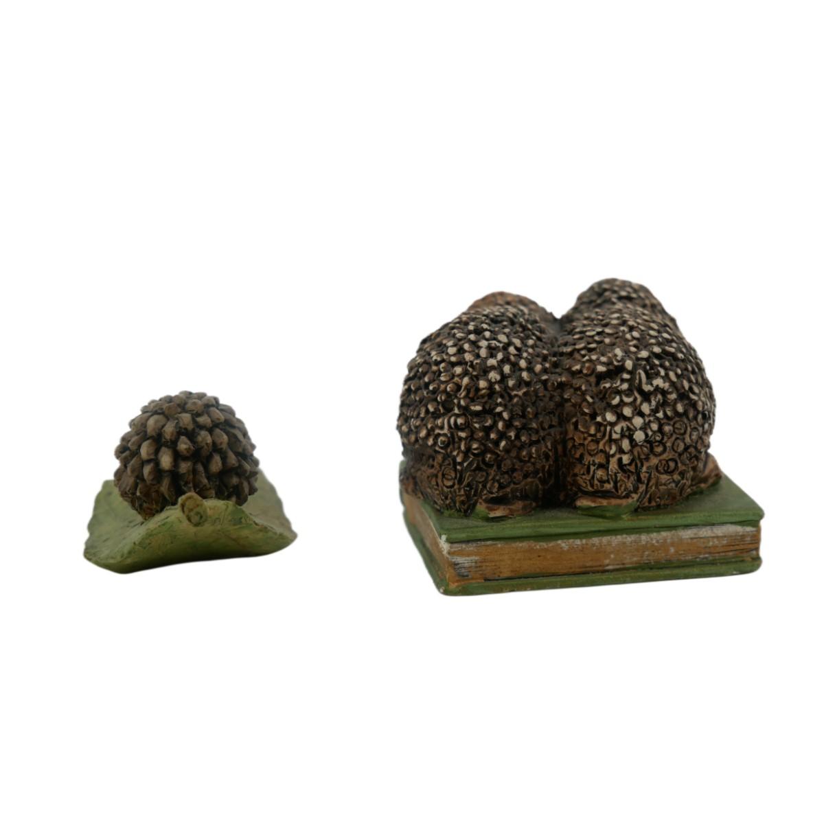 Two hedgehogs sitting on a book figurine, measures L 2" x H 1.5". Sweet little hedgehog on leaf (tip of leaf is chipped), measures L 3" x H 1".