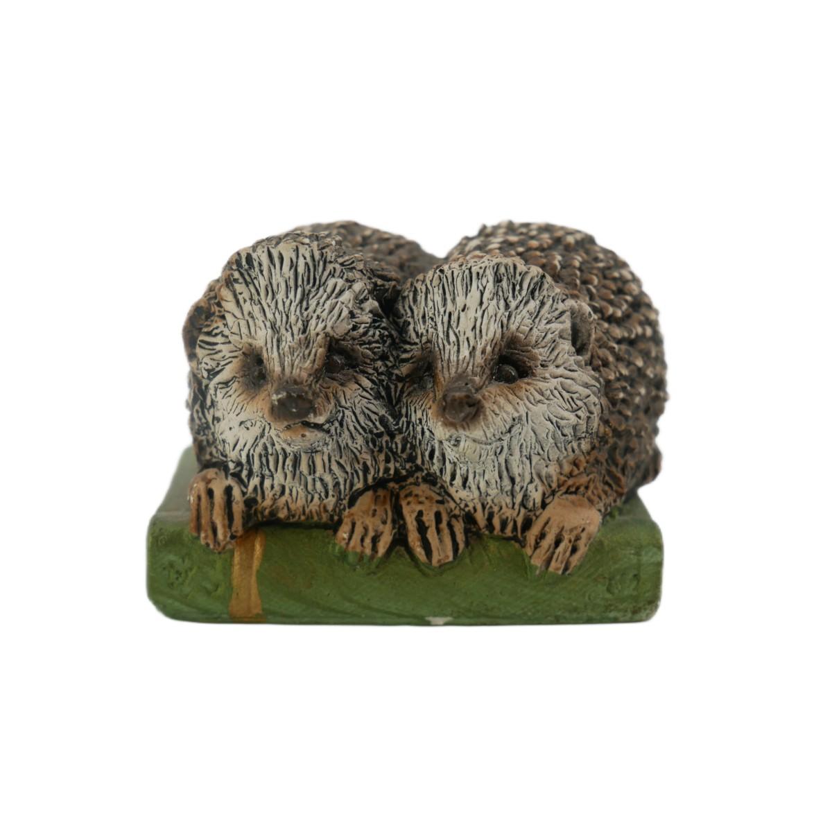 Two hedgehogs sitting on a book figurine, measures L 2" x H 1.5". Sweet little hedgehog on leaf (tip of leaf is chipped), measures L 3" x H 1".