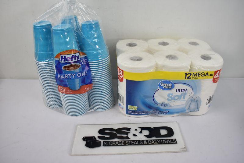 Hefty Party On! 120 Cups, 18 oz Blue & Great Value Toilet Paper, Ultra Soft, 12 Mega Rolls - New