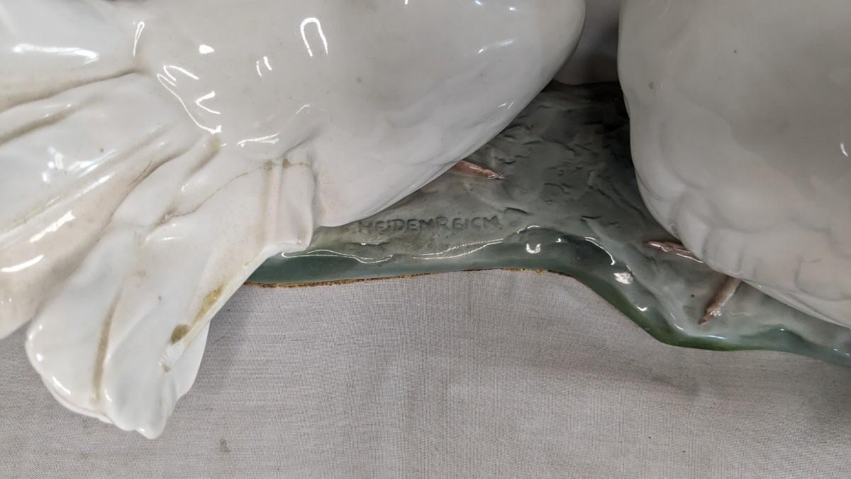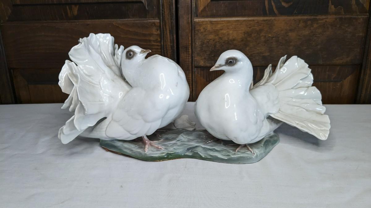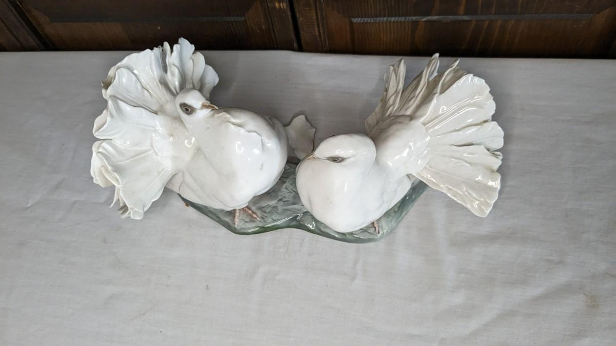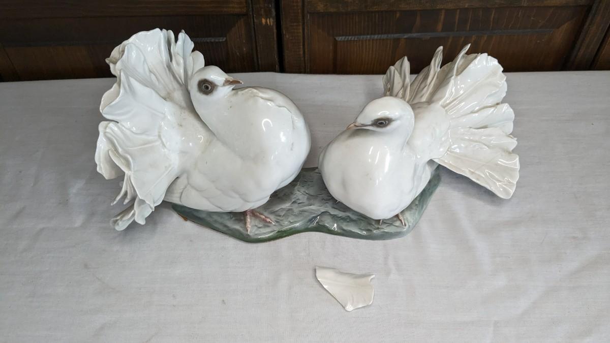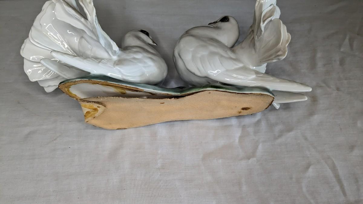 a stunning pair of Rosenthal-Germany ceramic fantail doves marked by Fritz Heidenreich on the back. This piece has been repaired in a couple of spots and currently has a clean break tail that could be repaired, please note in photos. A nice piece regardless that is very hard to find, approximately 14" long and 8" wide.