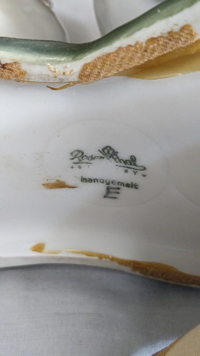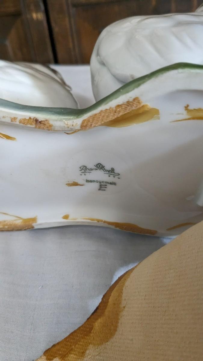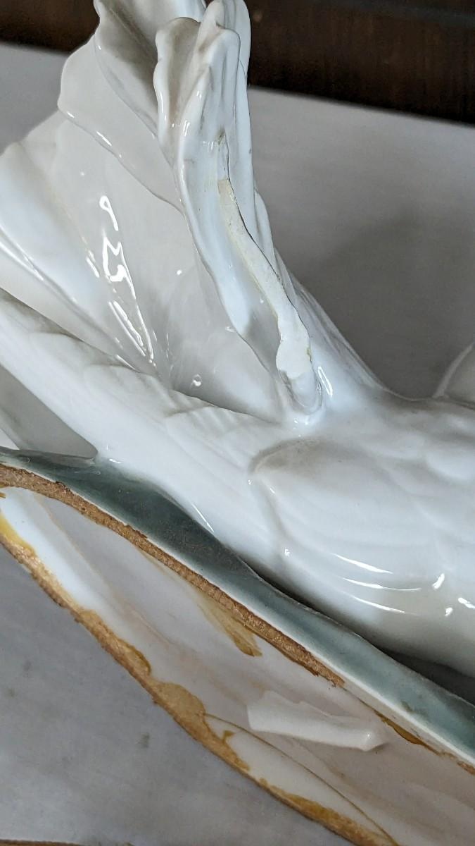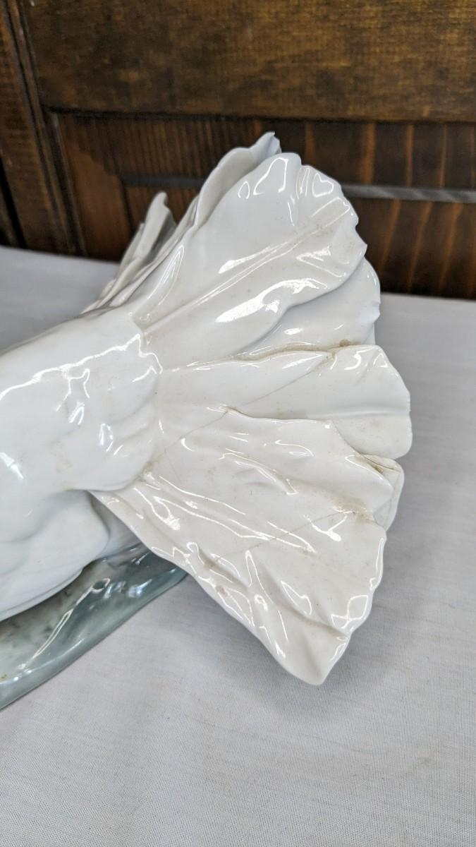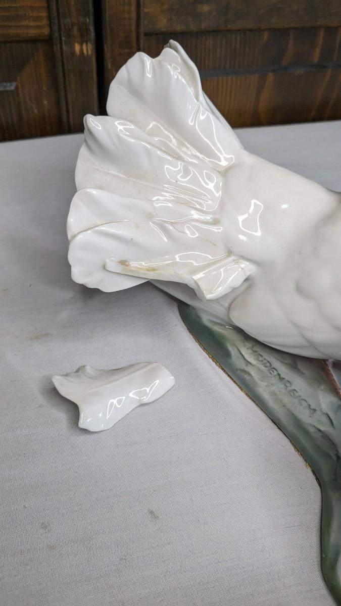 a stunning pair of Rosenthal-Germany ceramic fantail doves marked by Fritz Heidenreich on the back. This piece has been repaired in a couple of spots and currently has a clean break tail that could be repaired, please note in photos. A nice piece regardless that is very hard to find, approximately 14" long and 8" wide.