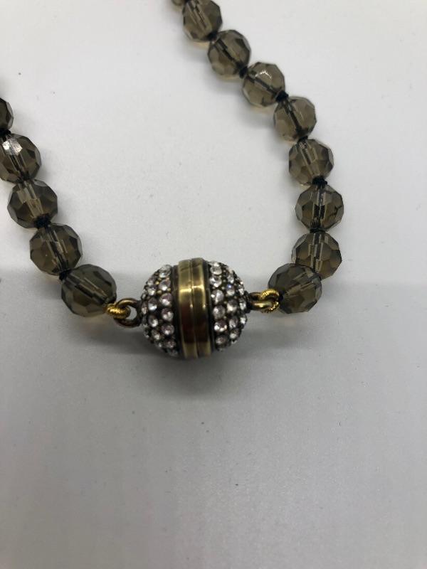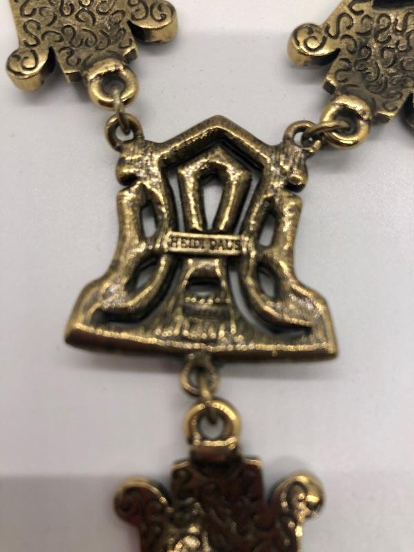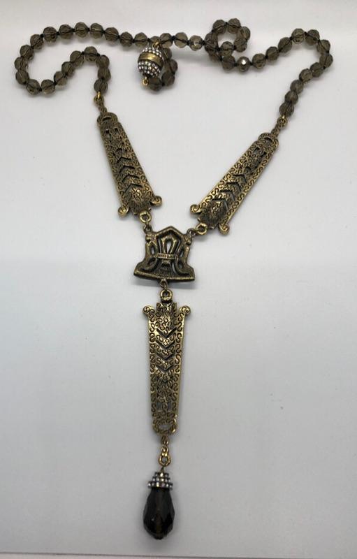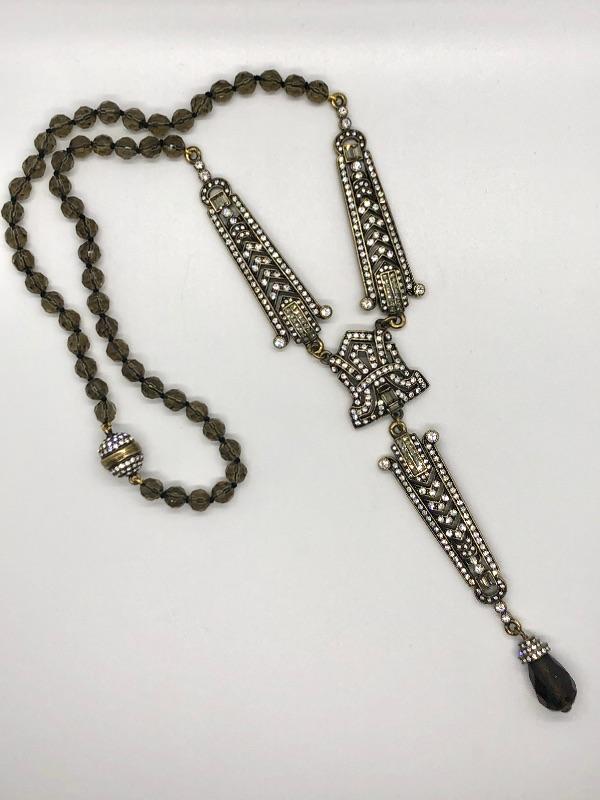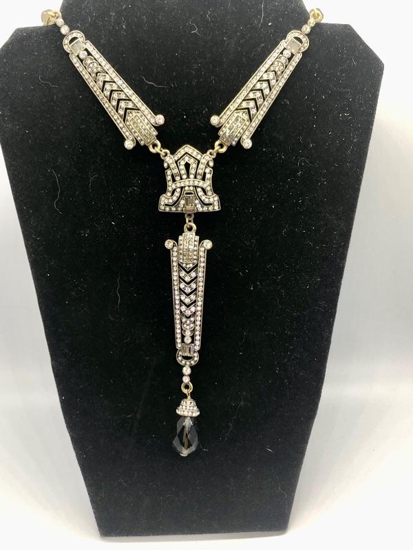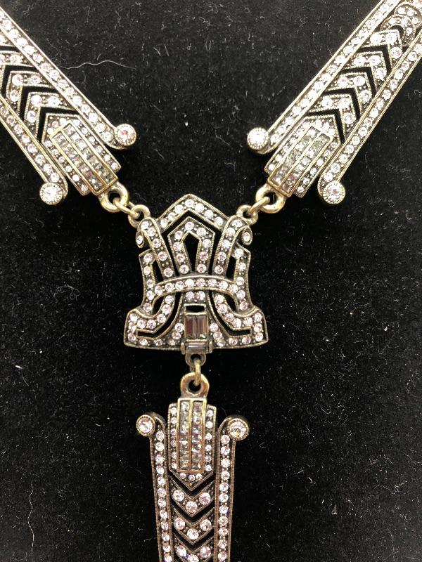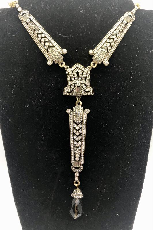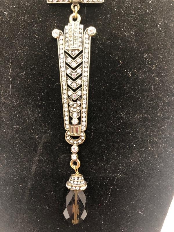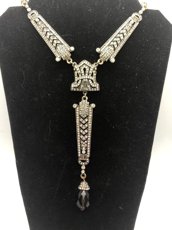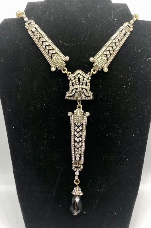 Heidi Daus art deco statement necklace. Swarovski crystals in a dark gold tone metal setting. Y style drop necklace about 17" long. No missing stones. Magnetic clasp.