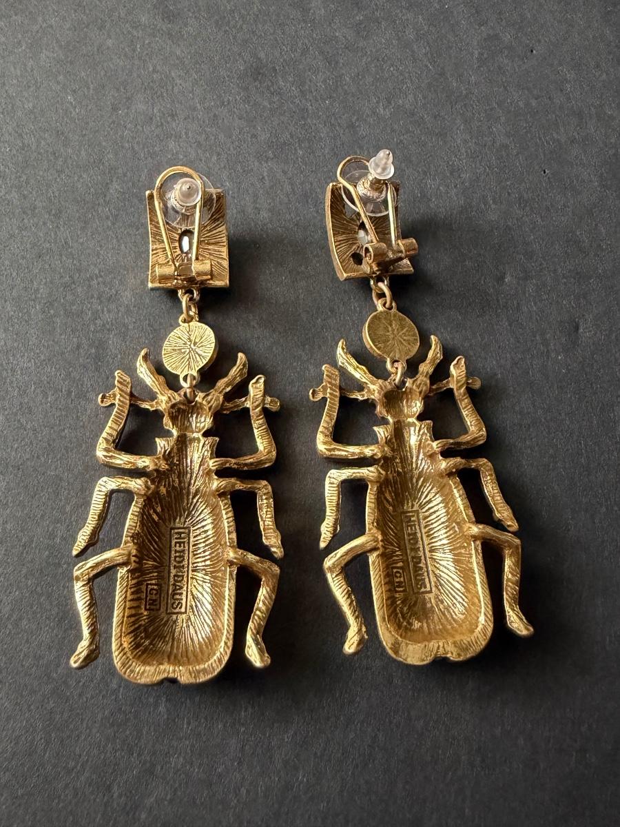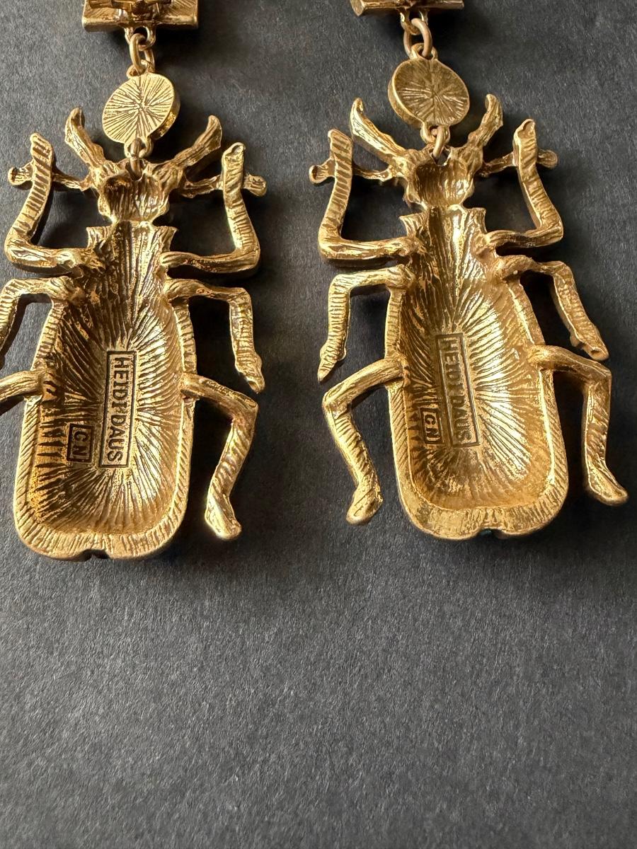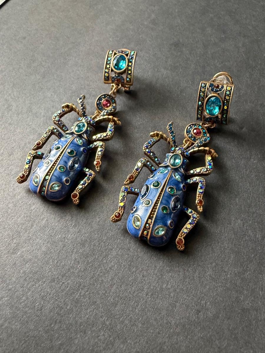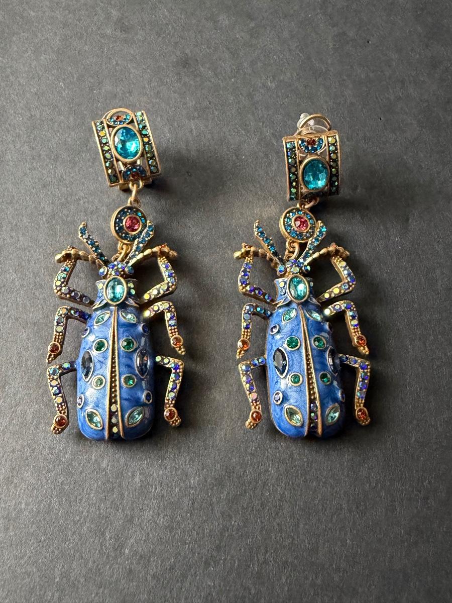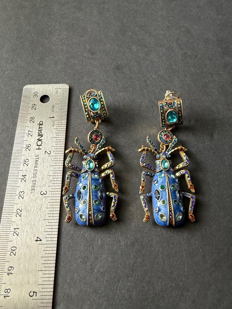 Heidi Daus blue beetle rhinestone statement earrings.