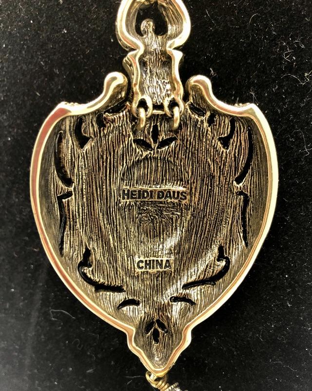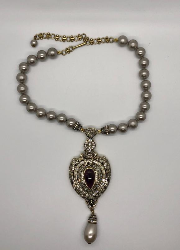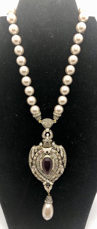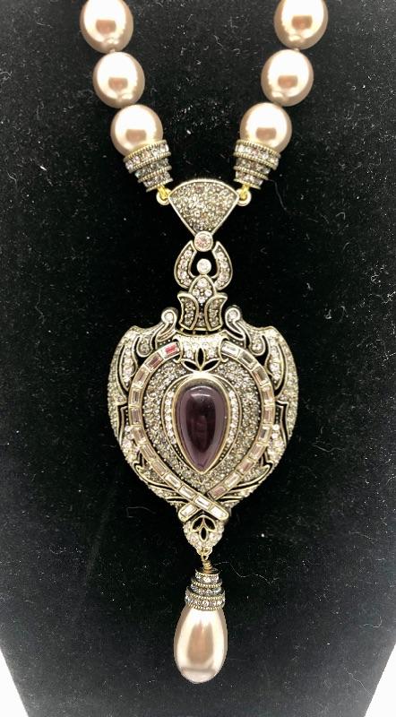 Heidi Daus feaux pearl statement necklace. Features a large 5" Swarovski covered medallion at the center with pearl drop accent. Stunning piece with no missing stones. Hook closure, adjustable around 8" not including medallion.