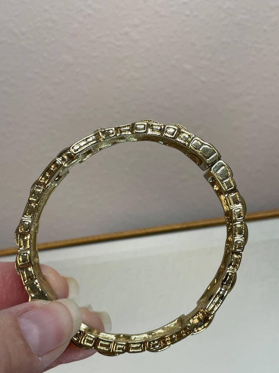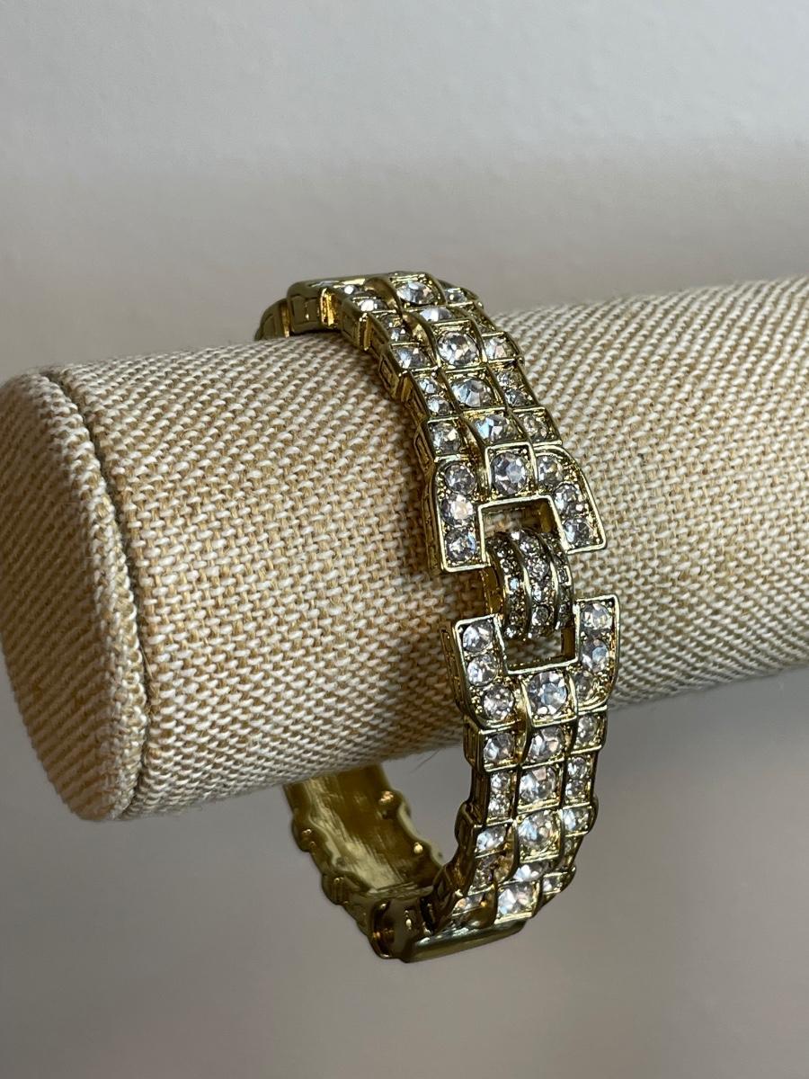 In new condition. Gold tone metal with clear rhinestones. Fits average to large wrist.