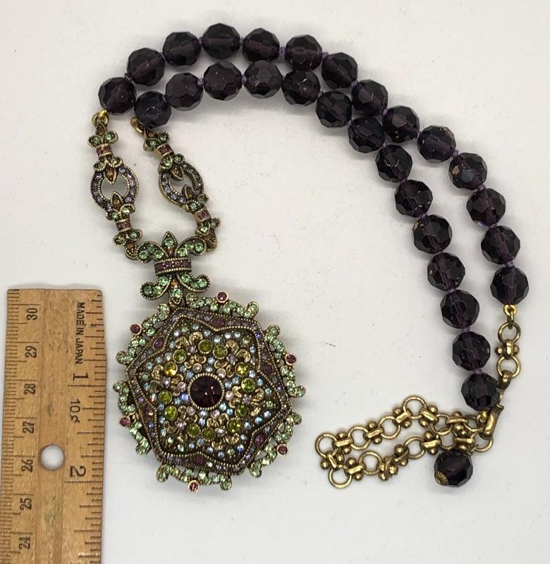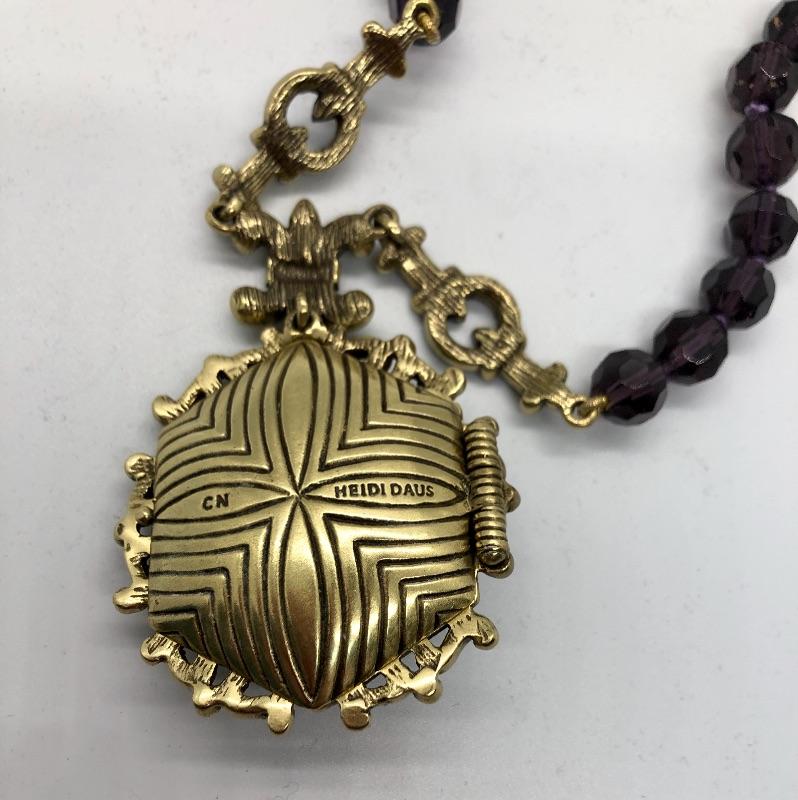 Heidi Daus medallion locket pendant necklace. Purple faceted beads, on an adjustable choker setting. Large medallion locket covered in Swarovski crystals. Medallion is 2" size and does open. Total length is 12".
