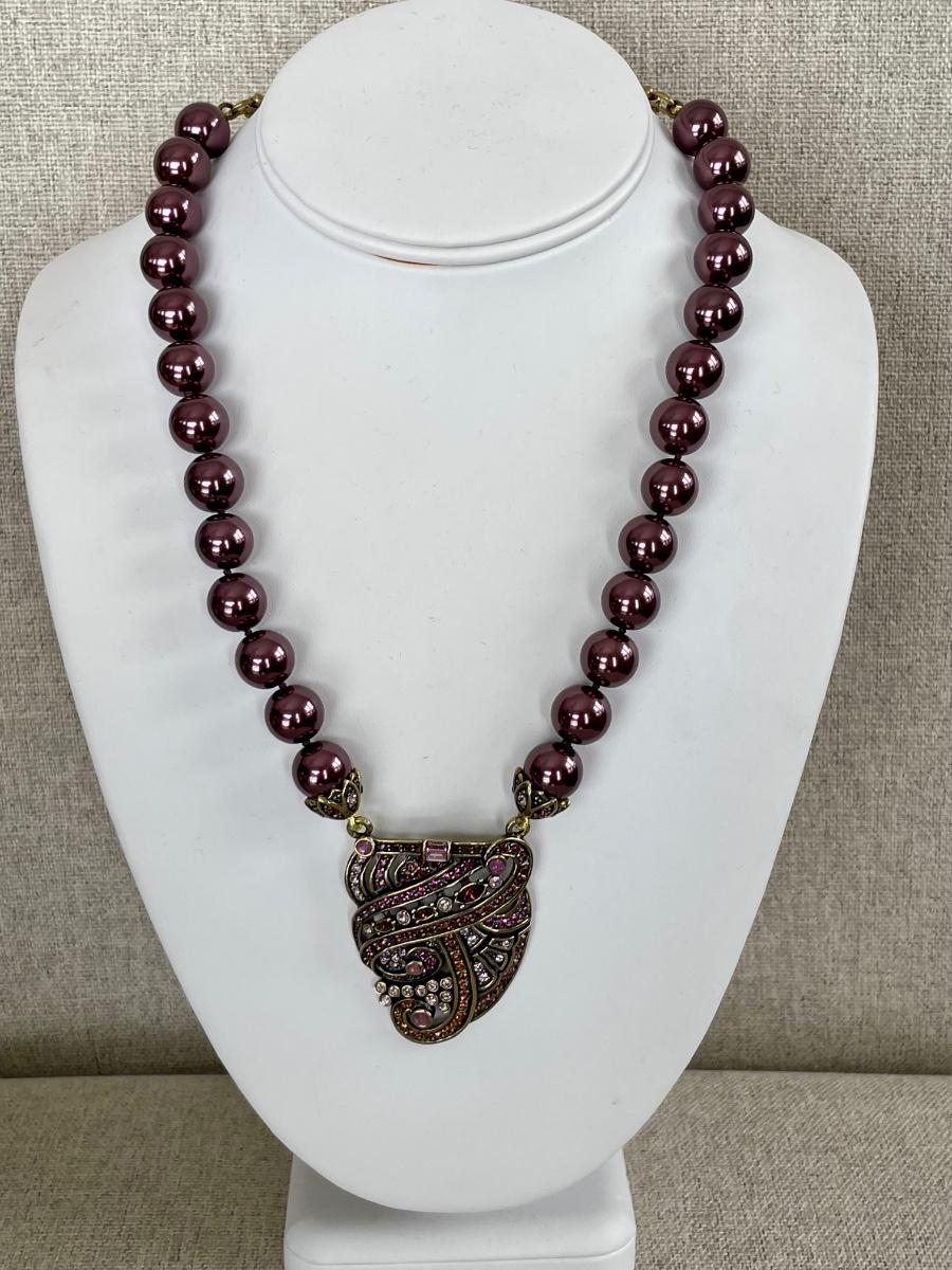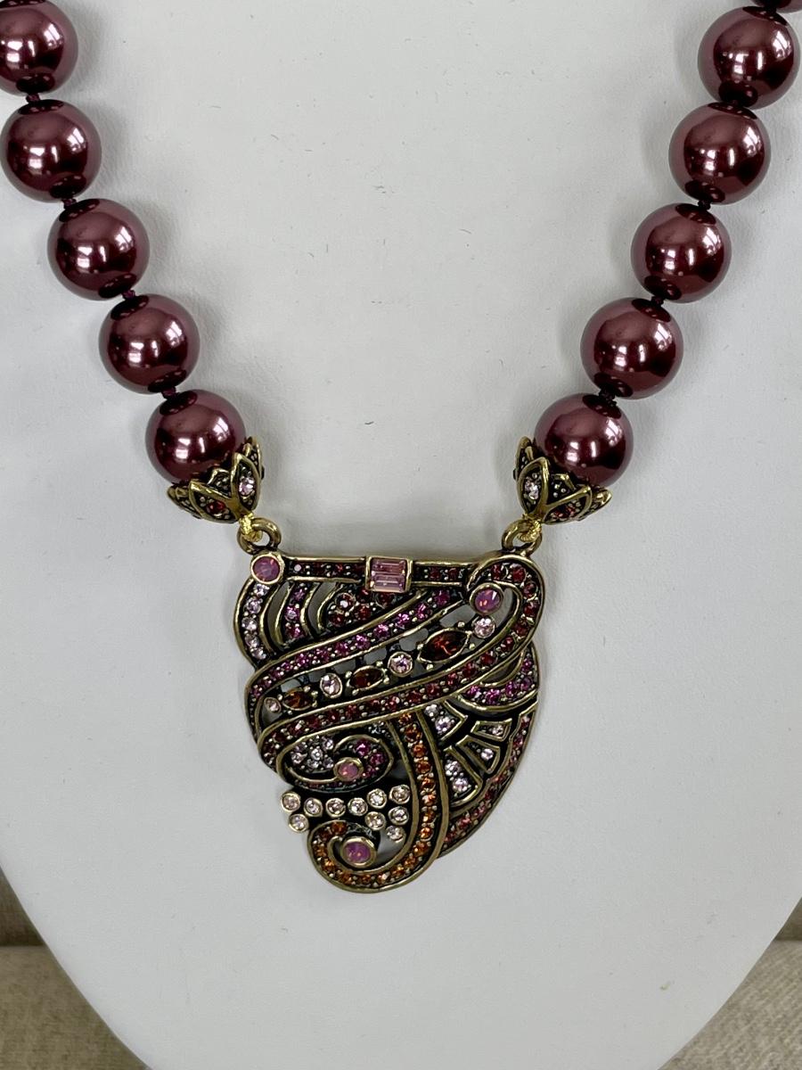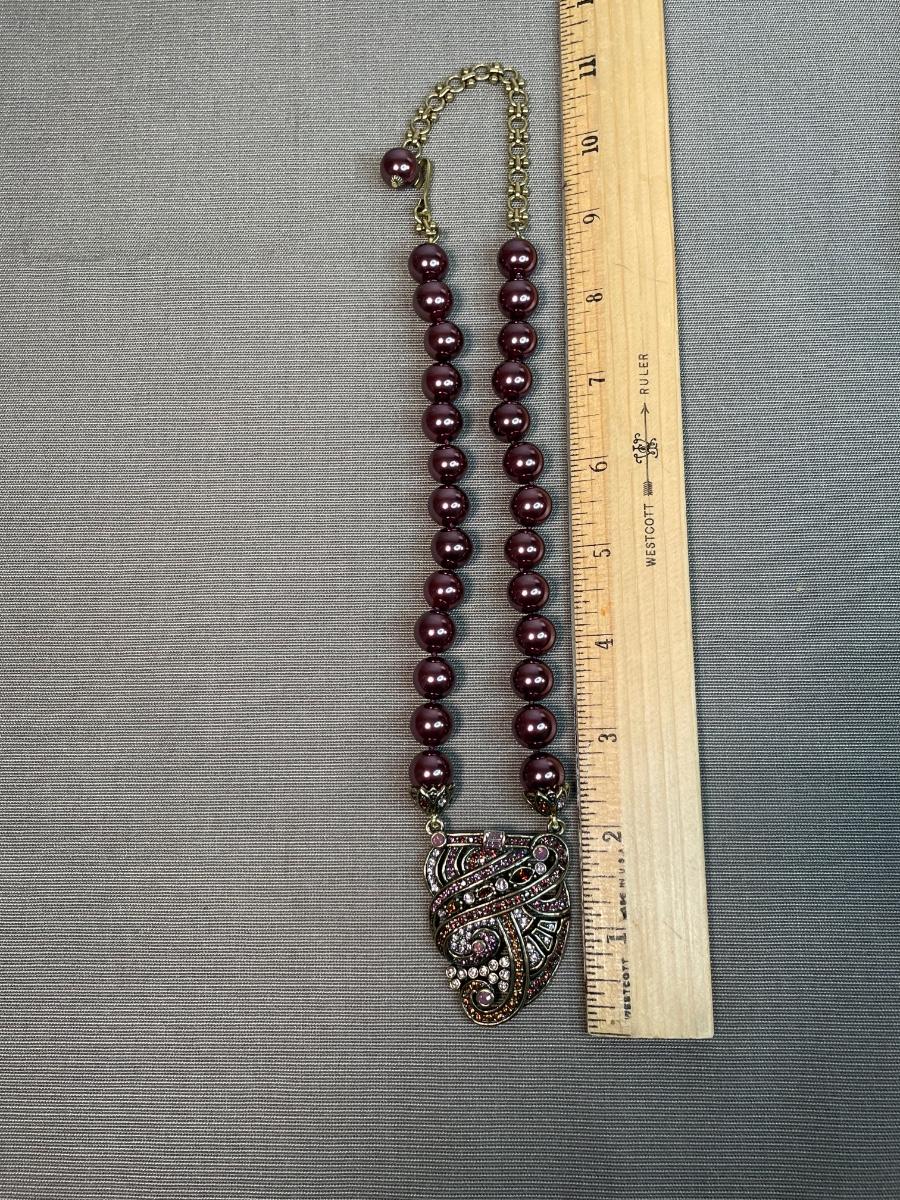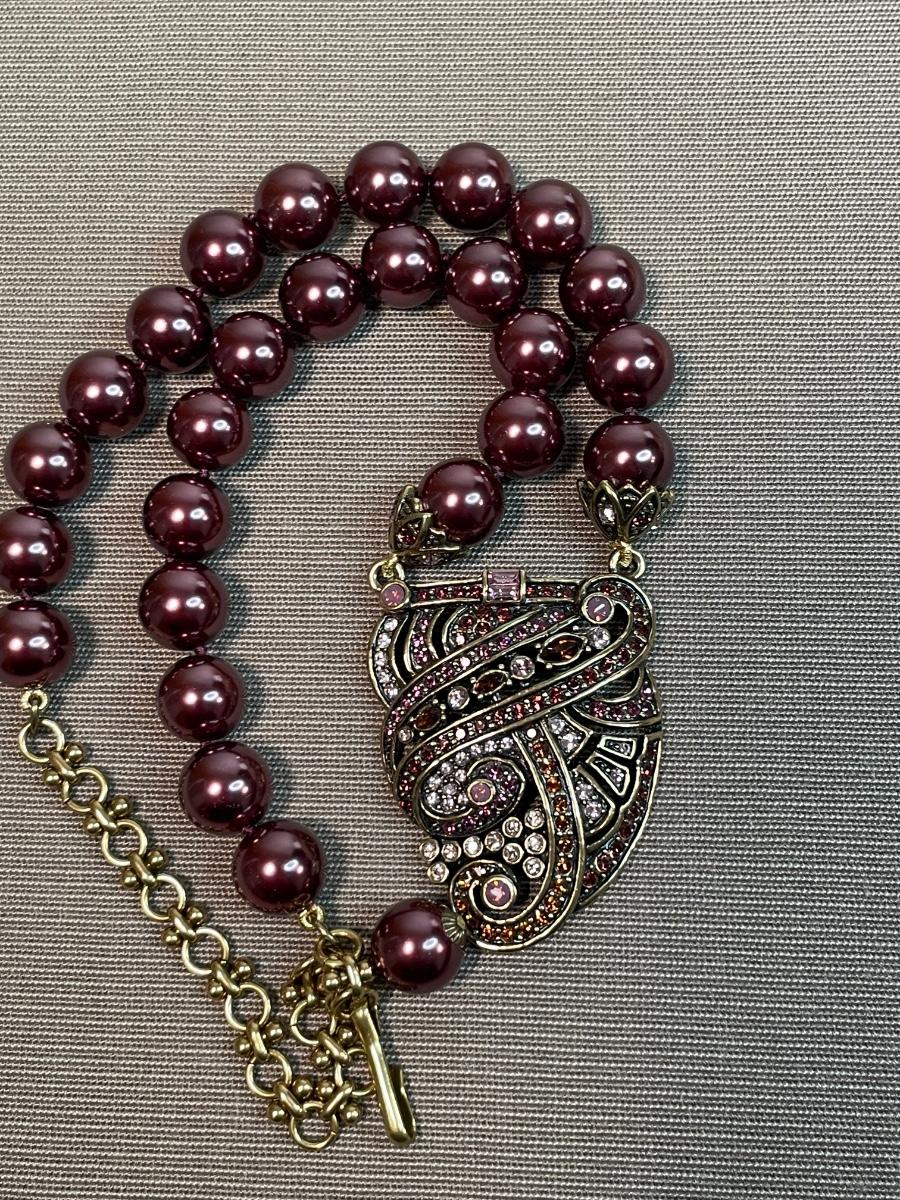 Art Deco style necklace with mauve/brown faux pearls and antique gold tone pendant with glass stones.