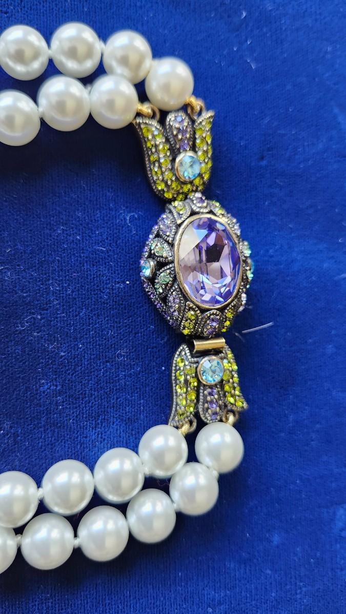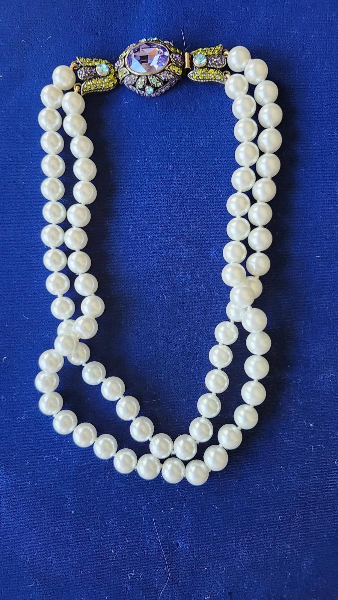 Multi color crystal clasp on 2 strand large pearl choker.