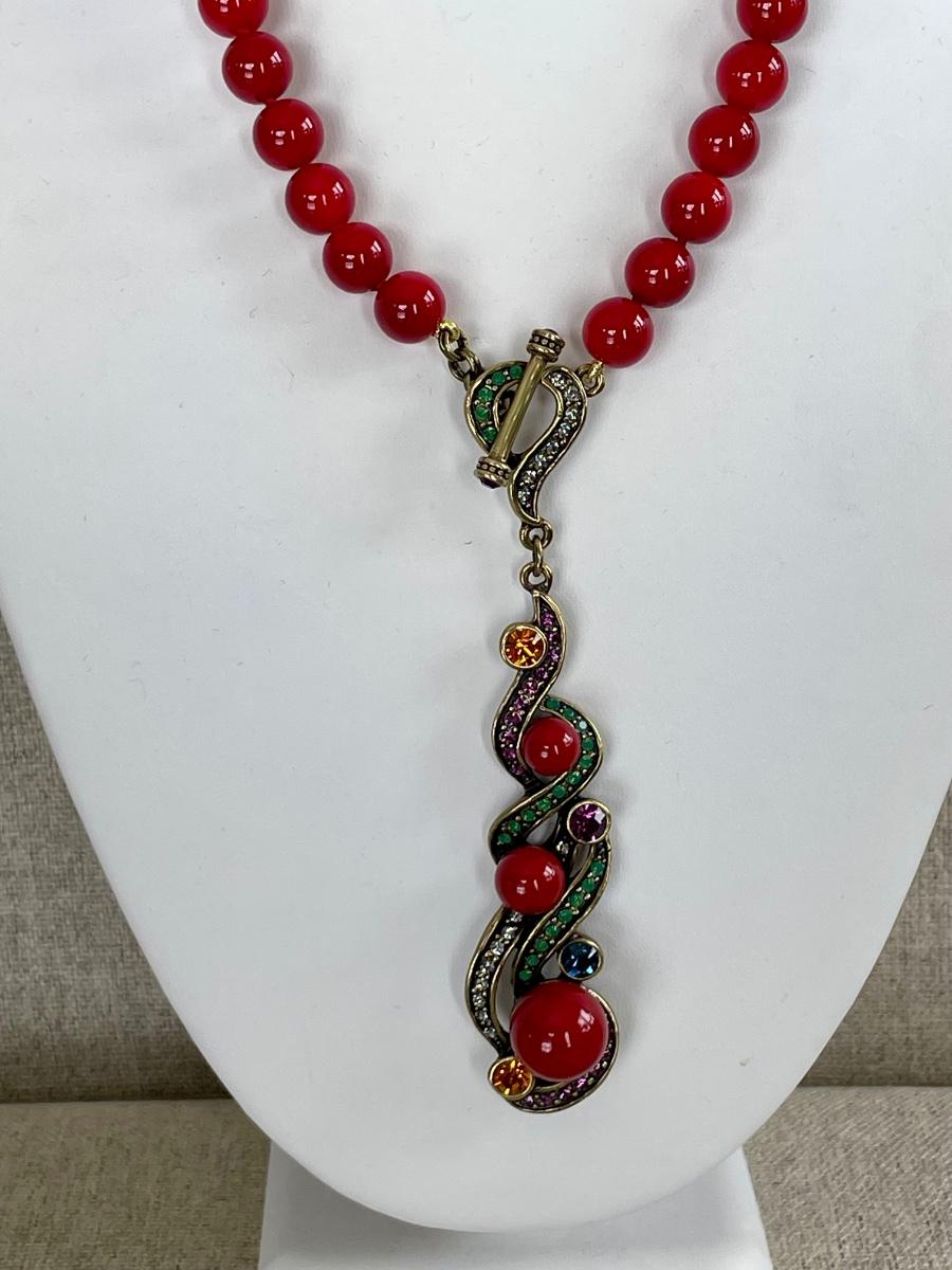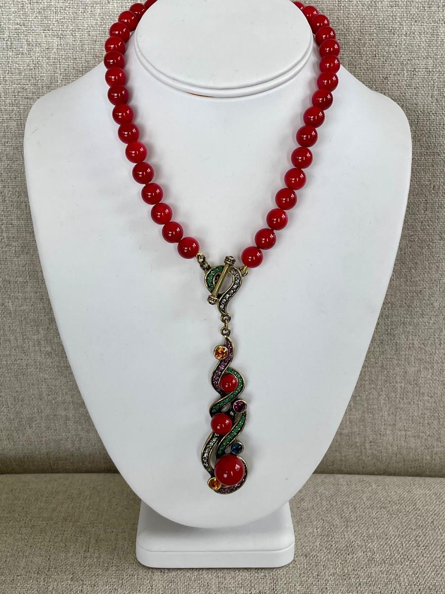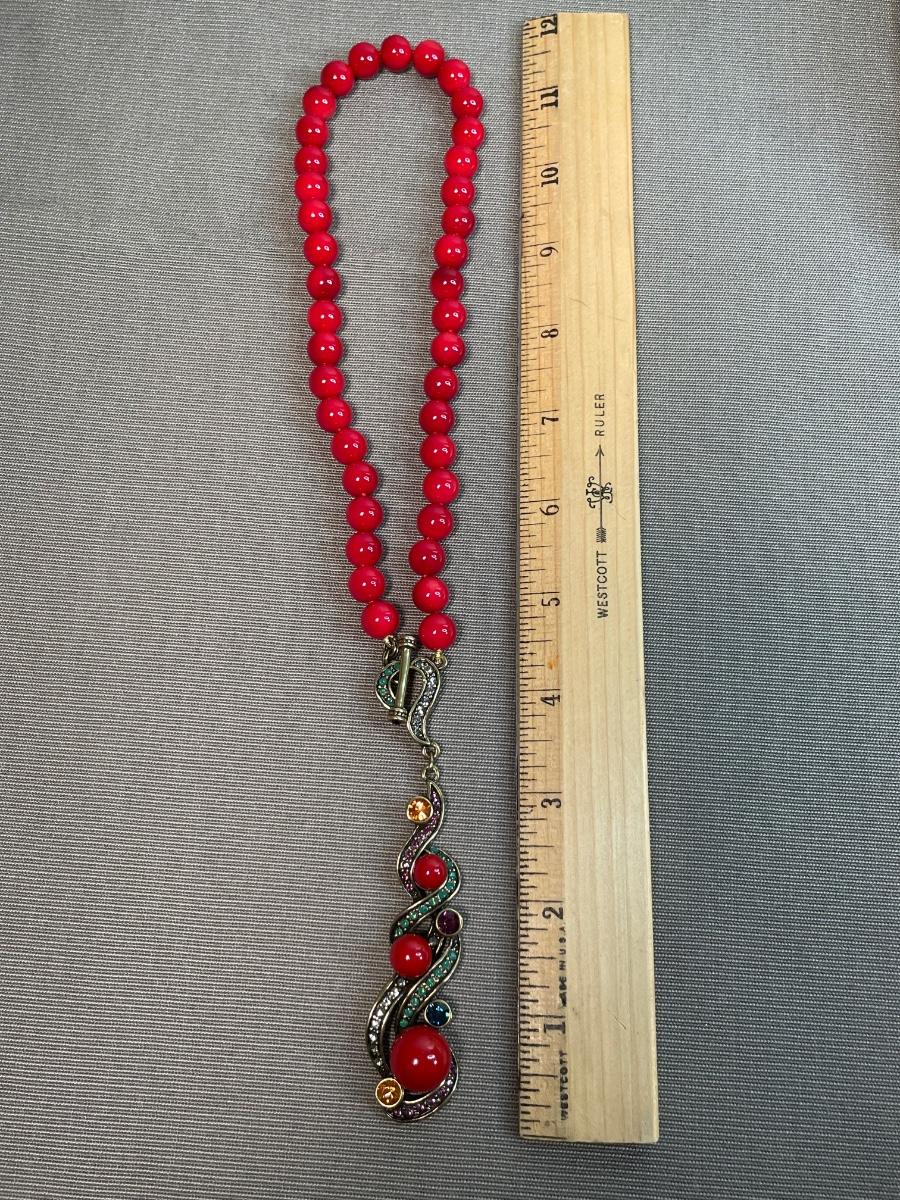 Front toggle Y necklace with red beads and multi colored crystals on the pendant. Like new!