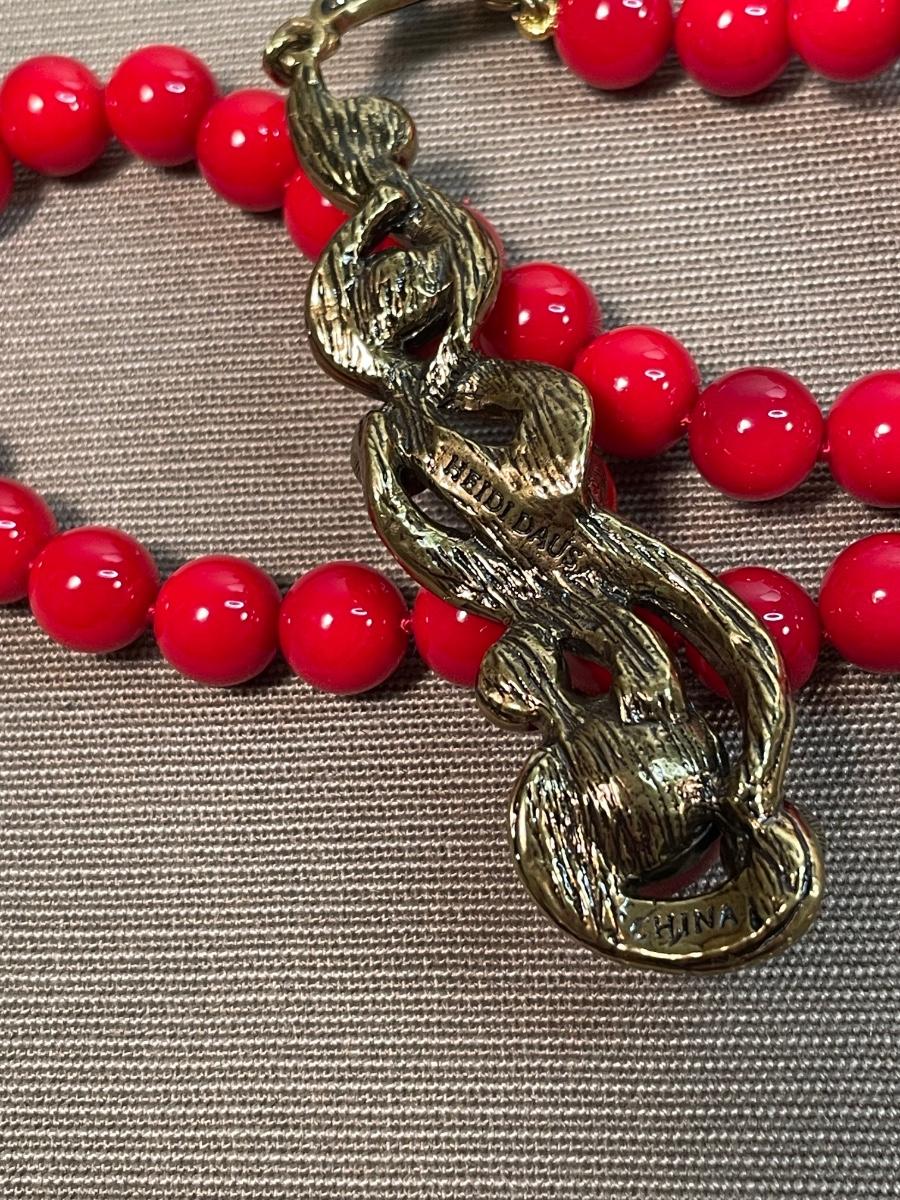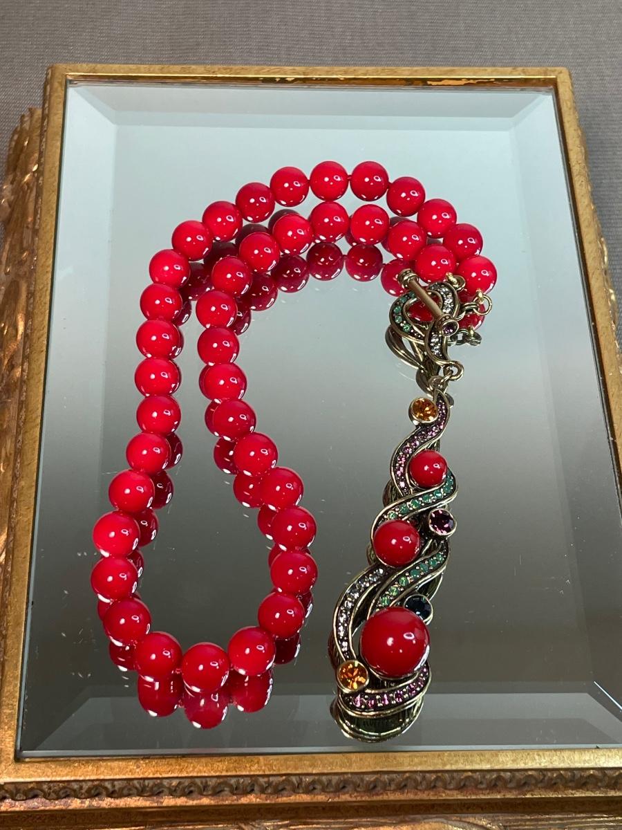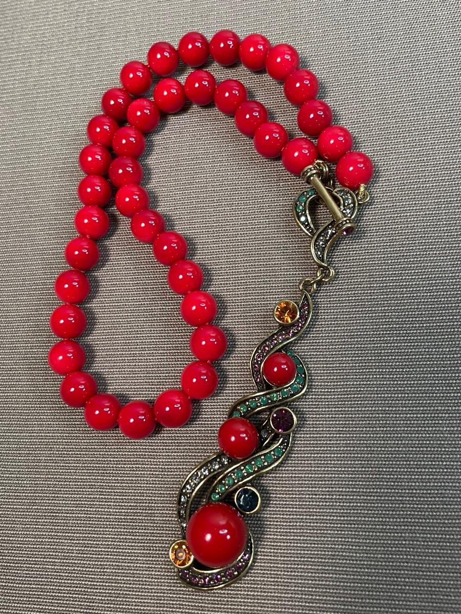 Front toggle Y necklace with red beads and multi colored crystals on the pendant. Like new!