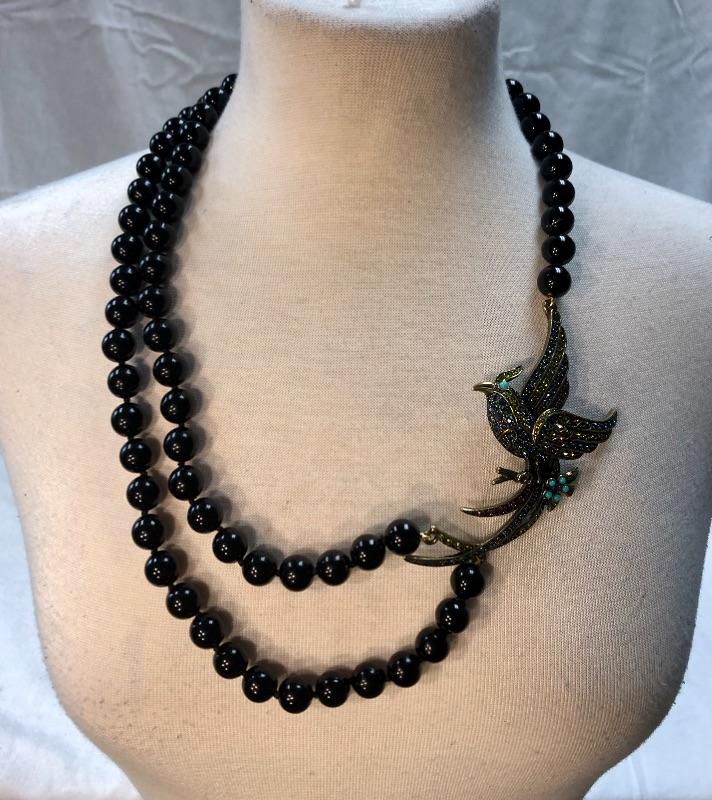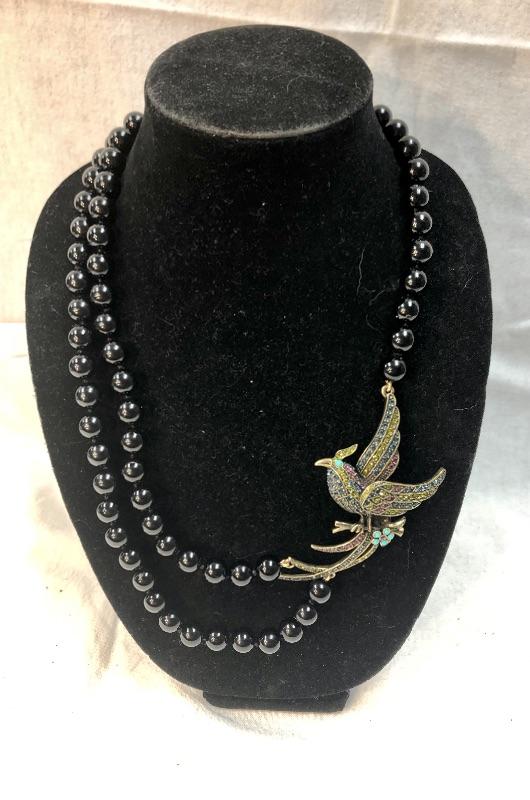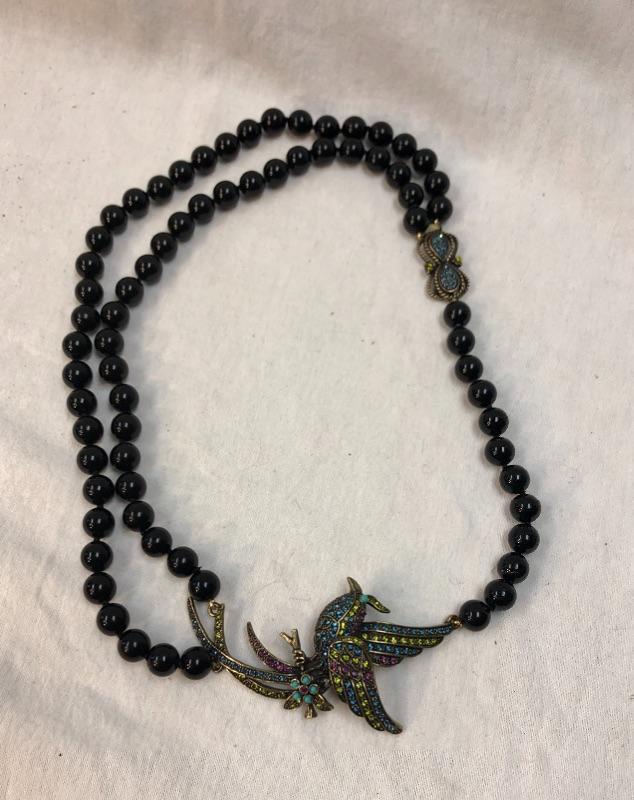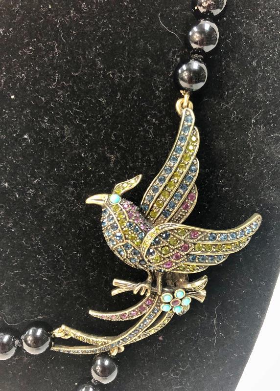 Heidi Daus beaded statement necklace, Multi-strand design puts the bird off center. Dark gold tone metal setting with colorful Swarovski crystals. No missing stones. Decorative clasp. About 12" total length.