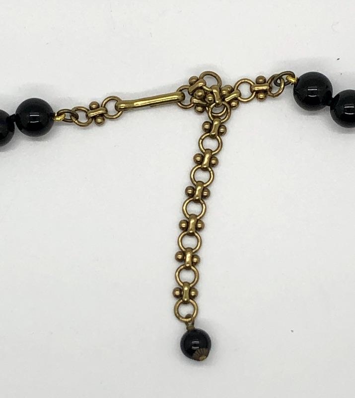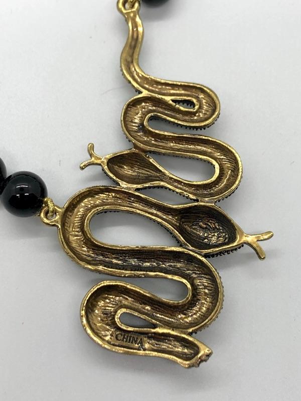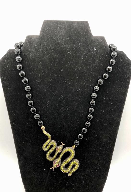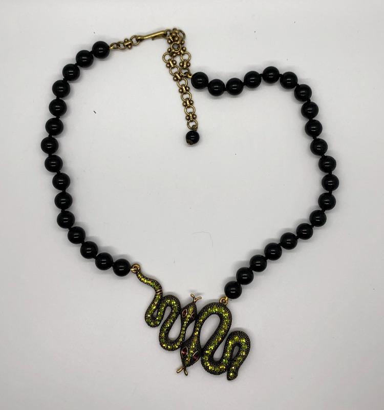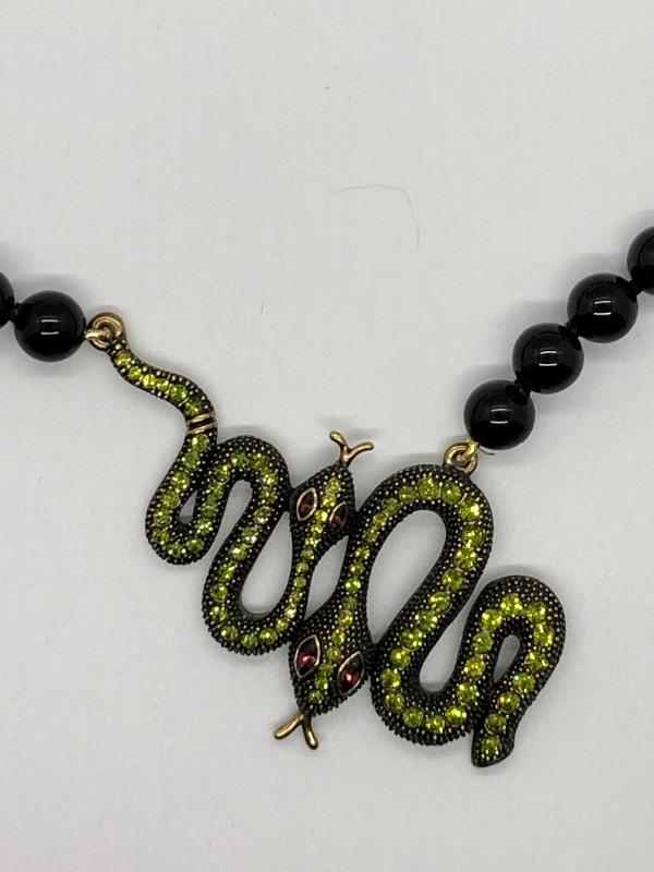 Beaded Heidi Daus statement necklace featuring a pair of snakes at the center. Green Swarovski crystals on the bodies with violet crystal eyes. Round black beads. Hook closure with adjustable length around 15". It looks like the larger snake might be missing the end of his tail. Still looks goods.