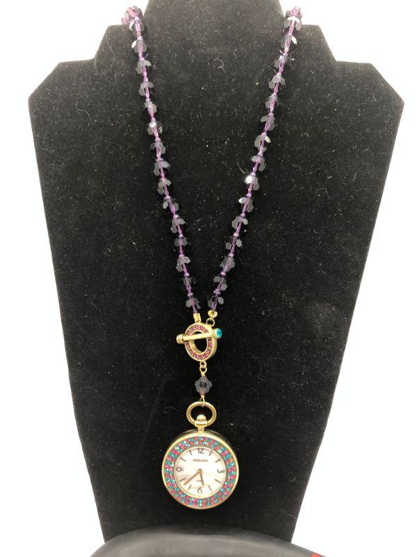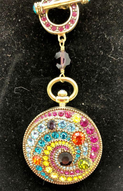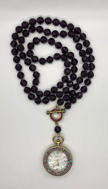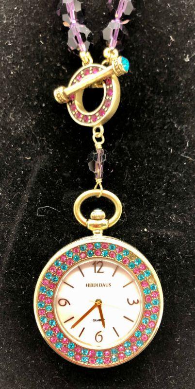 Heidi Daus "Timing is Everything" Swarovski crystal pendant watch necklace. Gold tone pocket watch pendant covered in a colorful mix of crystal rhinestones. Toggle closure. Necklace is made of faceted purple beads. Long, about 21" length Watch is about 1.5" size with a mother of pearl face.