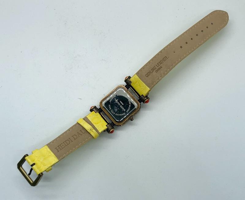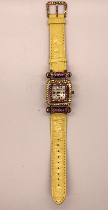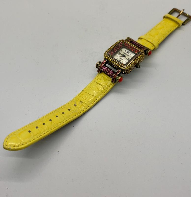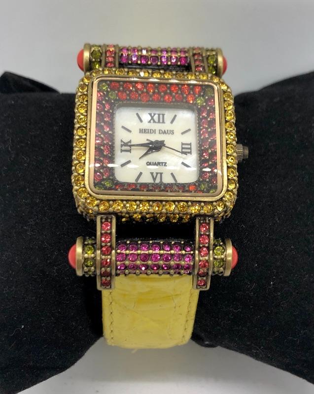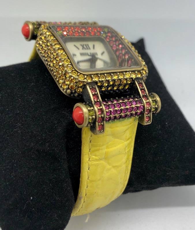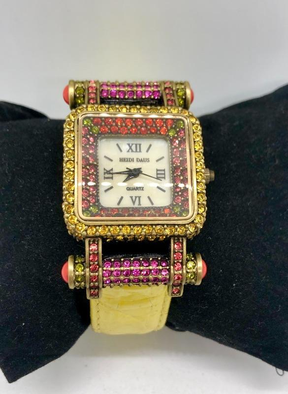 Heidi Daus woman's watch. Pink & yellow crystals with bits of green and orange. Yellow leather band. Currently not running. Good condition.