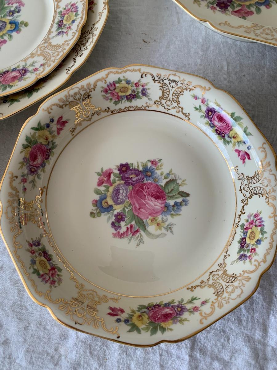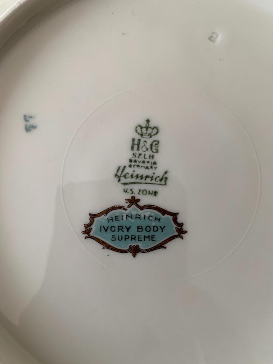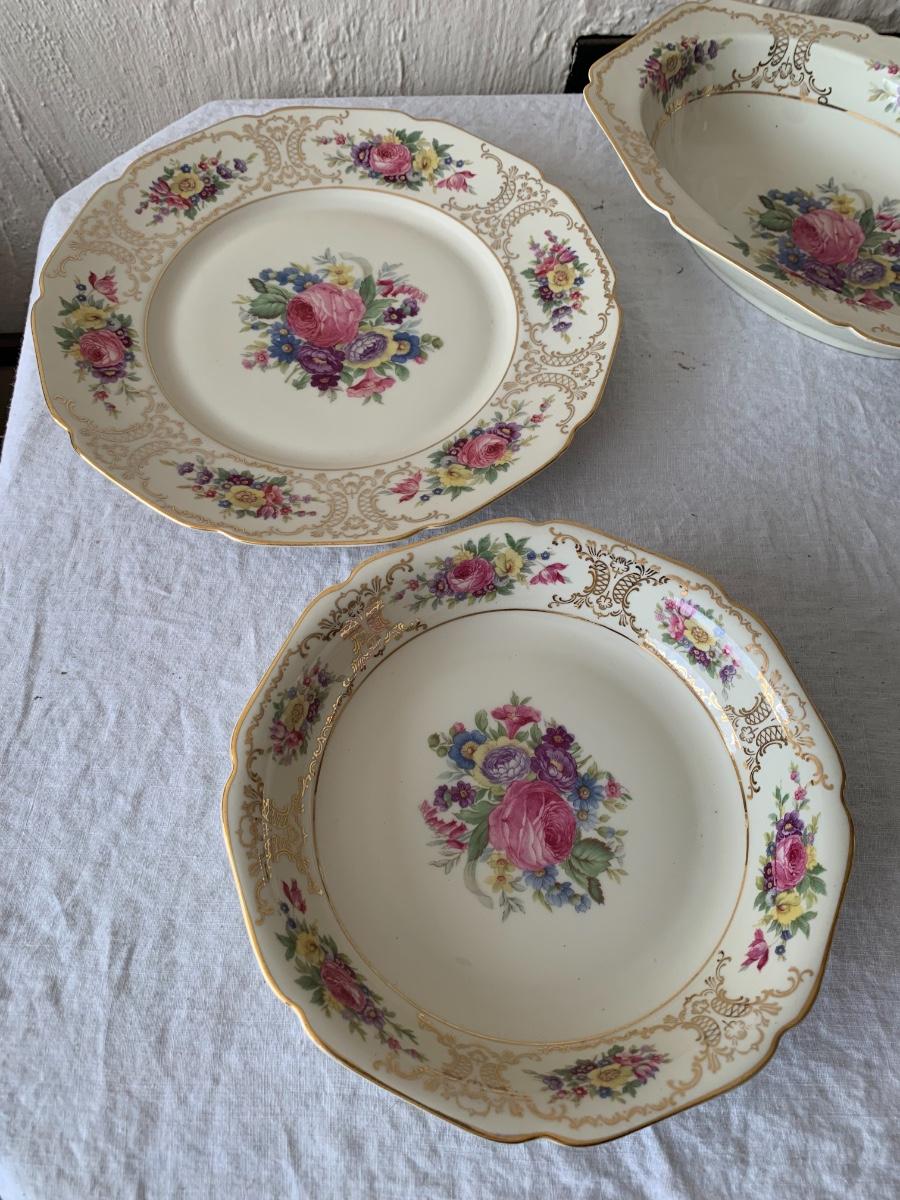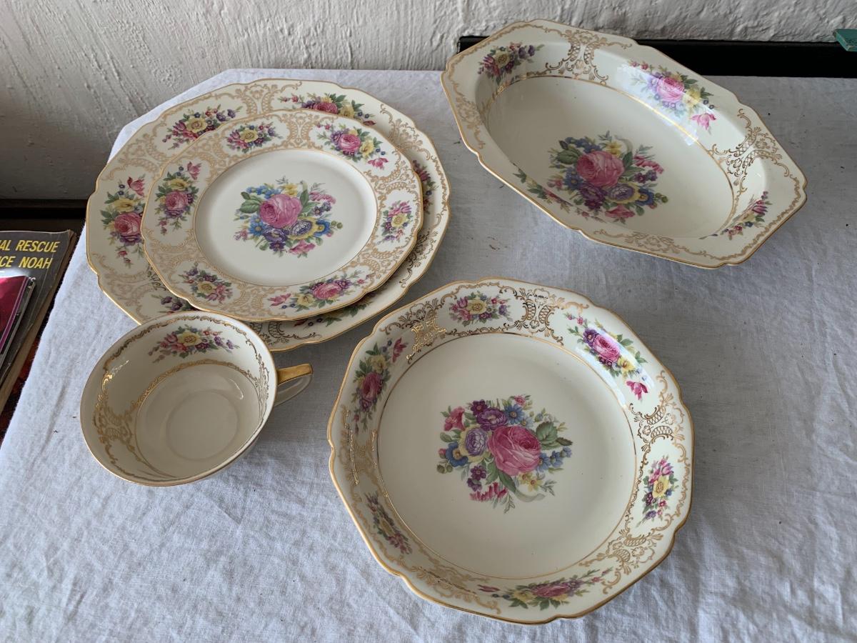 Vintage set made in Bavaria set includes 7 of Dinner plates and 6 soup bowls, 8 dessert plates, 7 tea cups, 15 saucers, platter, sugar bowl and creamer.