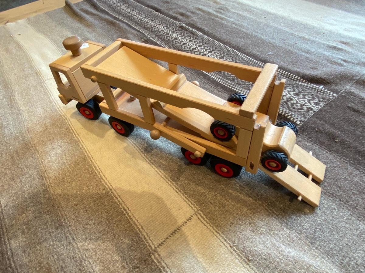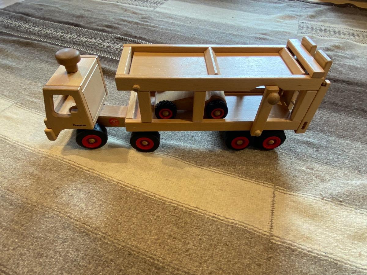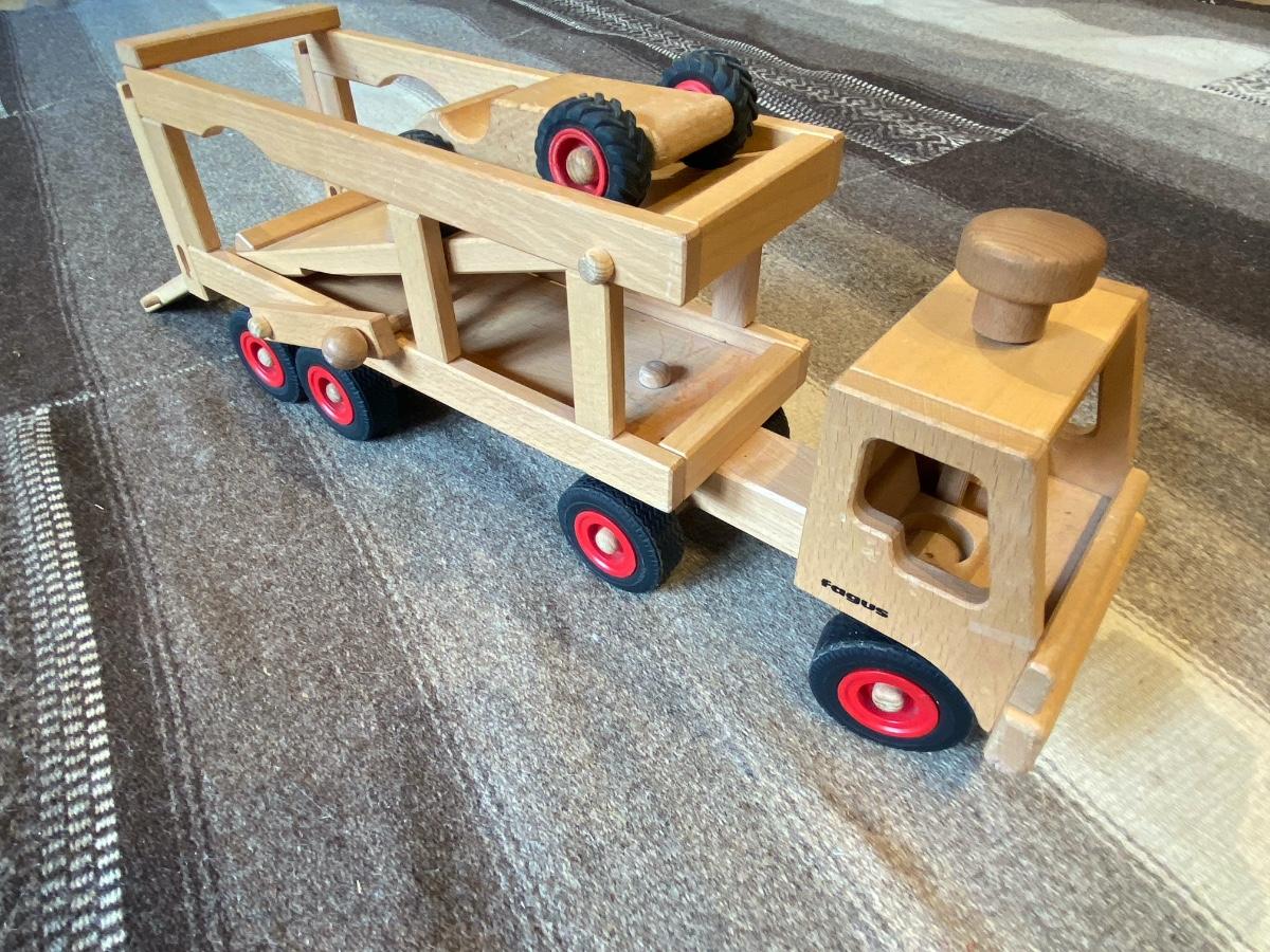 Made by the German toy company, Fagus, is this large child's toy truck made of solid beechwood. It is indestructible. It has two tiers that move via a lever and a gate that opens and closes to allow cars to load and unload. It is an heirloom toy made to last generations. Comes with one additional car.
