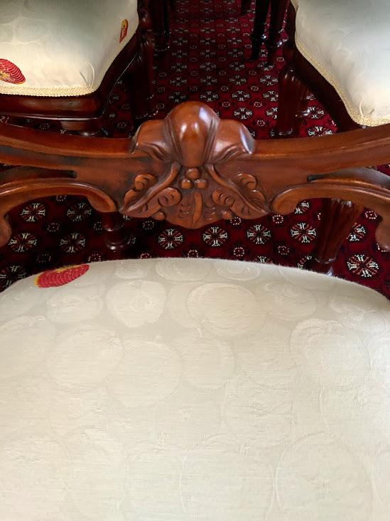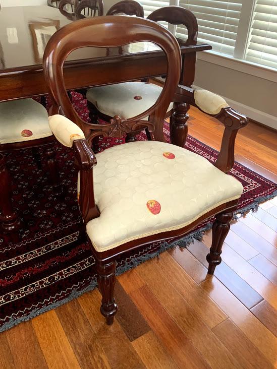 Imported from Europe - 10 Seater accented with beautifully upholstered seats with elegant carved dining room chairs. Pristine condition with no wear and tear.