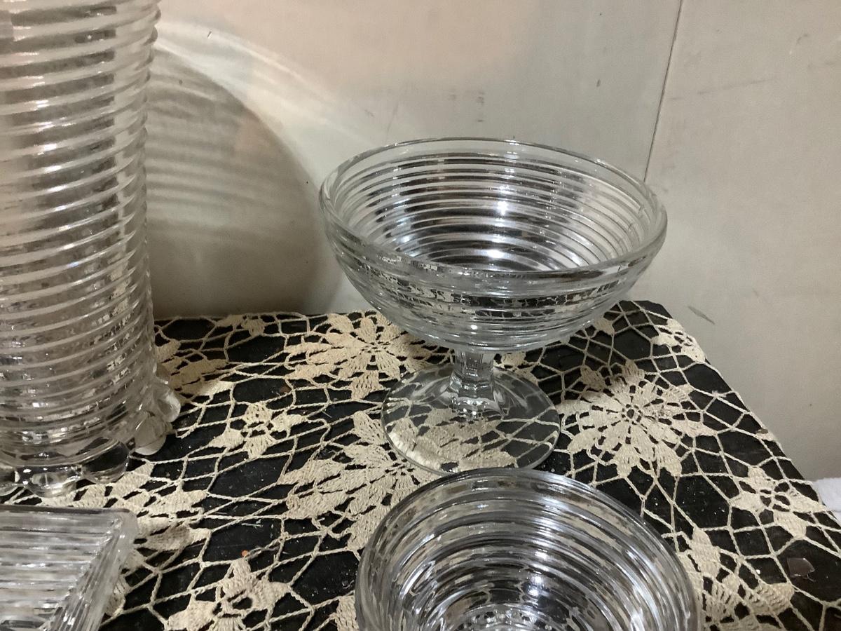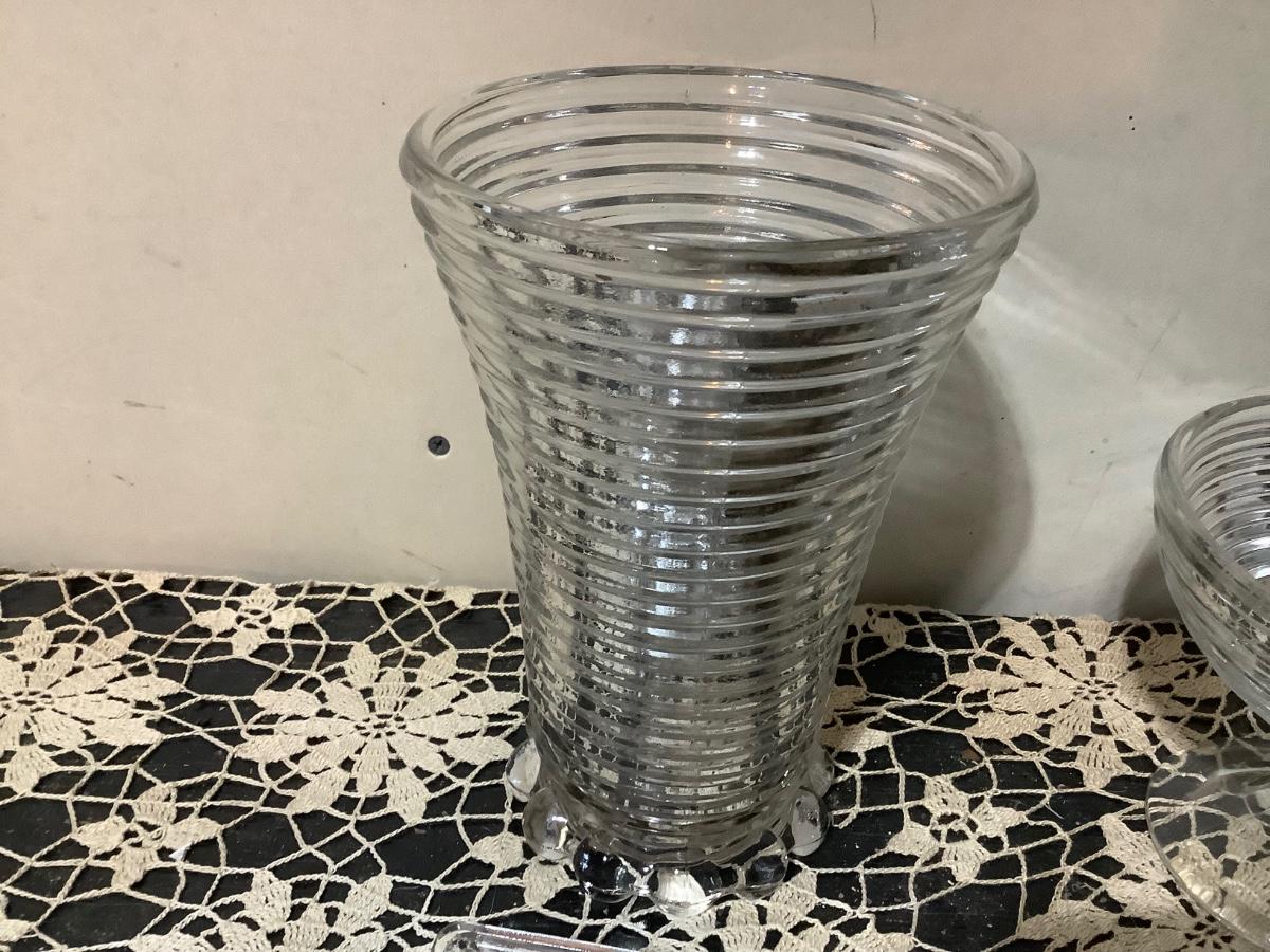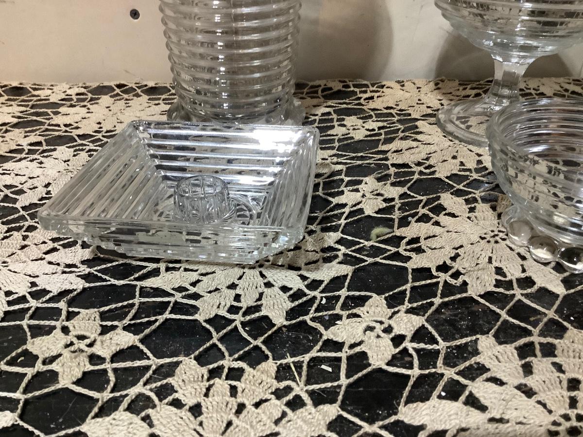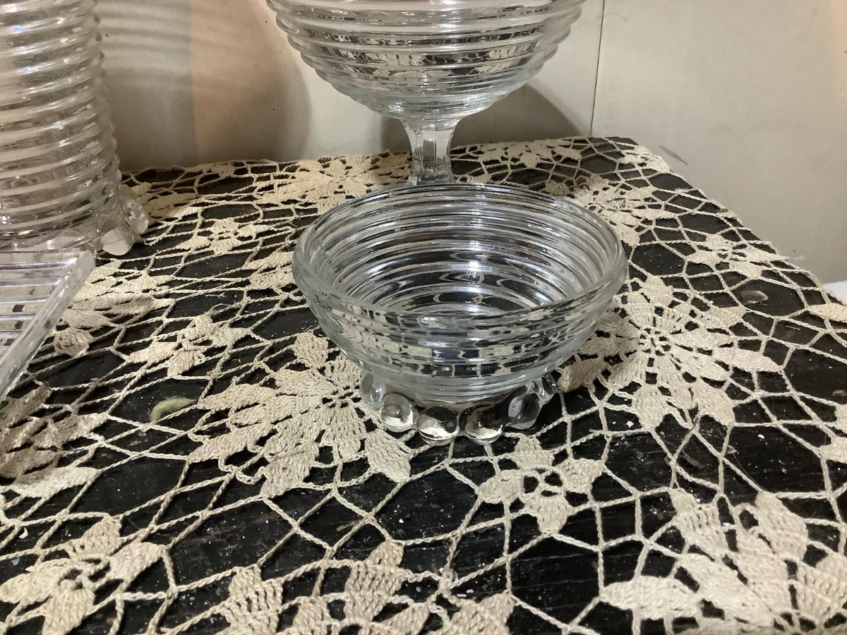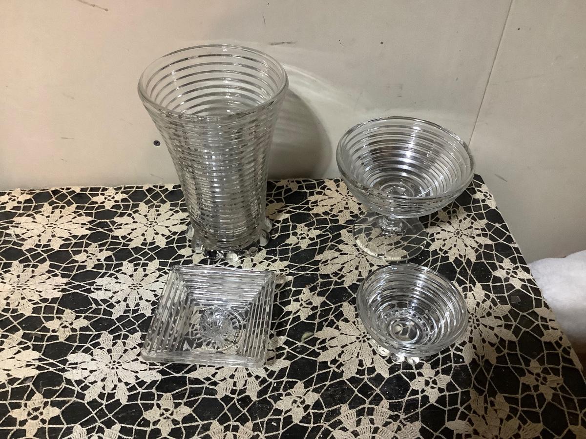 You get Heiser clear glass tall vase, footed bowl, sherbet, square dish.