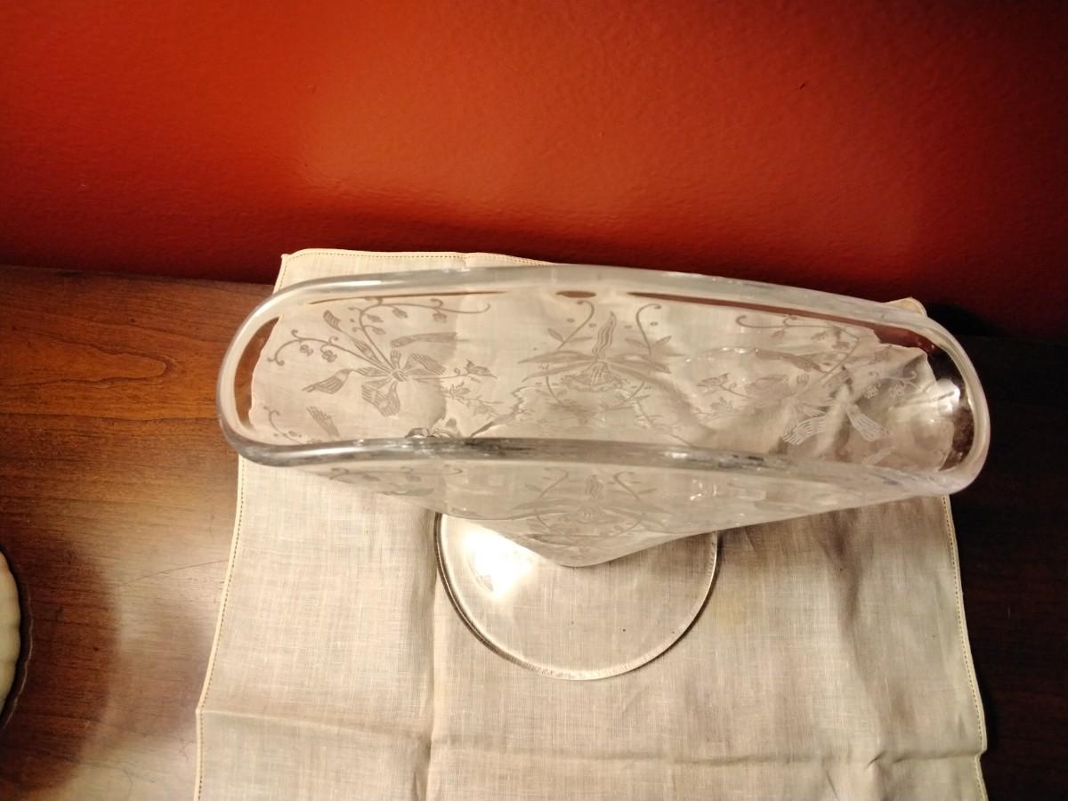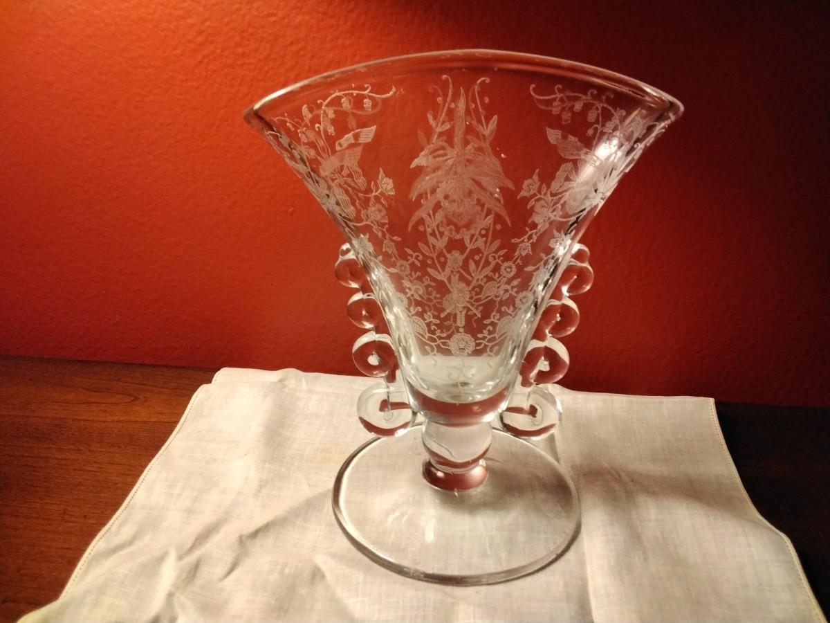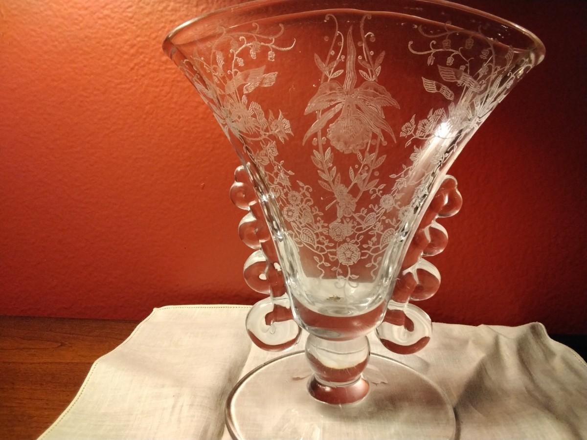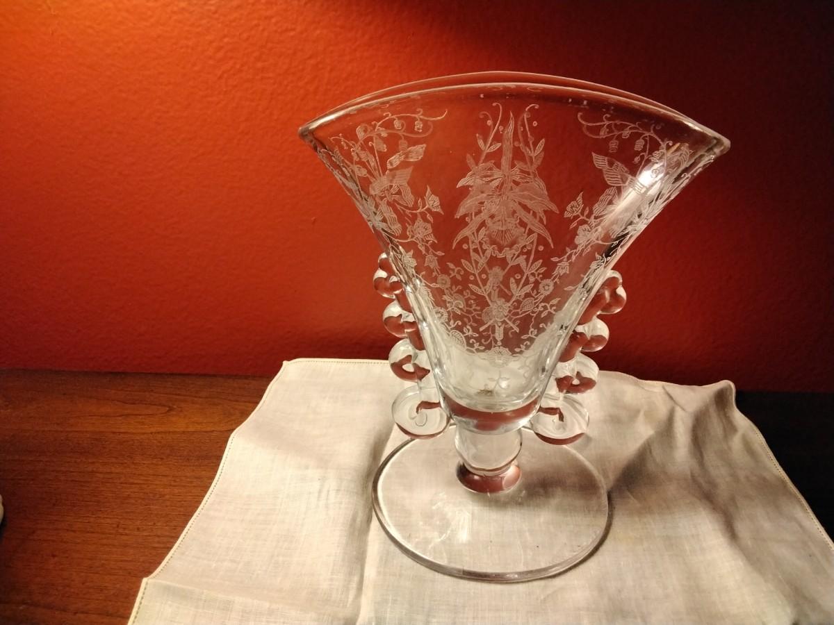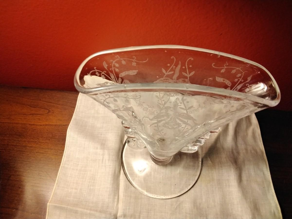 A.H. Heisey & Company of Newark, Ohio, first introduced the "Orchid" etched pattern in 1940 and it continued in production until the Heisey Company closed in 1957. During this time the "Orchid" pattern became Heisey's most popular etching. This lovely, as well as scarce, "Orchid" pattern vase is etched on a Lariat blank. It measures 7 1/2" in height, 4 1/4" across the base and 6" across the top. No cracks or chips or repairs of any kind. Tier 3.