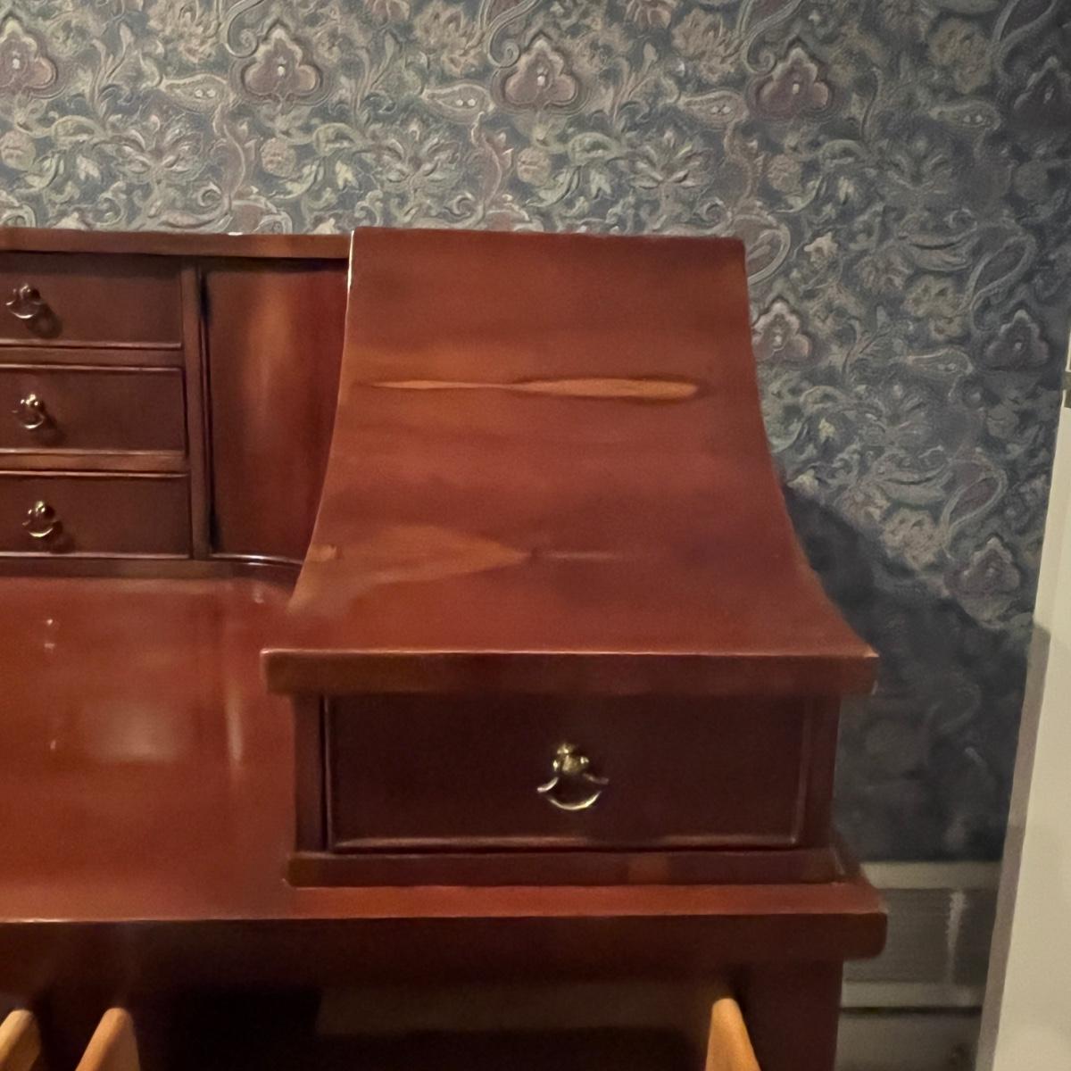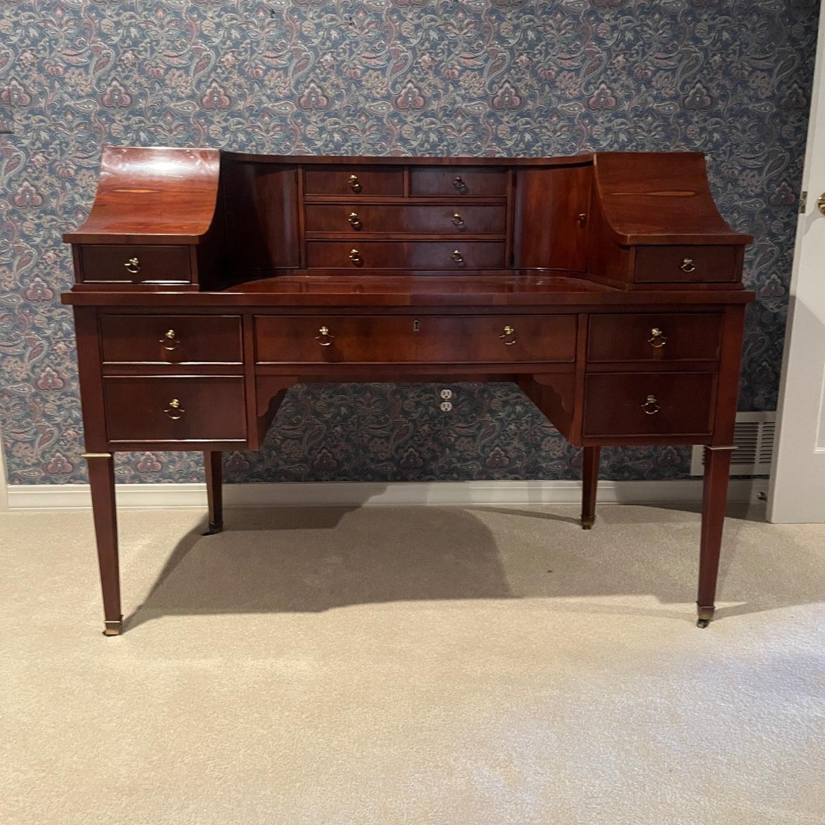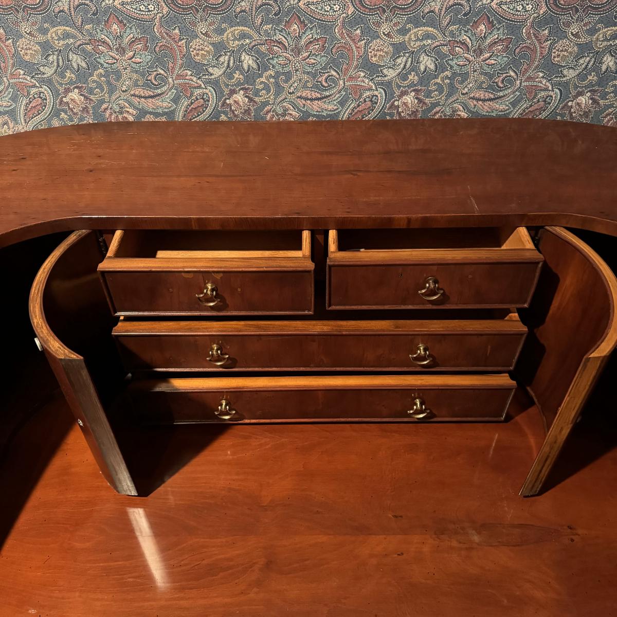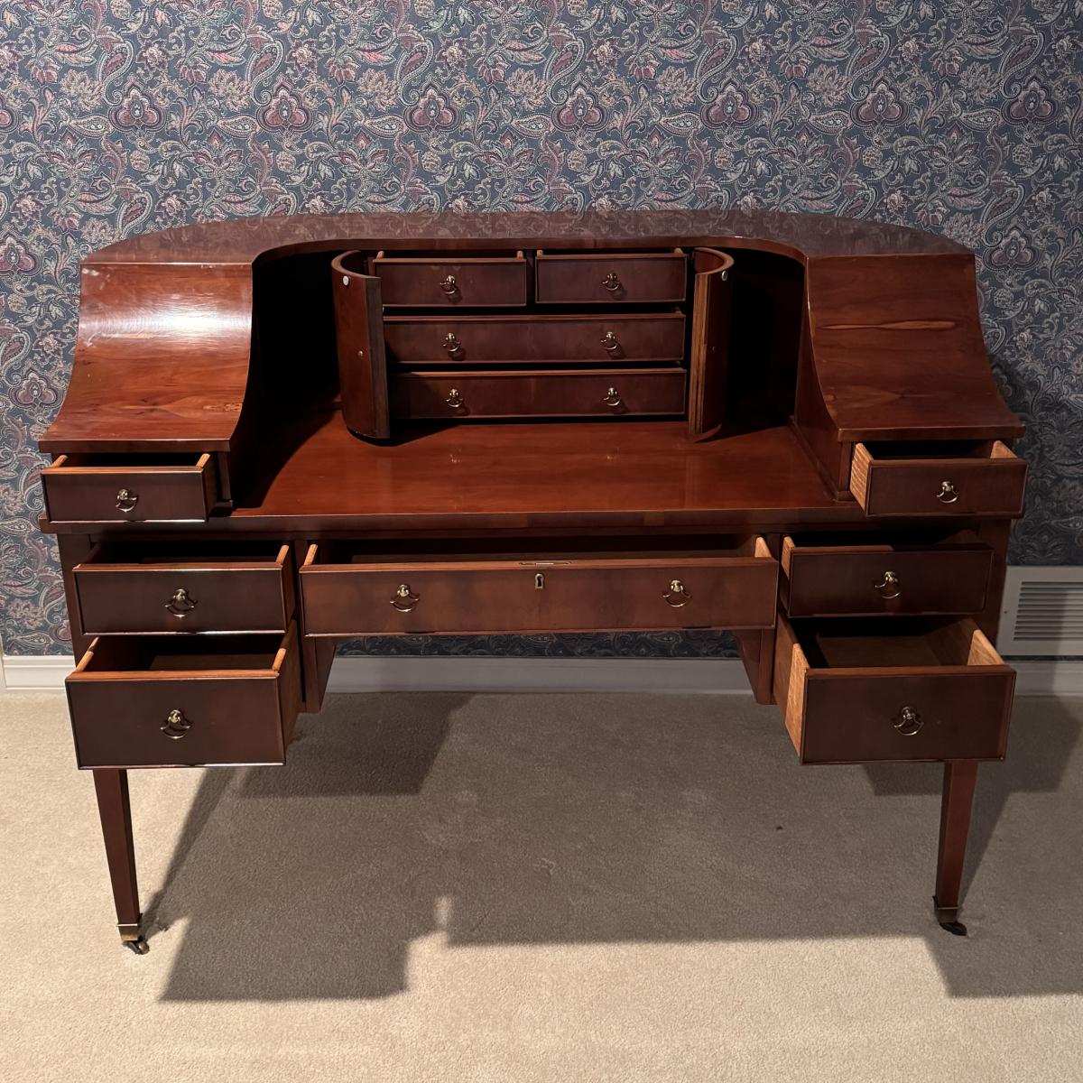 Lot includes a Hekman Carlton House style desk with 13 dovetailed drawers and two side compartments and casters on each leg. Desk measures 54” x 29” x 40”H. No key is included.