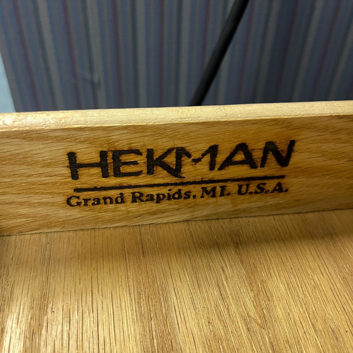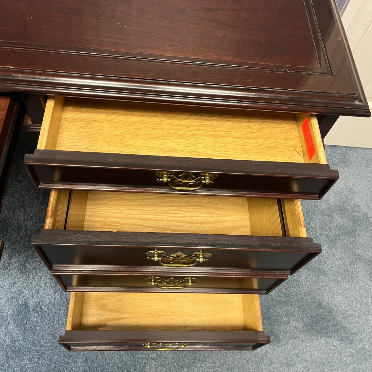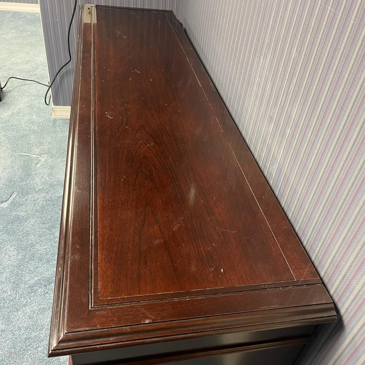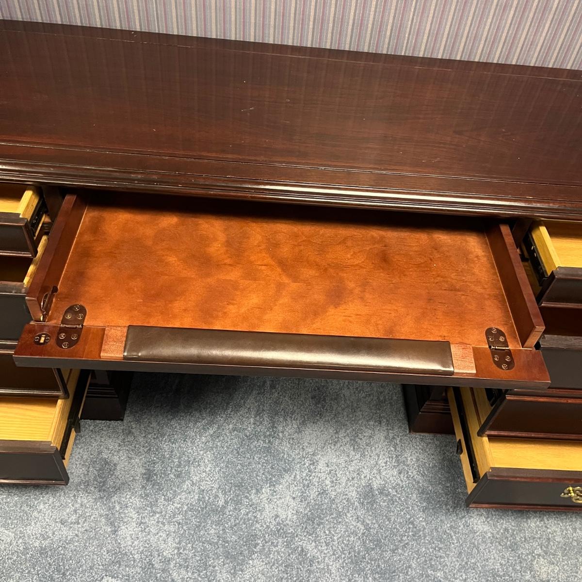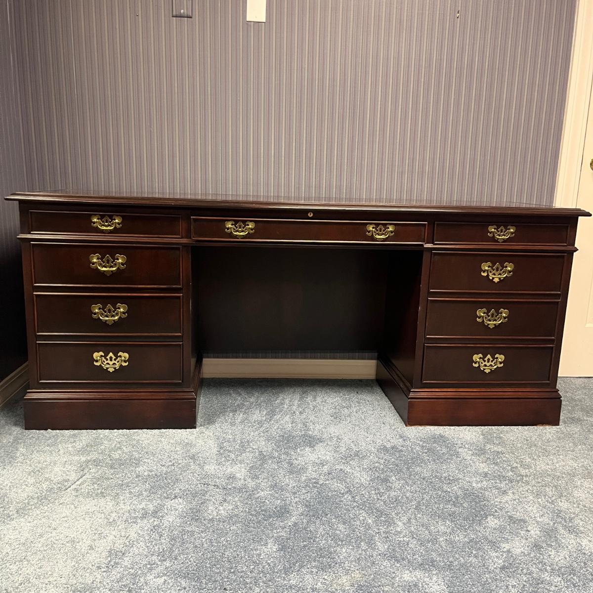 This Hekman solid wood computer desk has six dovetailed drawers with a keyboard tray. Two of the drawers are file sized. Also has a surge suppressor mounted on back of desk. Desk measures 72” x 19” x 30”H. Desk has scratches and nicks, see pictures.