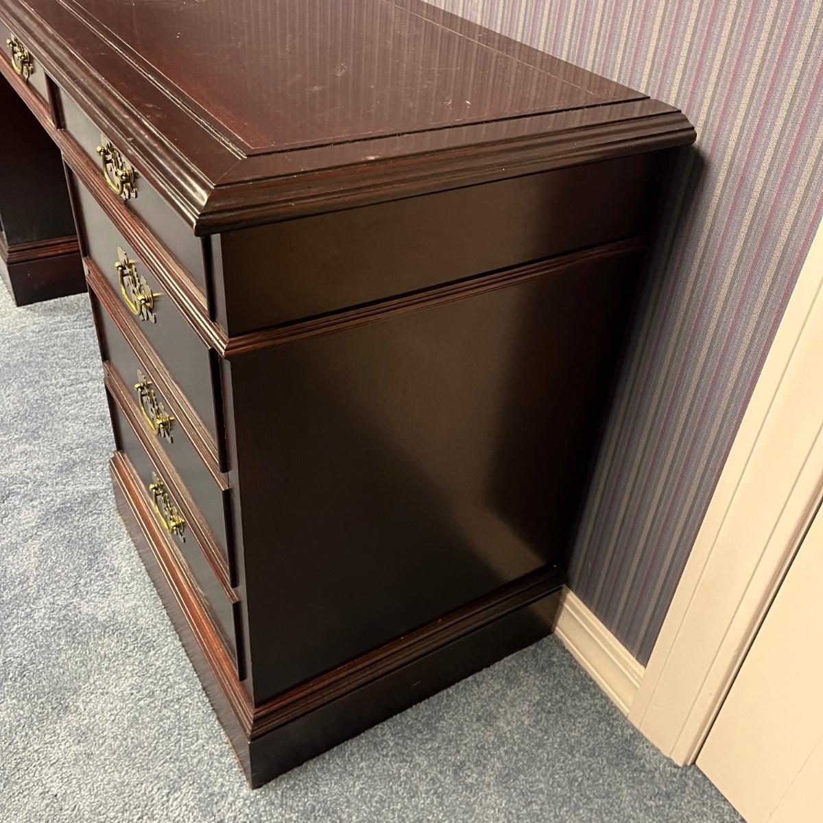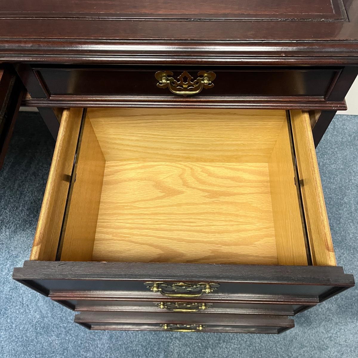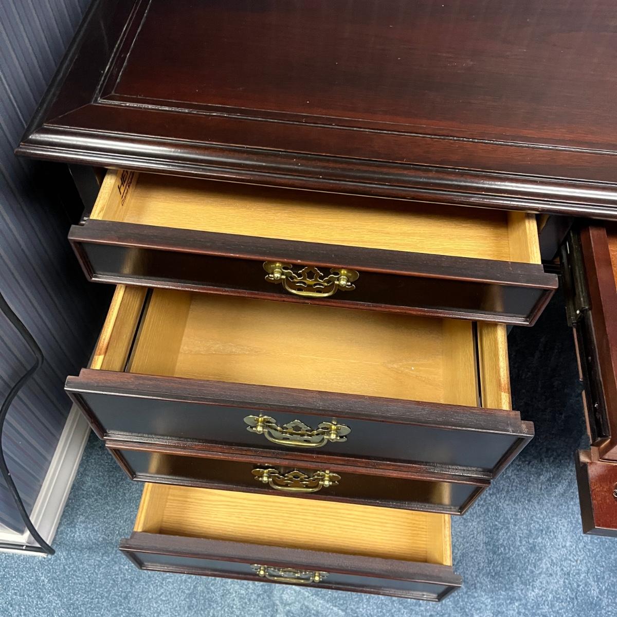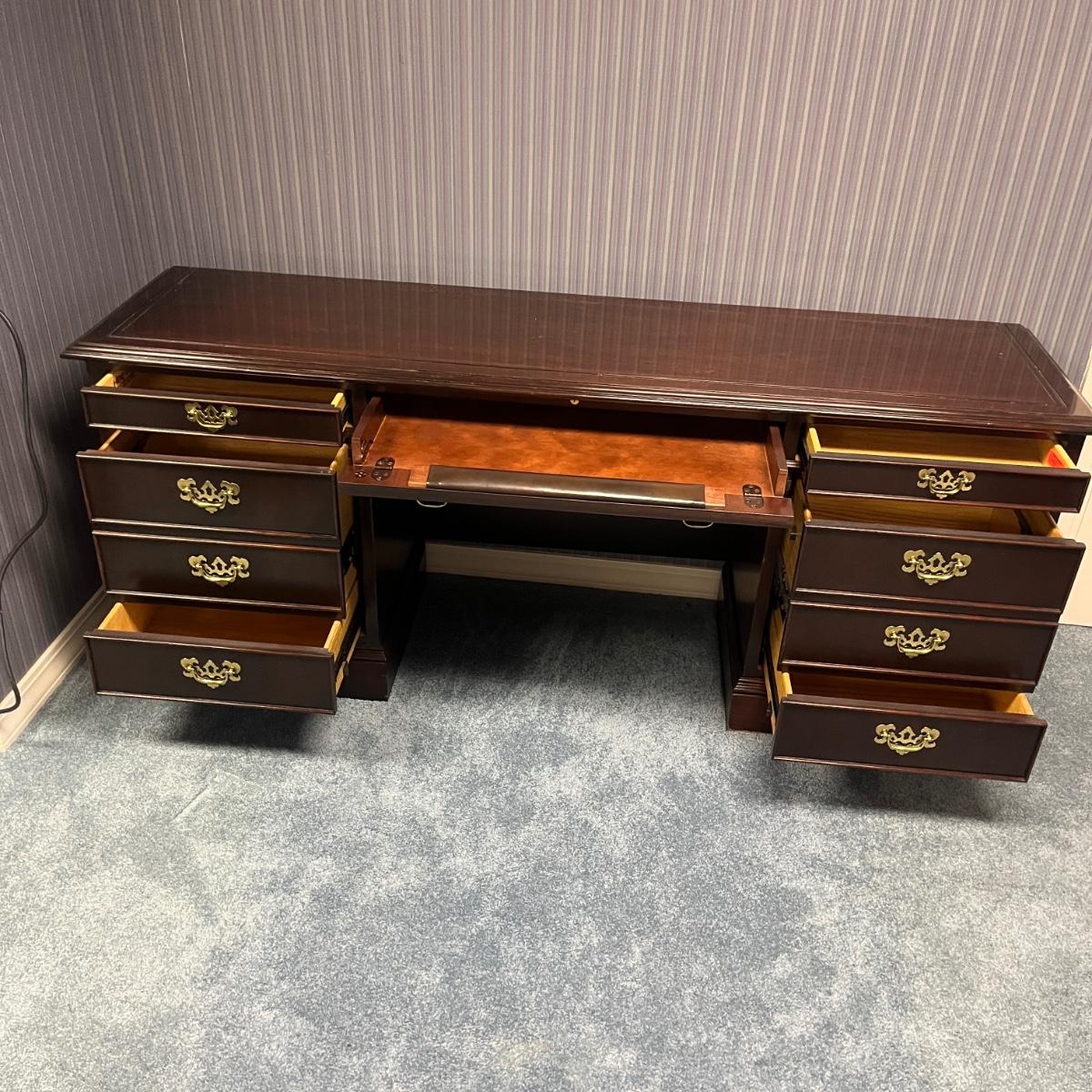 This Hekman solid wood computer desk has six dovetailed drawers with a keyboard tray. Two of the drawers are file sized. Also has a surge suppressor mounted on back of desk. Desk measures 72” x 19” x 30”H. Desk has scratches and nicks, see pictures.