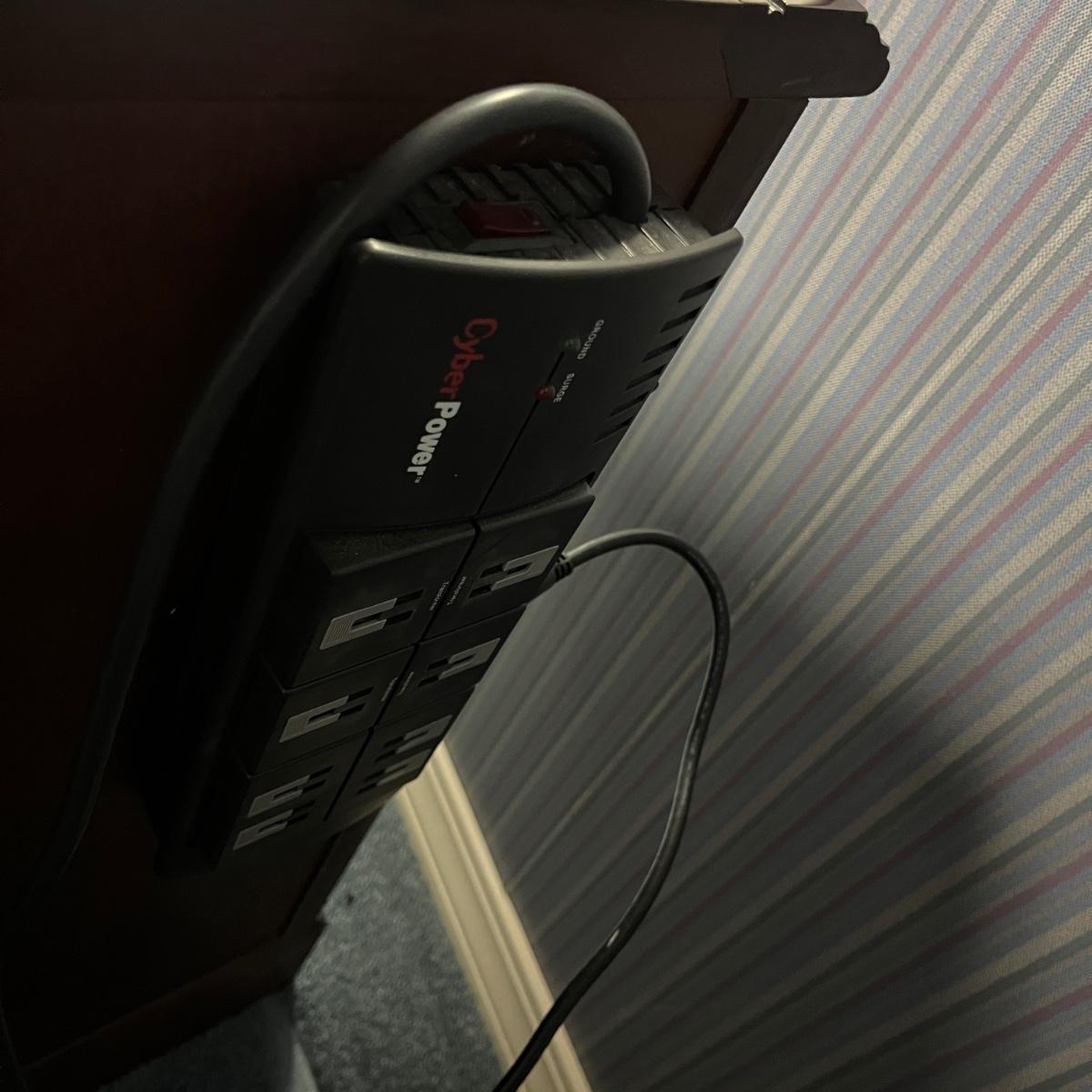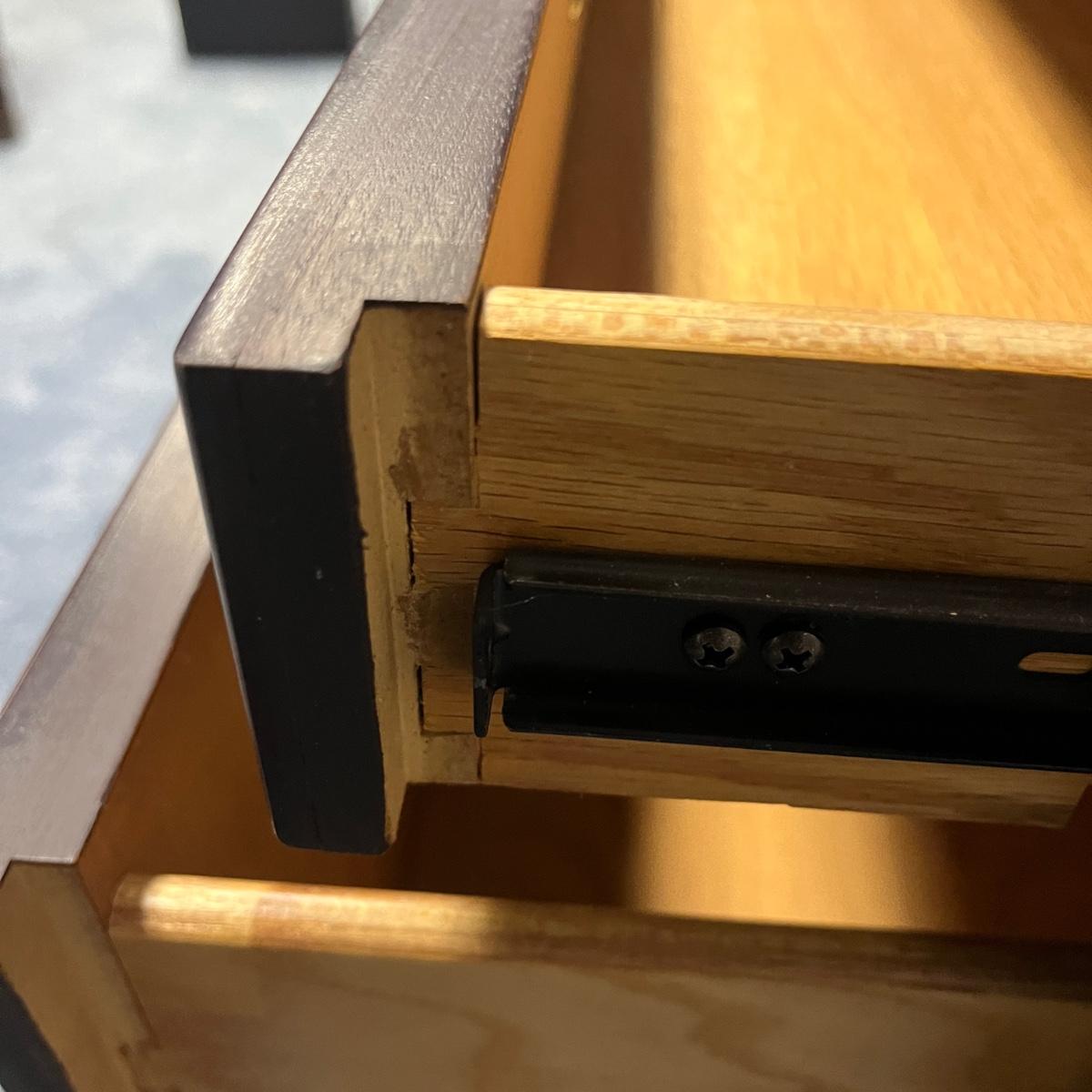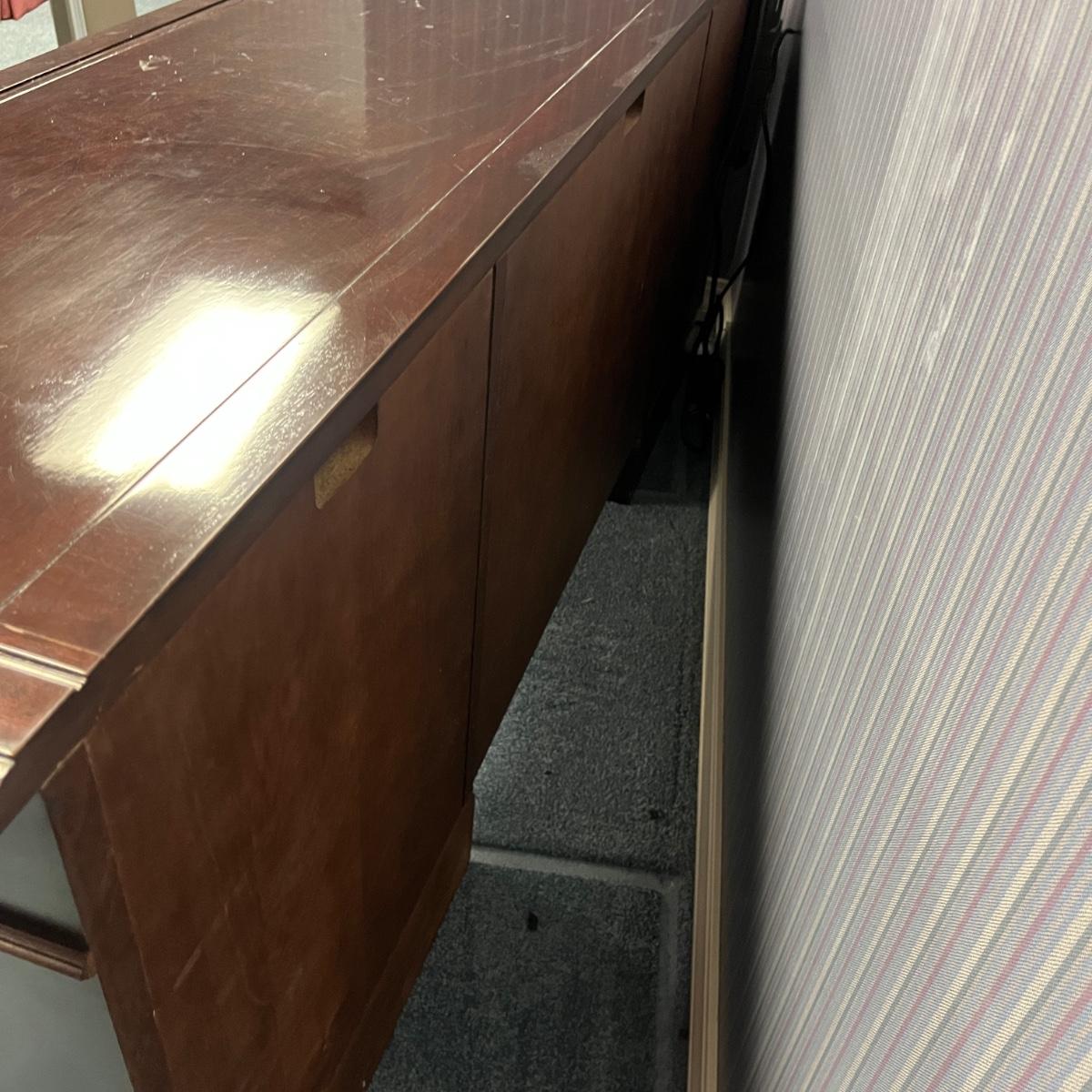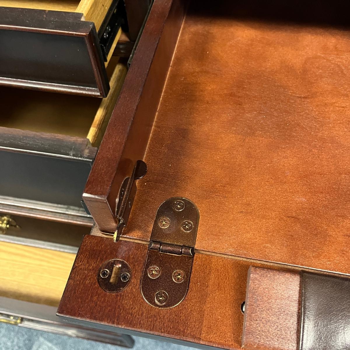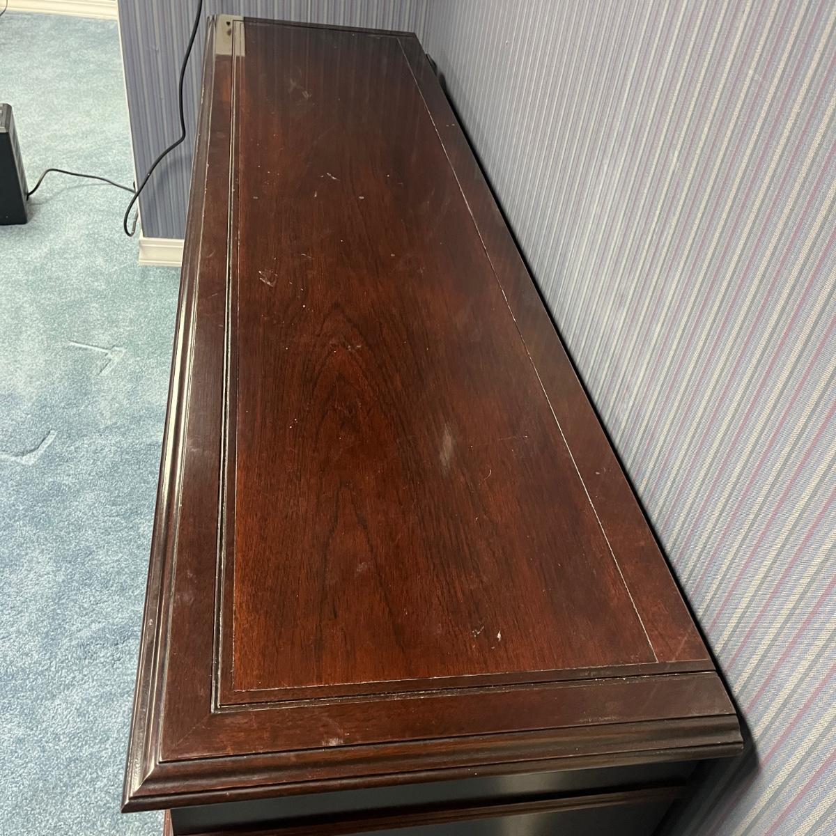 This Hekman solid wood computer desk has six dovetailed drawers with a keyboard tray. Two of the drawers are file sized. Also has a surge suppressor mounted on back of desk. Desk measures 72” x 19” x 30”H. Desk has scratches and nicks, see pictures.