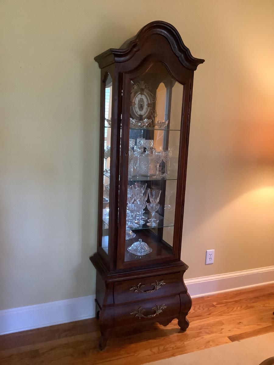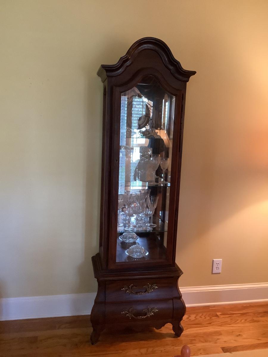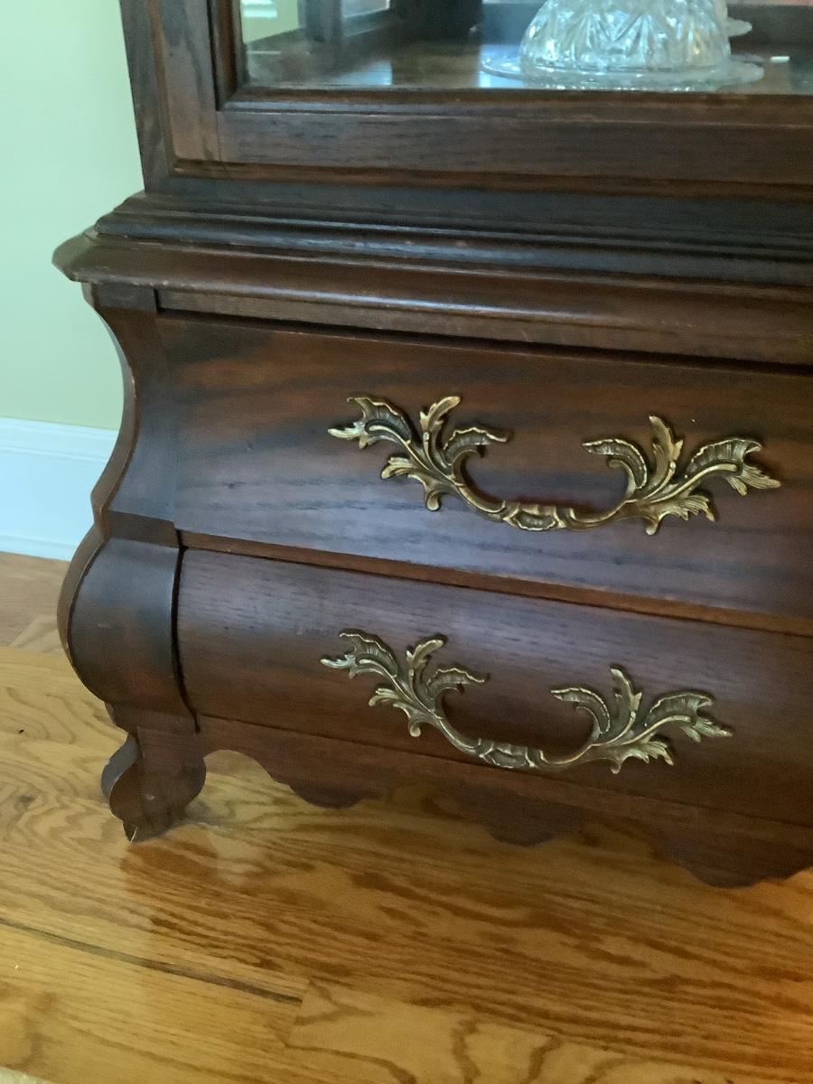 Hekman curio display cabinet with 2 drawers, antique brass handles, lighted - does need a new latch
